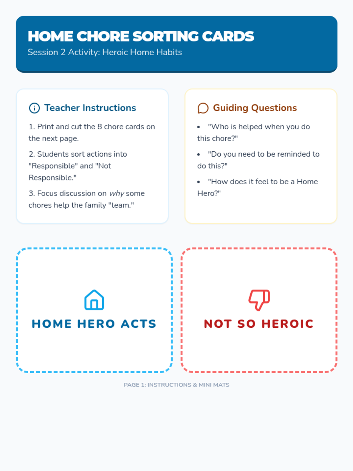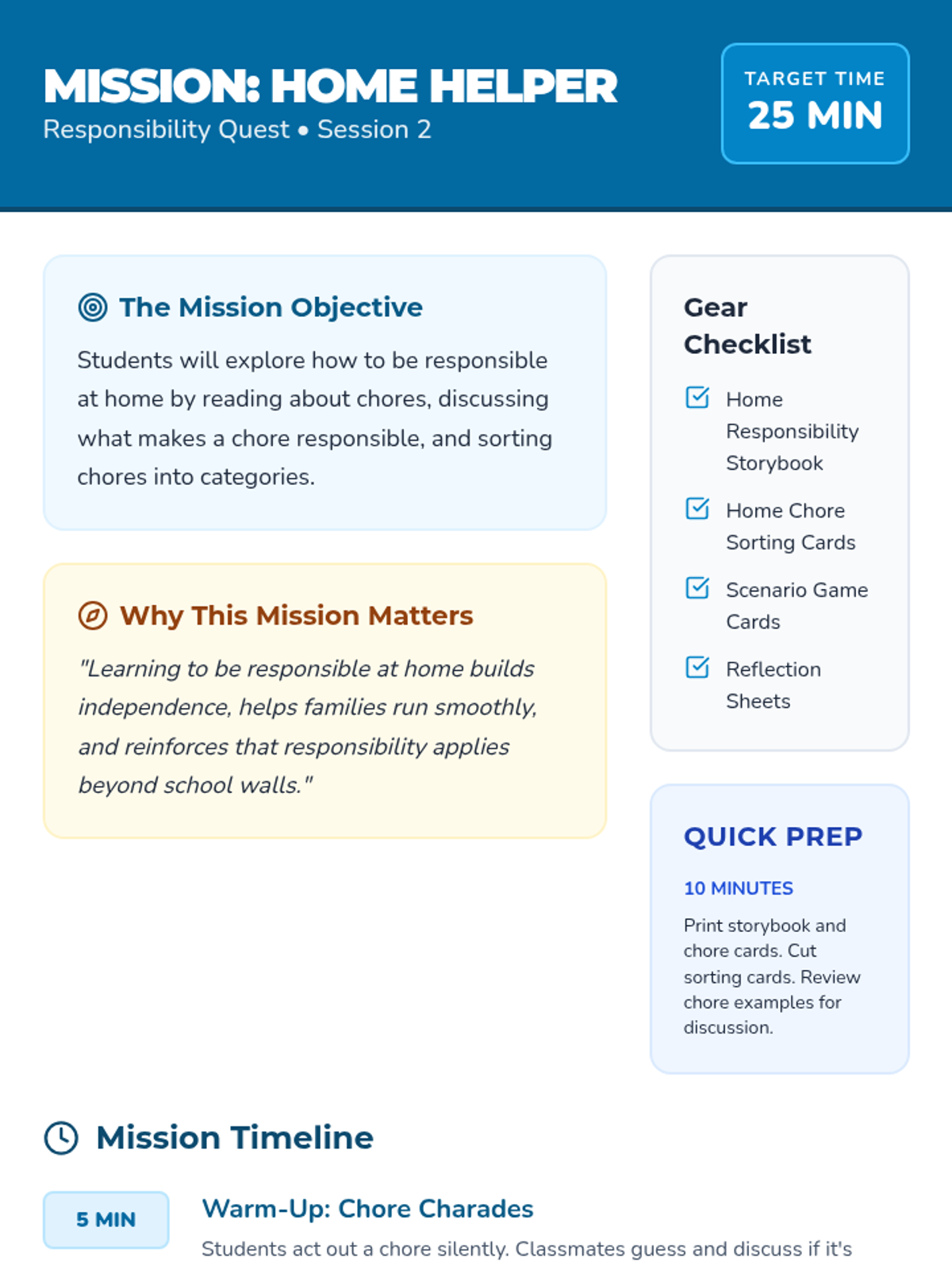 Students focus on responsibility at home, learning about chores and how helping their family builds independence and trust.