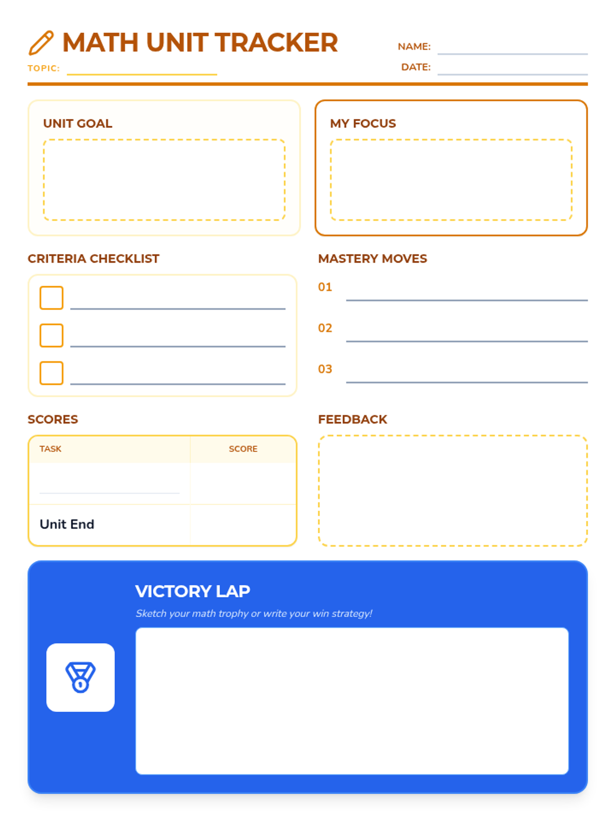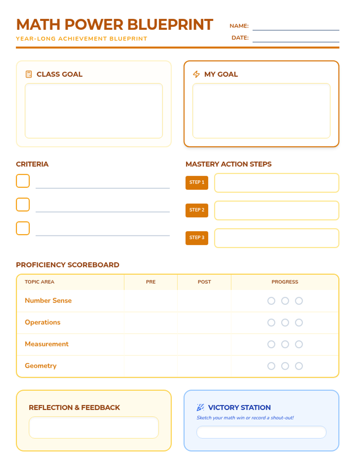 Math goal-setting templates for tracking yearly fluency and unit-level conceptual understanding.