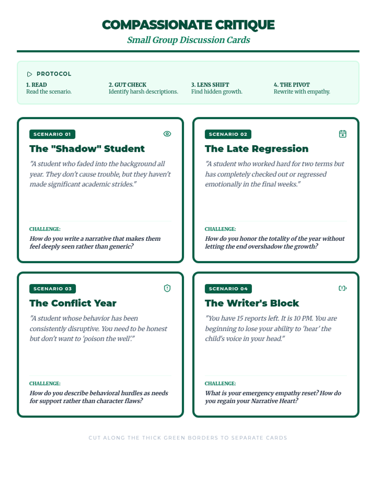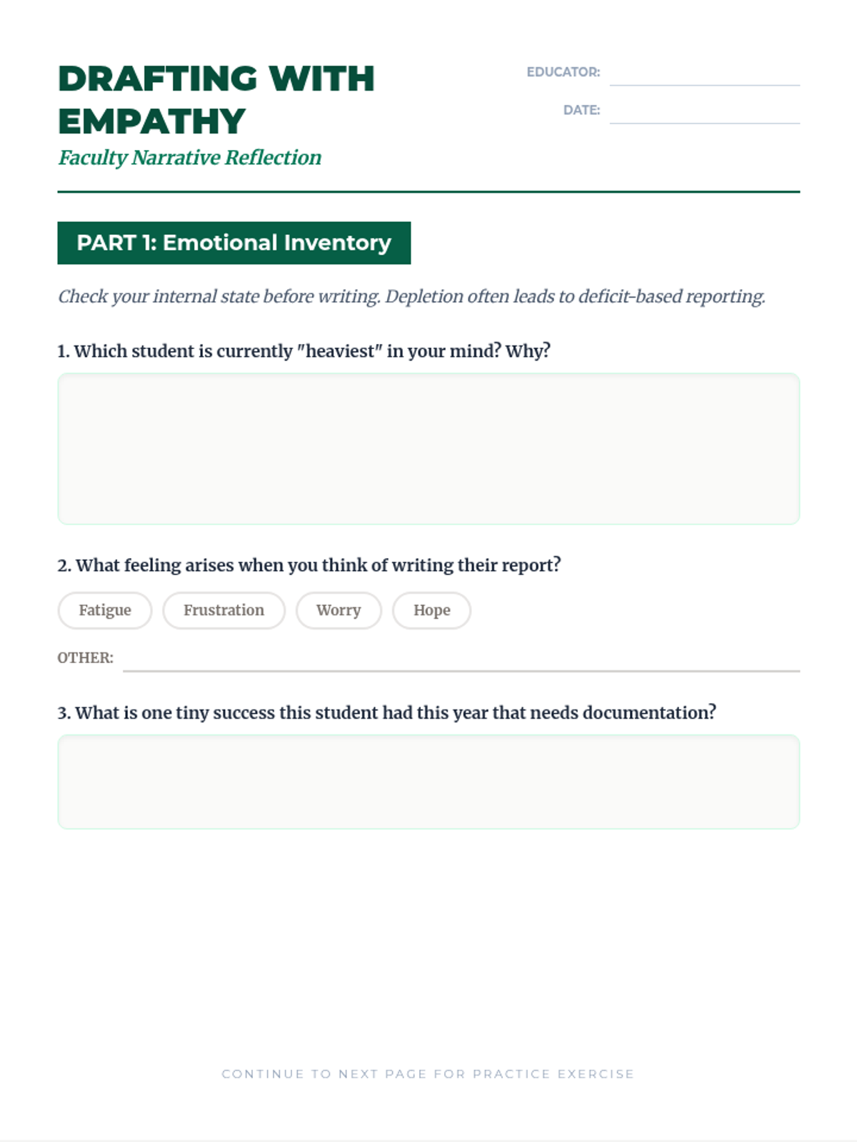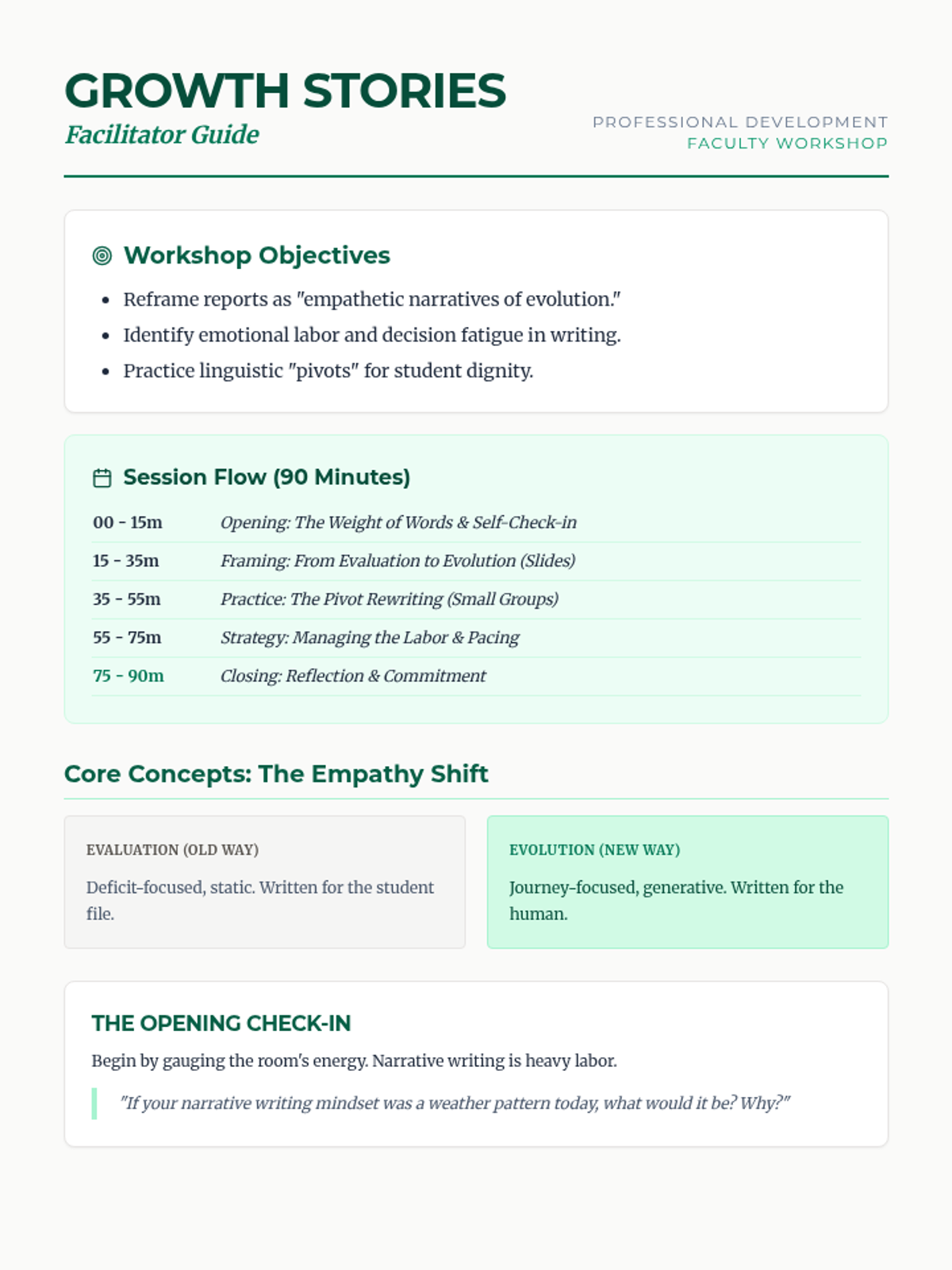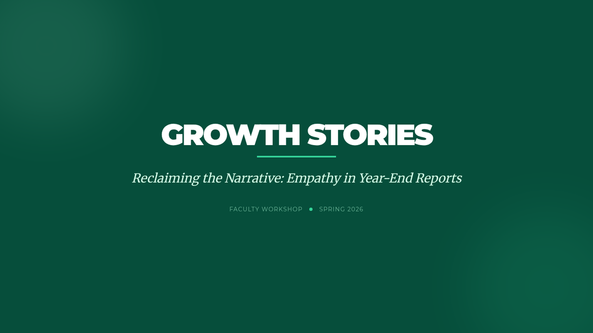 A supportive faculty workshop focused on reframing end-of-year narrative reports as empathetic documentations of student growth while providing strategies to manage the emotional labor of the writing process.