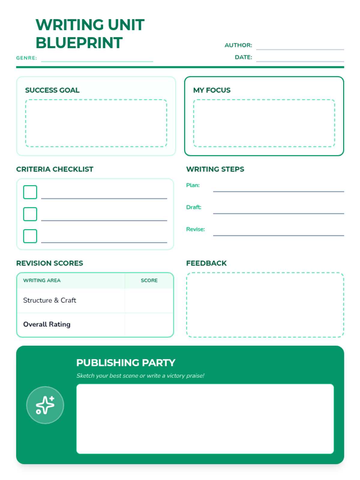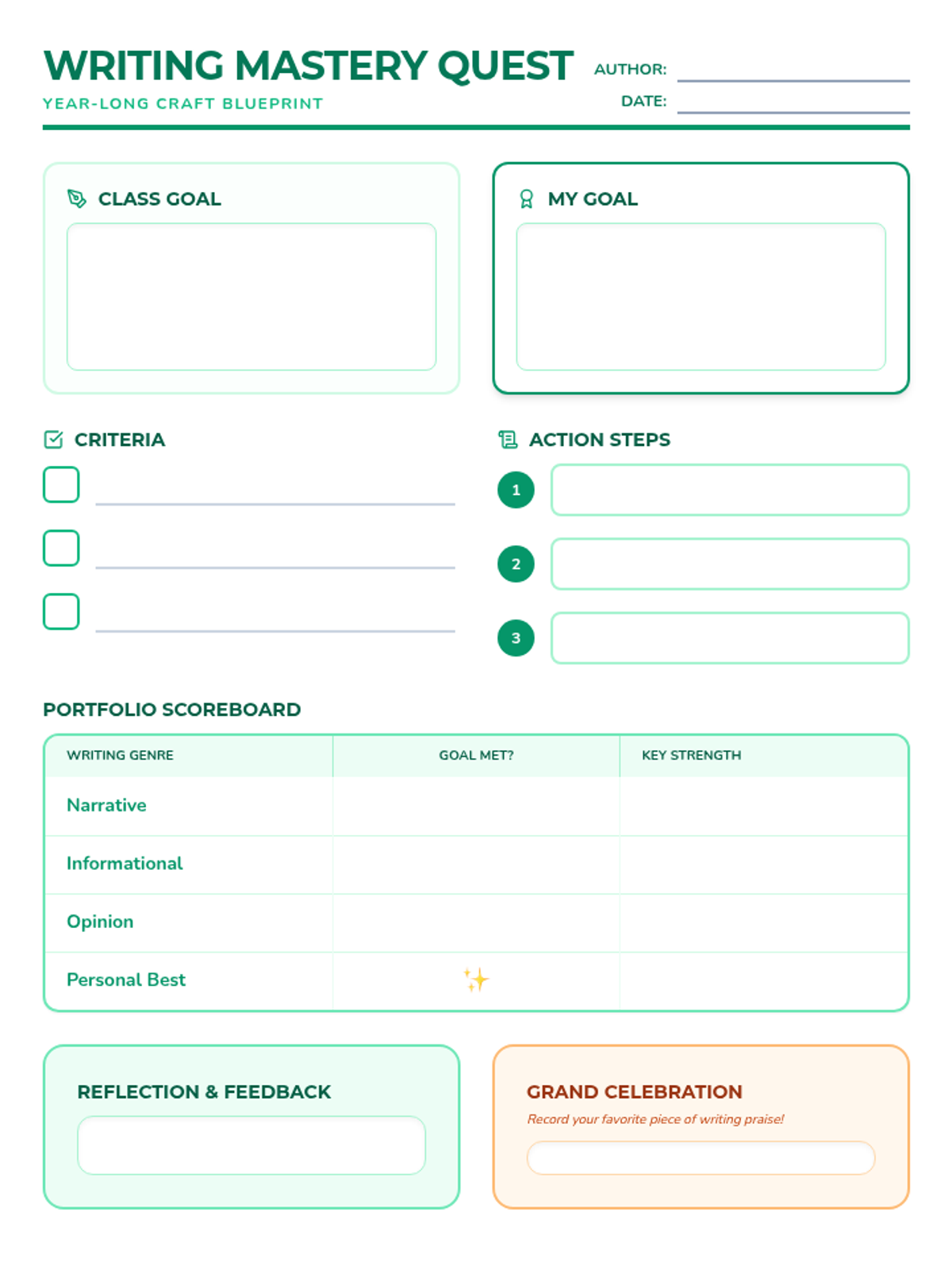 Tools for students to track their writing progress, from yearly craft goals to specific unit genres.