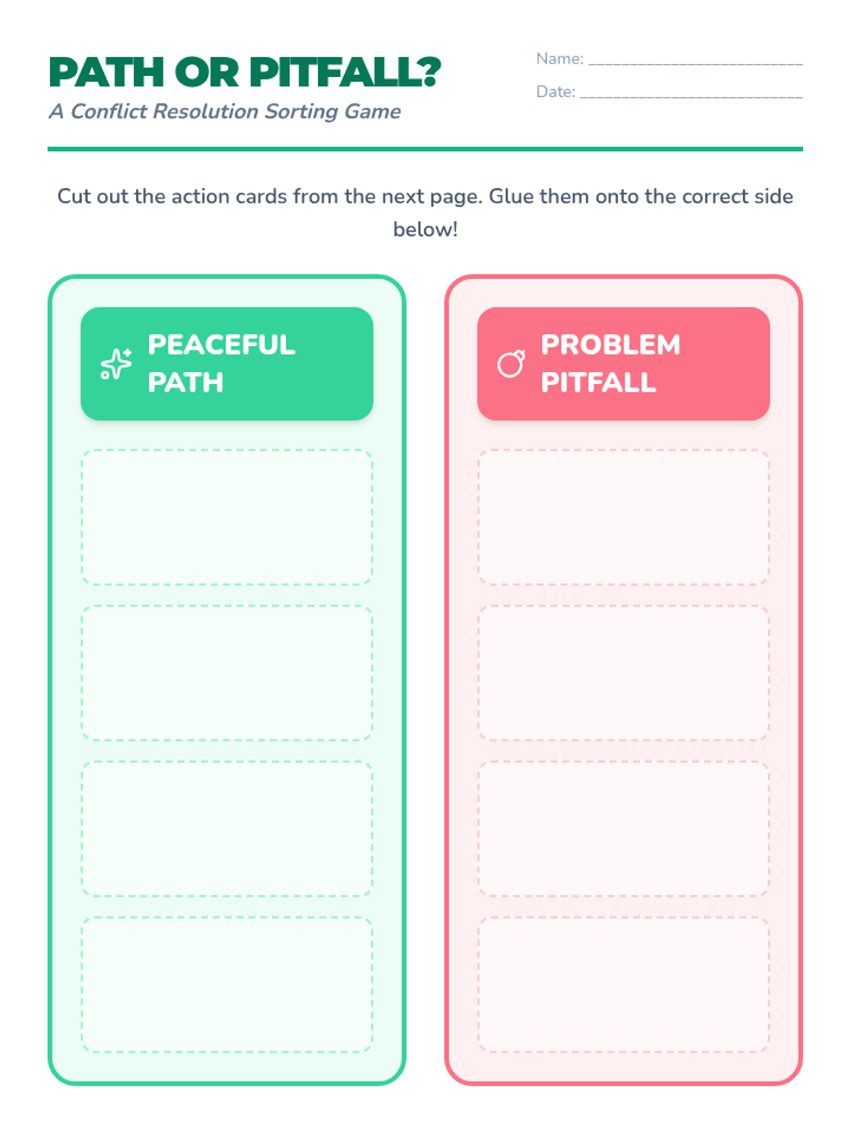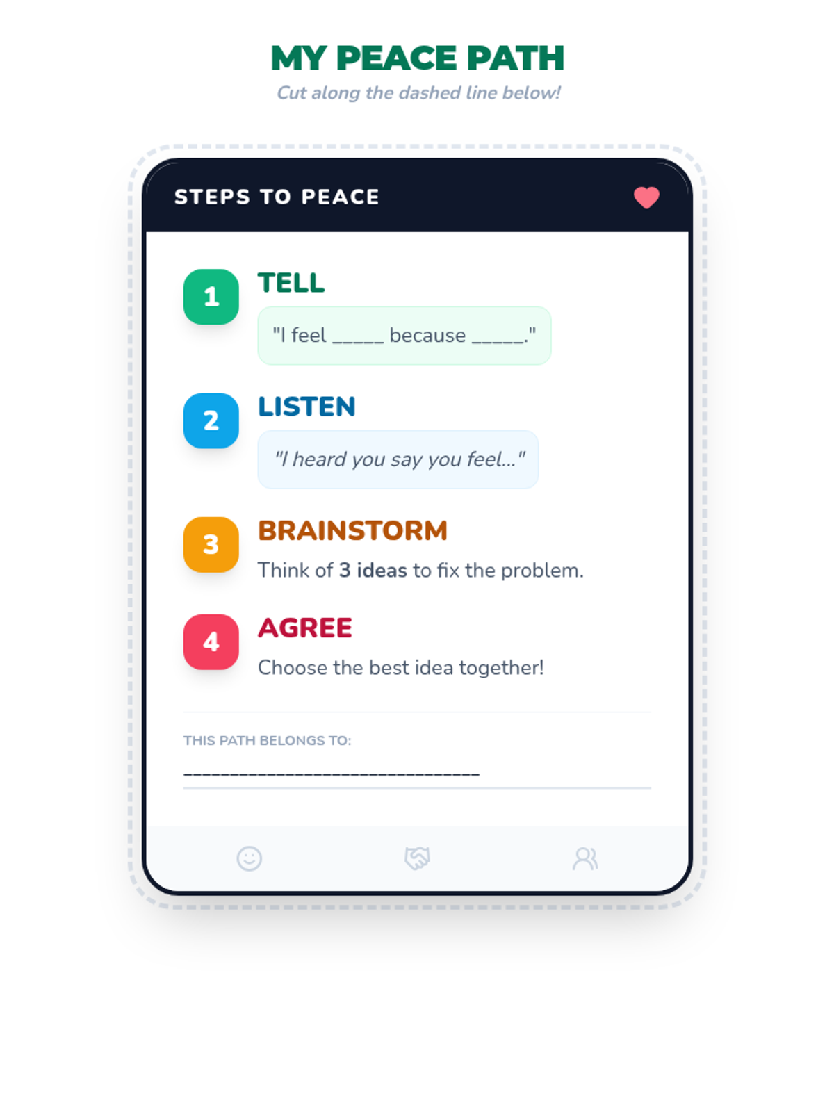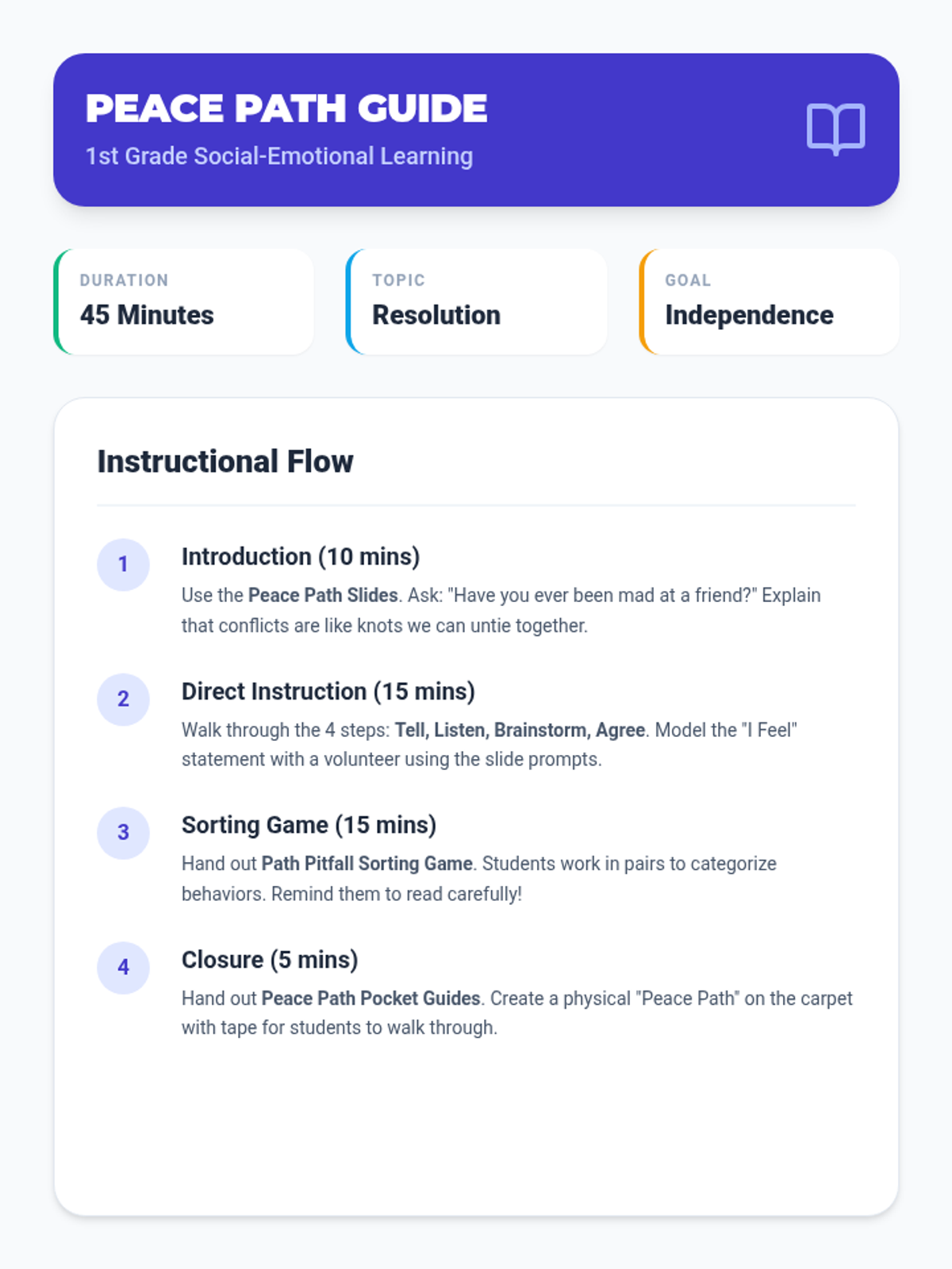 A social-emotional learning lesson for 1st graders focused on the Peace Path strategy for resolving conflicts independently. Includes interactive slides, a sorting game, and teacher support materials.