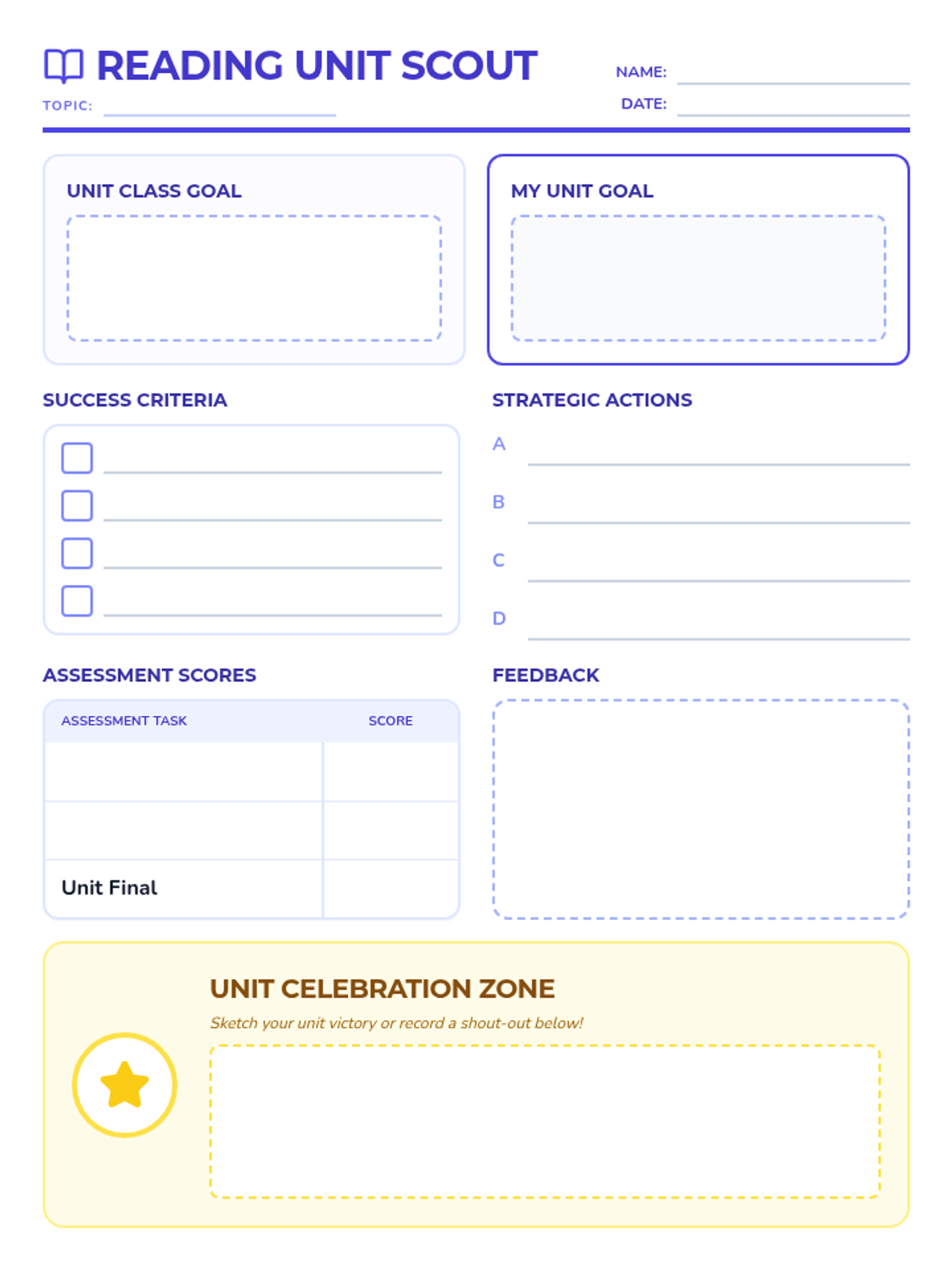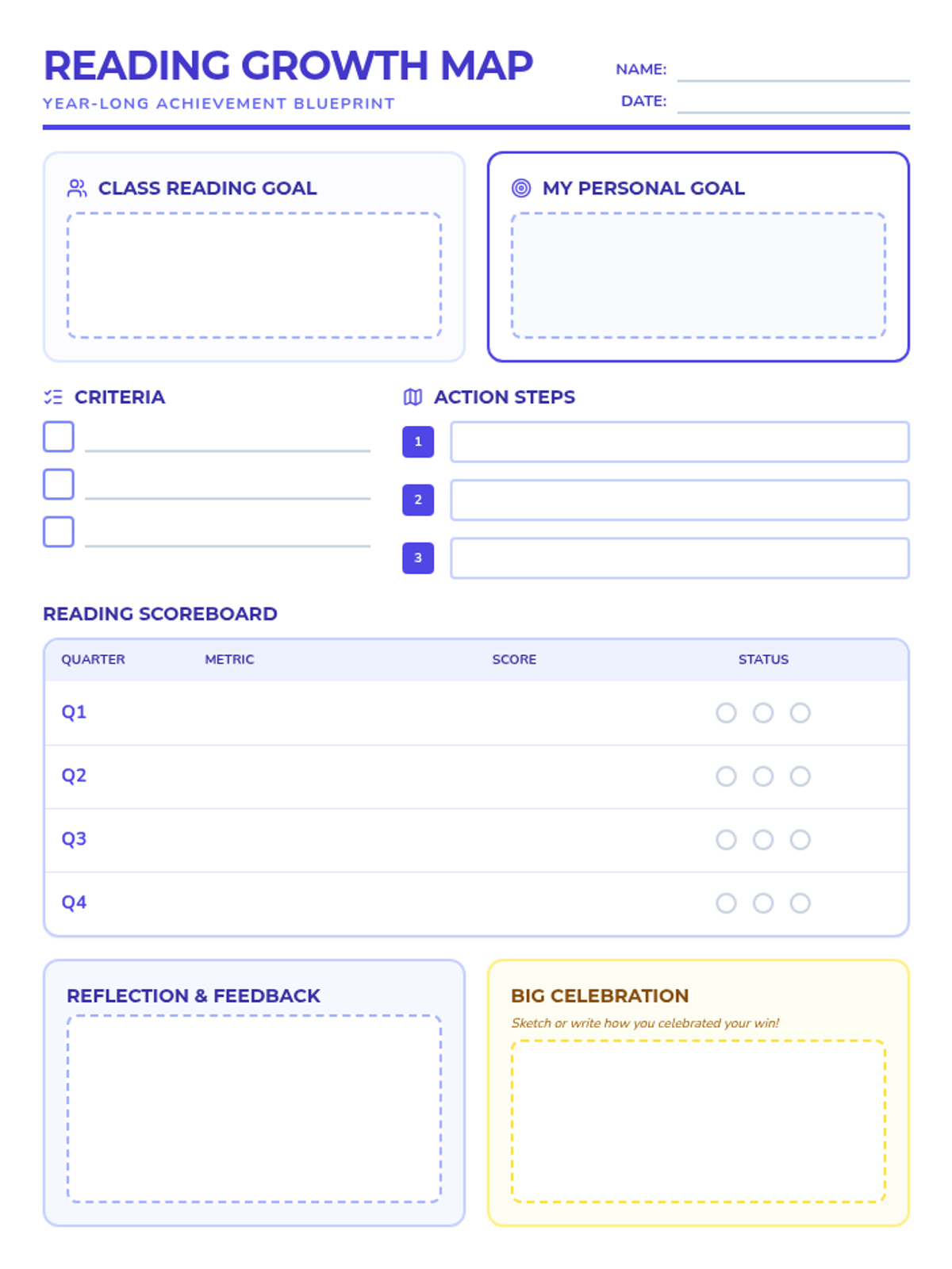 Goal-tracking resources for reading literacy, focusing on yearly growth and unit-specific objectives.