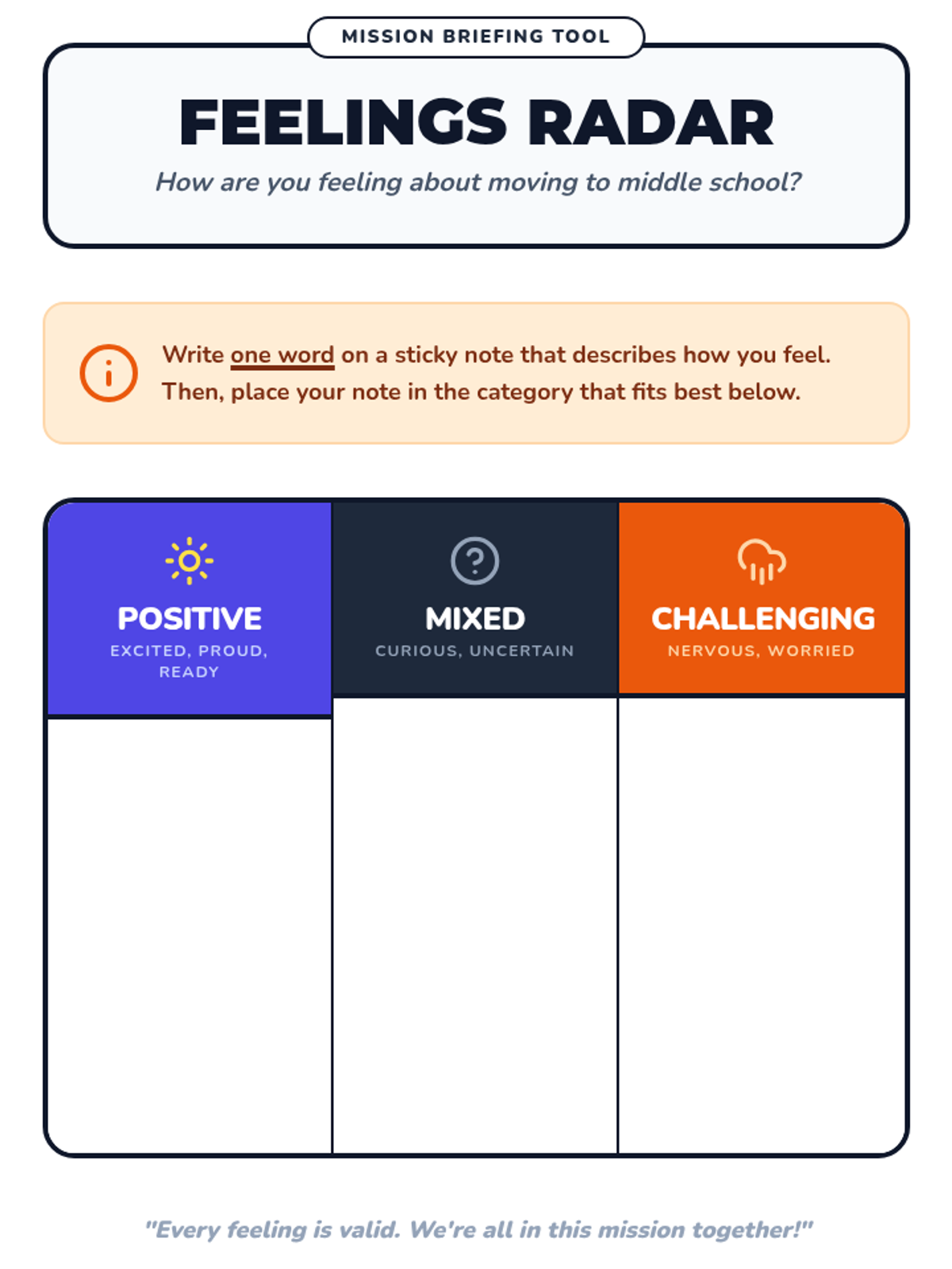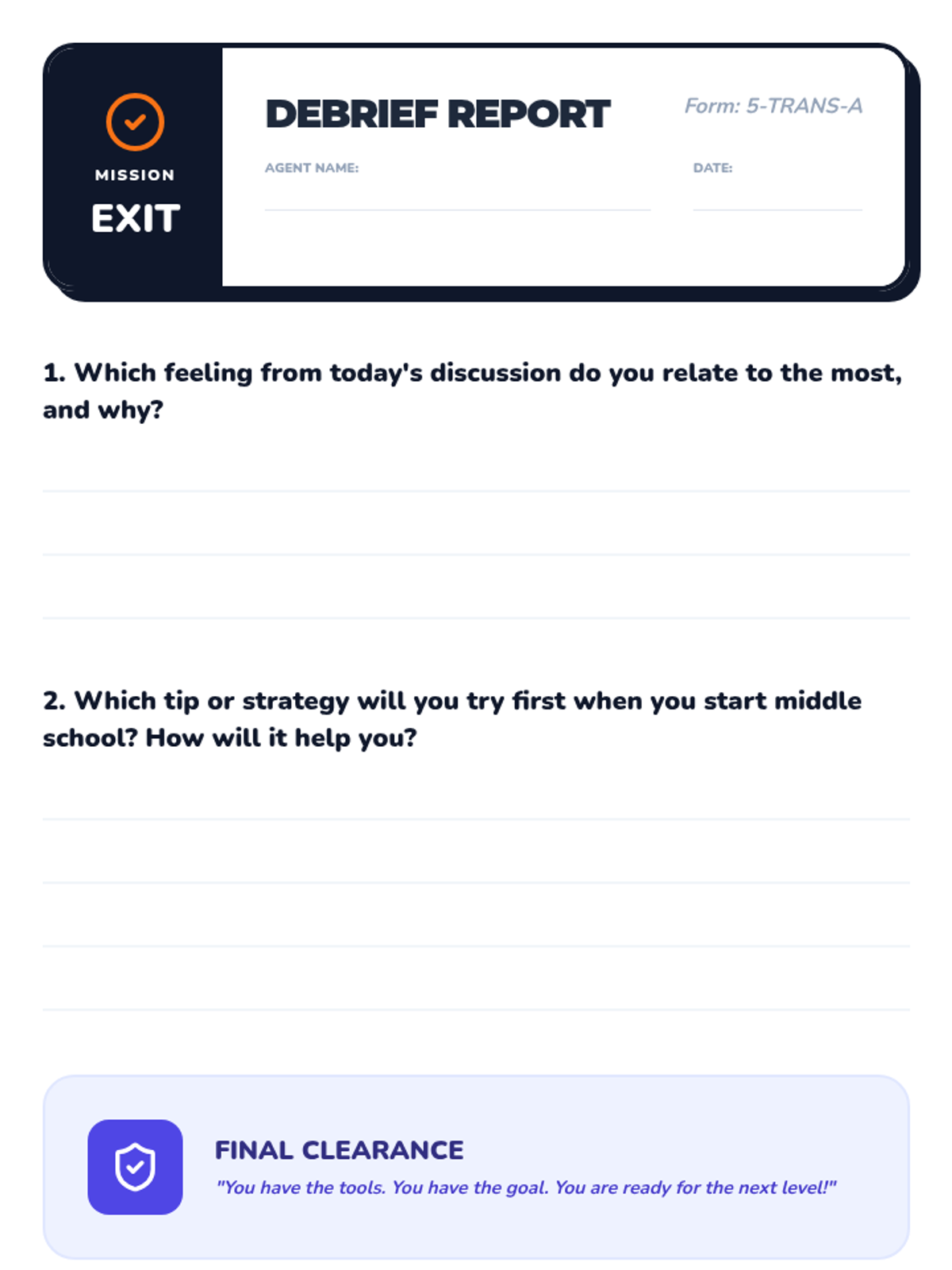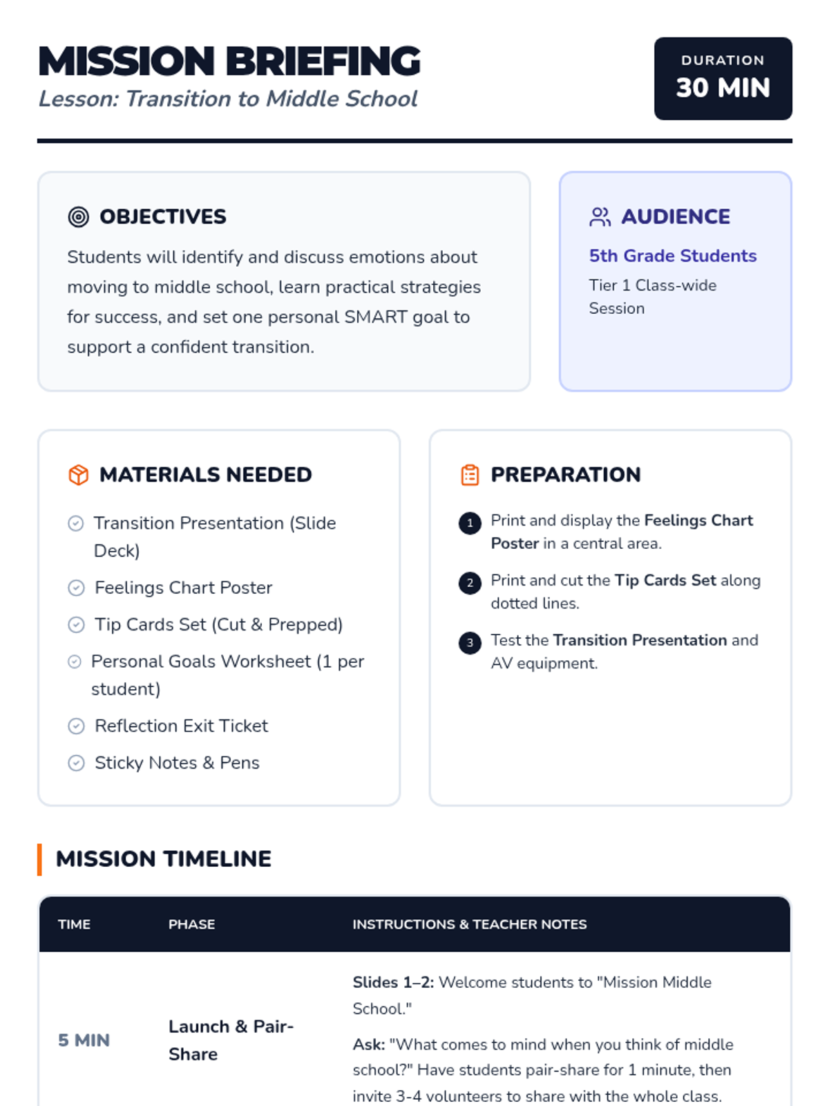 A 30-minute Tier 1 lesson for 5th graders to explore their feelings, learn practical tips, and set SMART goals for their transition to middle school.