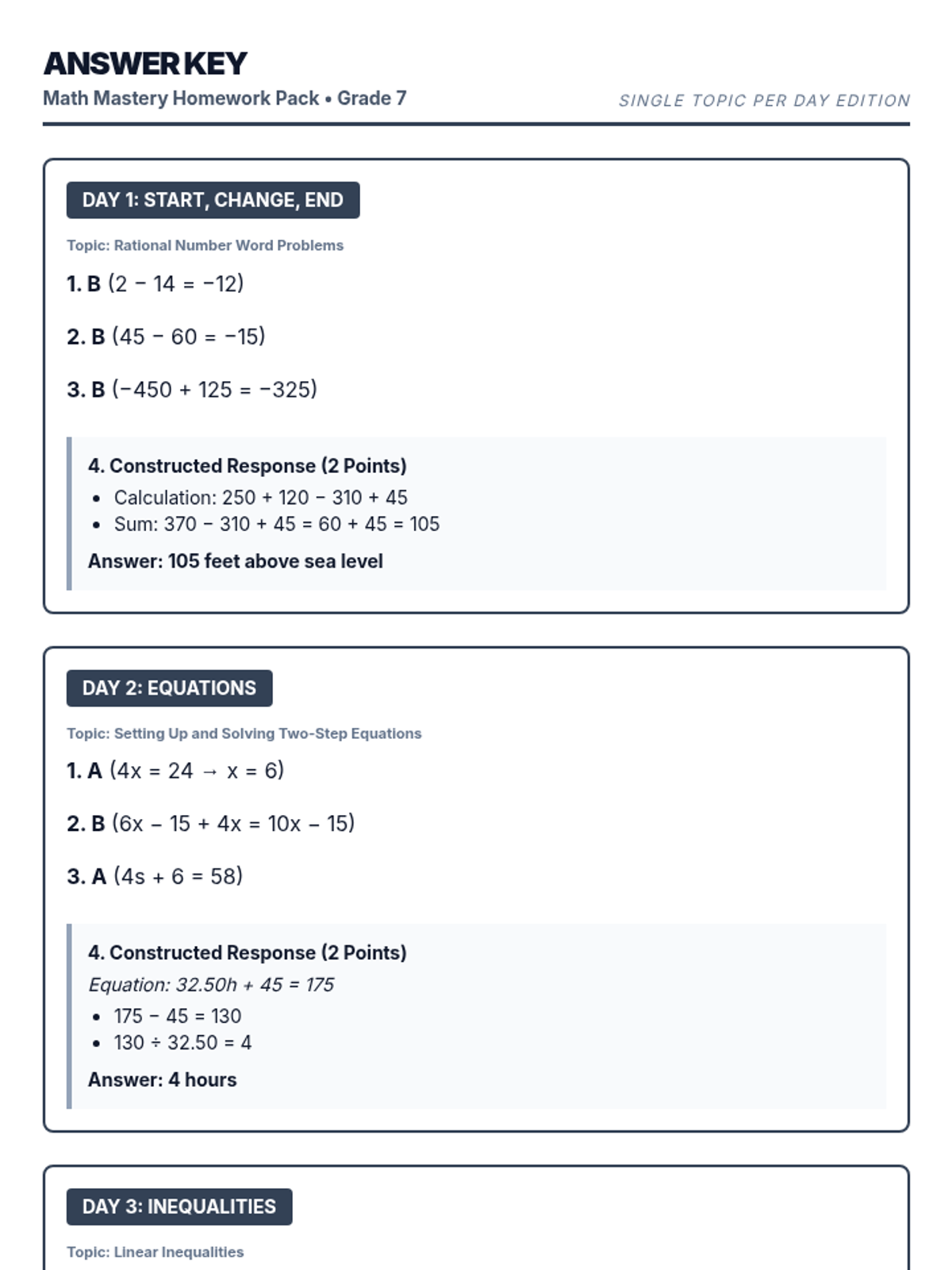 A comprehensive set of 7th-grade math homework assignments designed to mirror the NYS Mathematics Test format. Each nightly sheet covers key standards including Start-Change-End word problems, evaluating equations and inequalities, and identifying the constant of proportionality from graphs and tables.