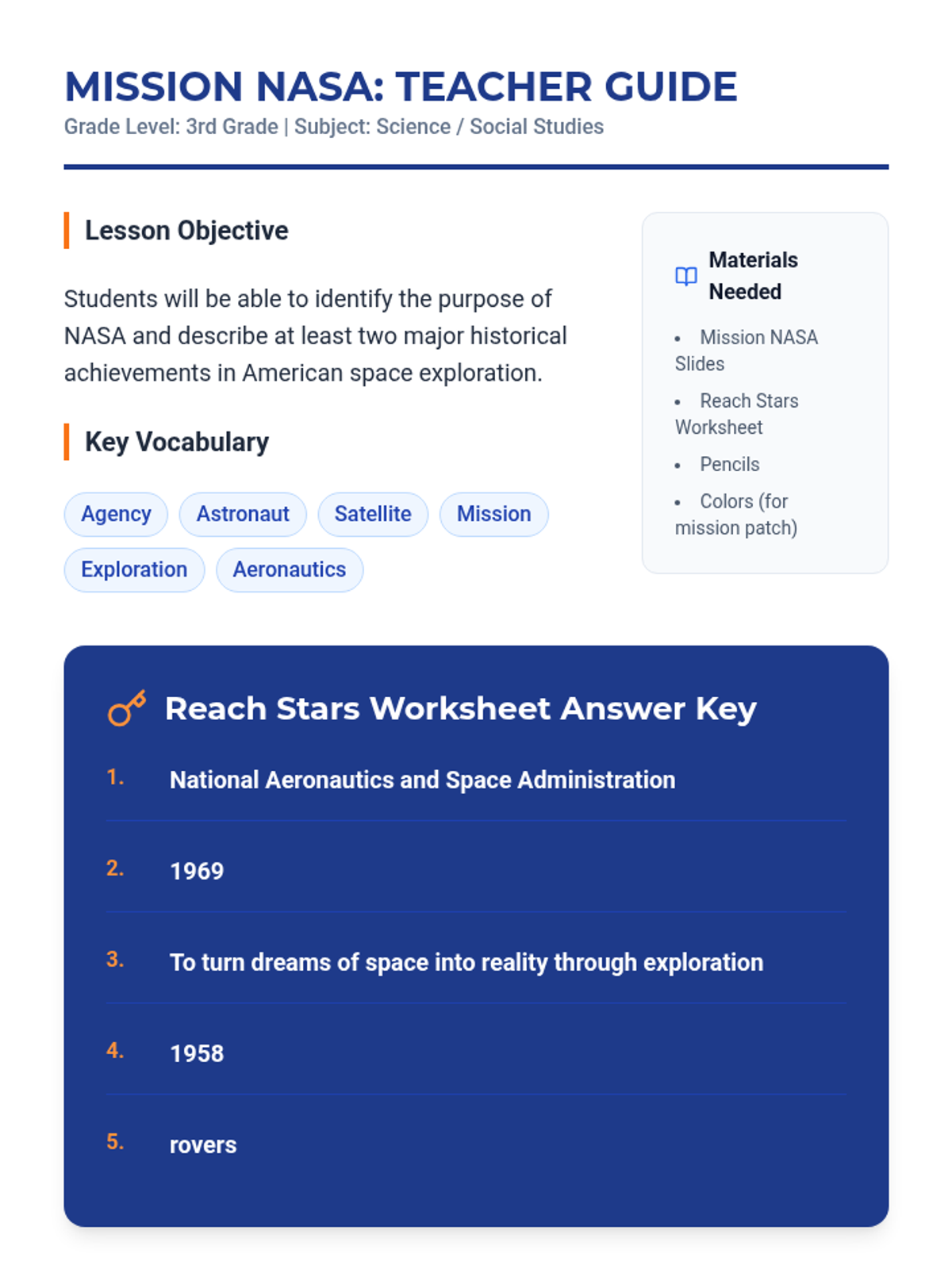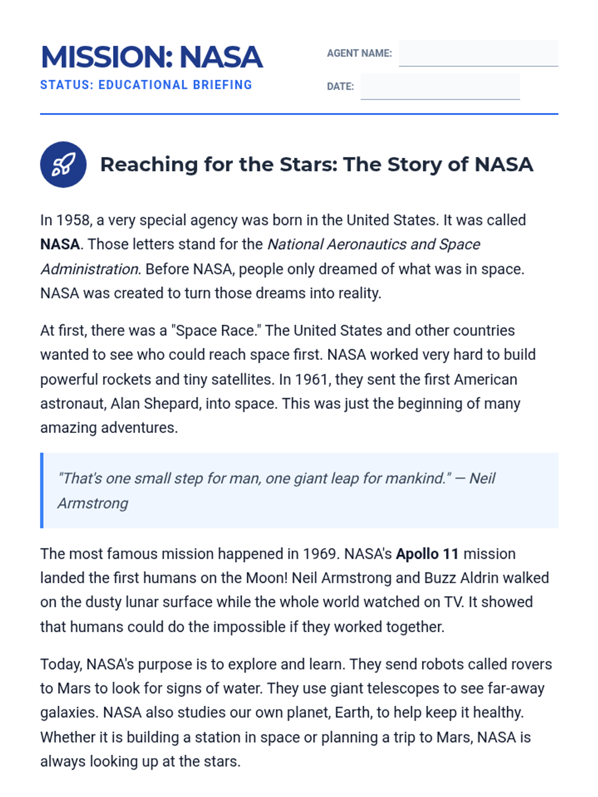 An introductory lesson on the history and purpose of NASA, exploring how and why the United States began its journey into space exploration.