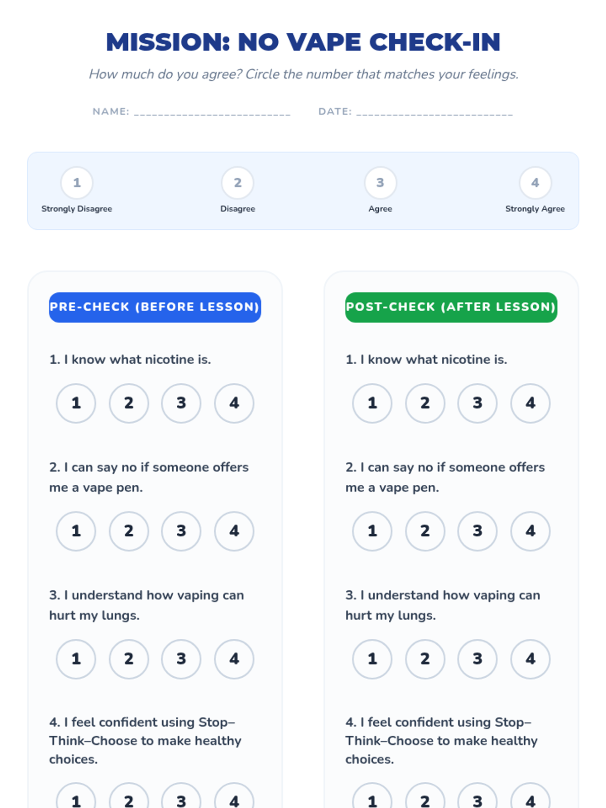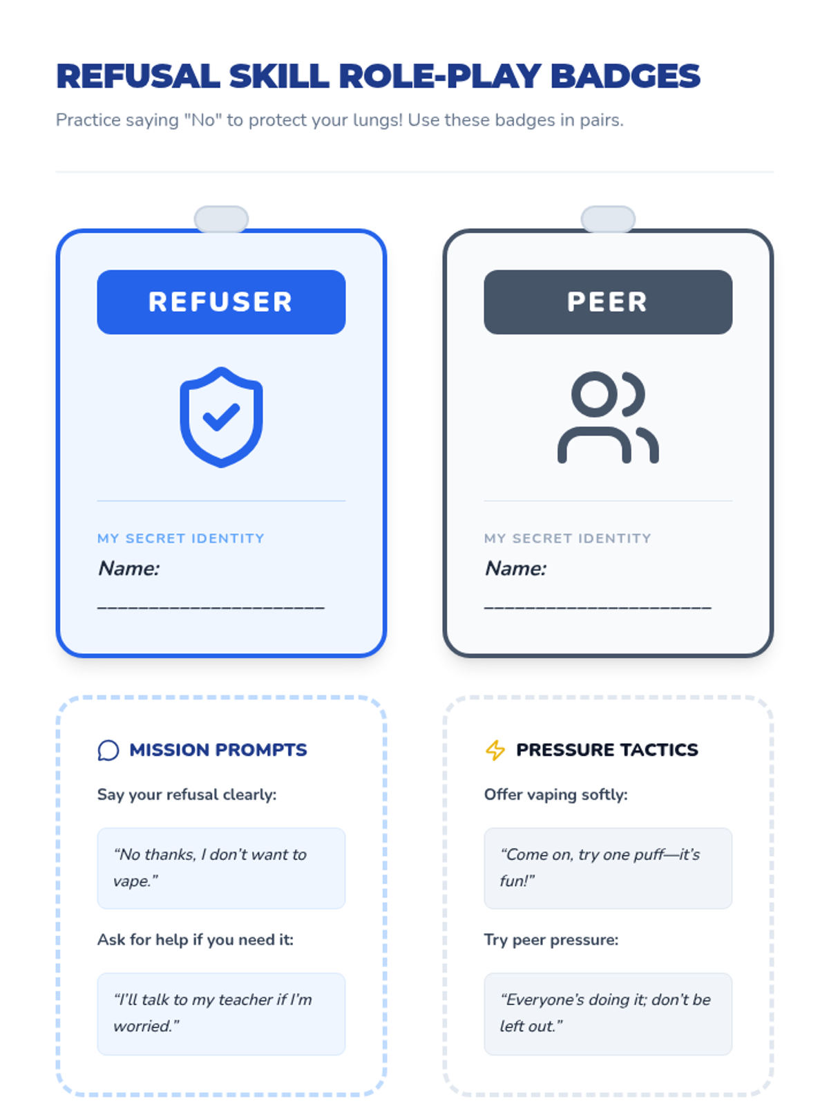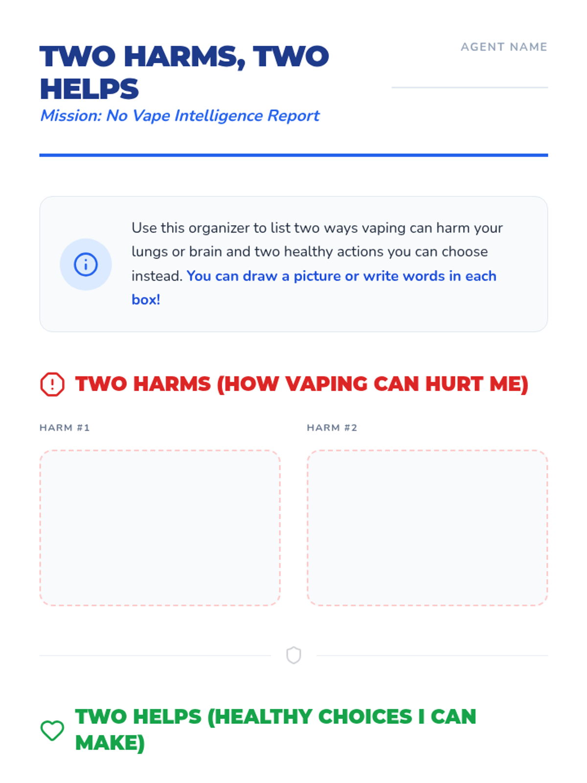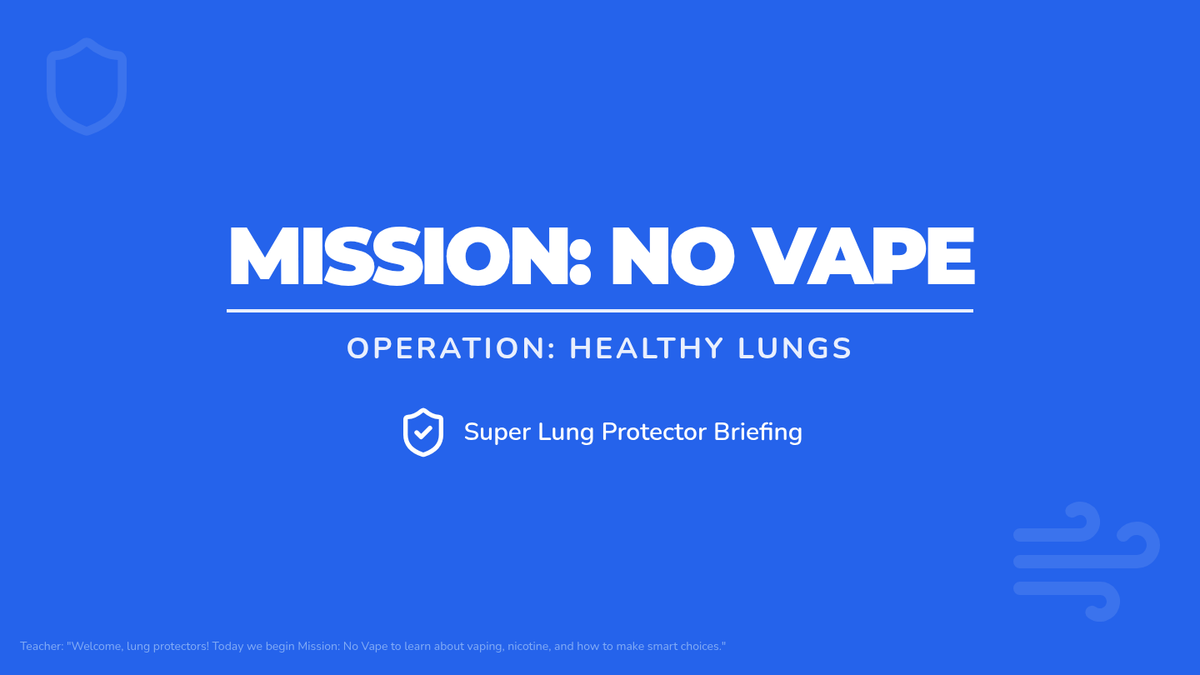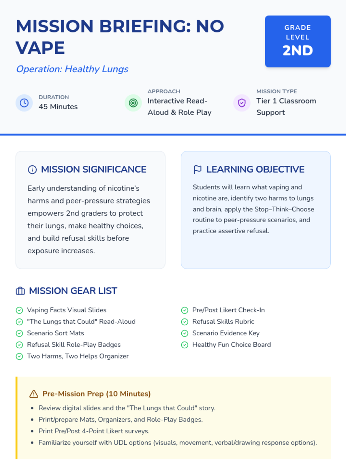 A 45-minute interactive health lesson for 2nd graders that introduces the harms of vaping and nicotine through a hero-themed 'Mission: No Vape' concept. Students learn refusal skills, practice the Stop-Think-Choose routine, and commit to healthy habits.