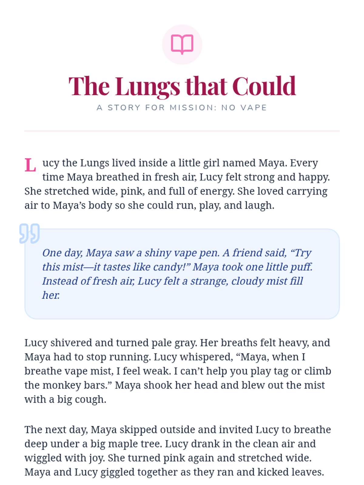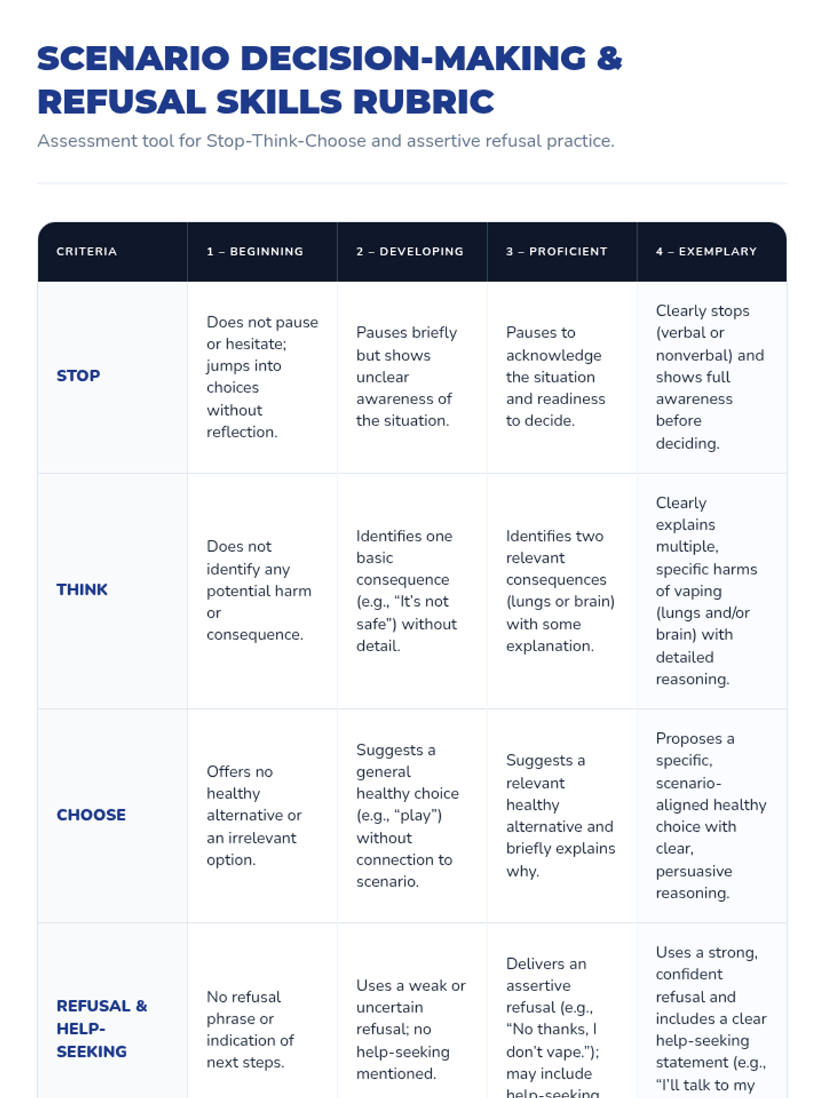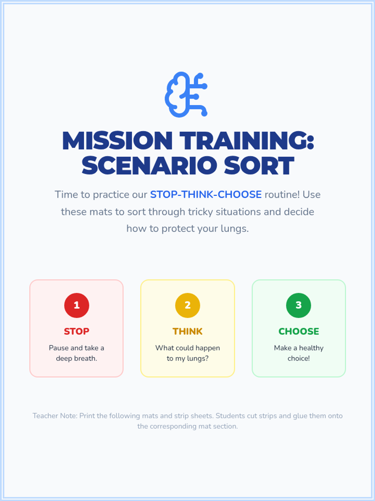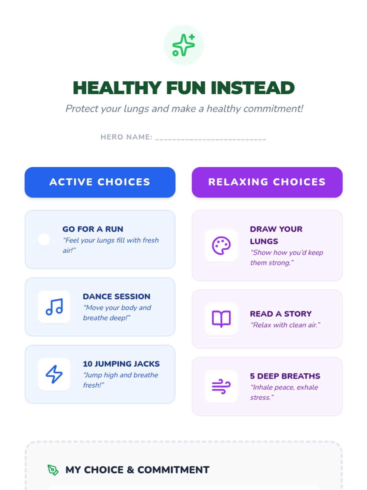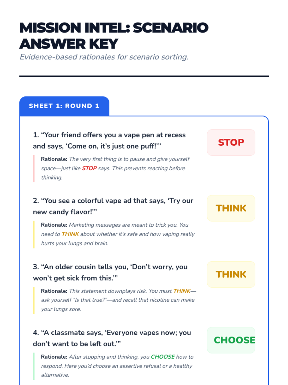 A 45-minute interactive health lesson for 2nd graders that introduces the harms of vaping and nicotine through a hero-themed 'Mission: No Vape' concept. Students learn refusal skills, practice the Stop-Think-Choose routine, and commit to healthy habits.