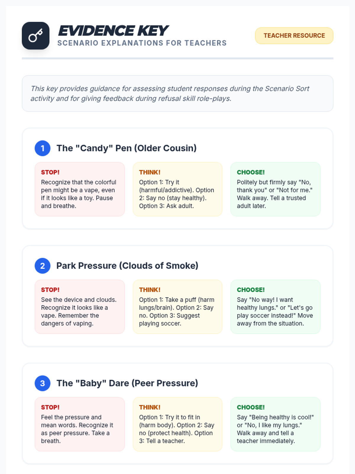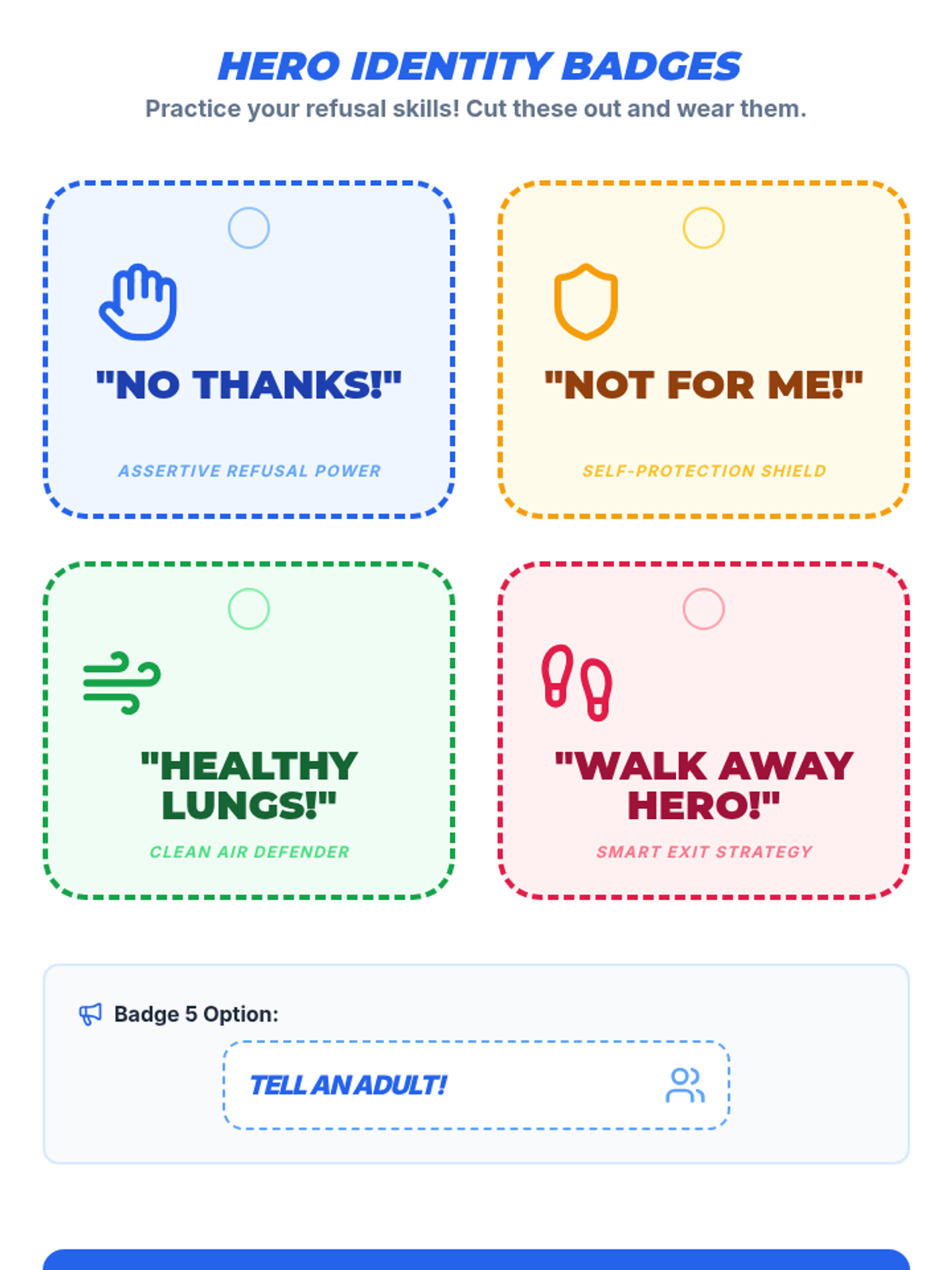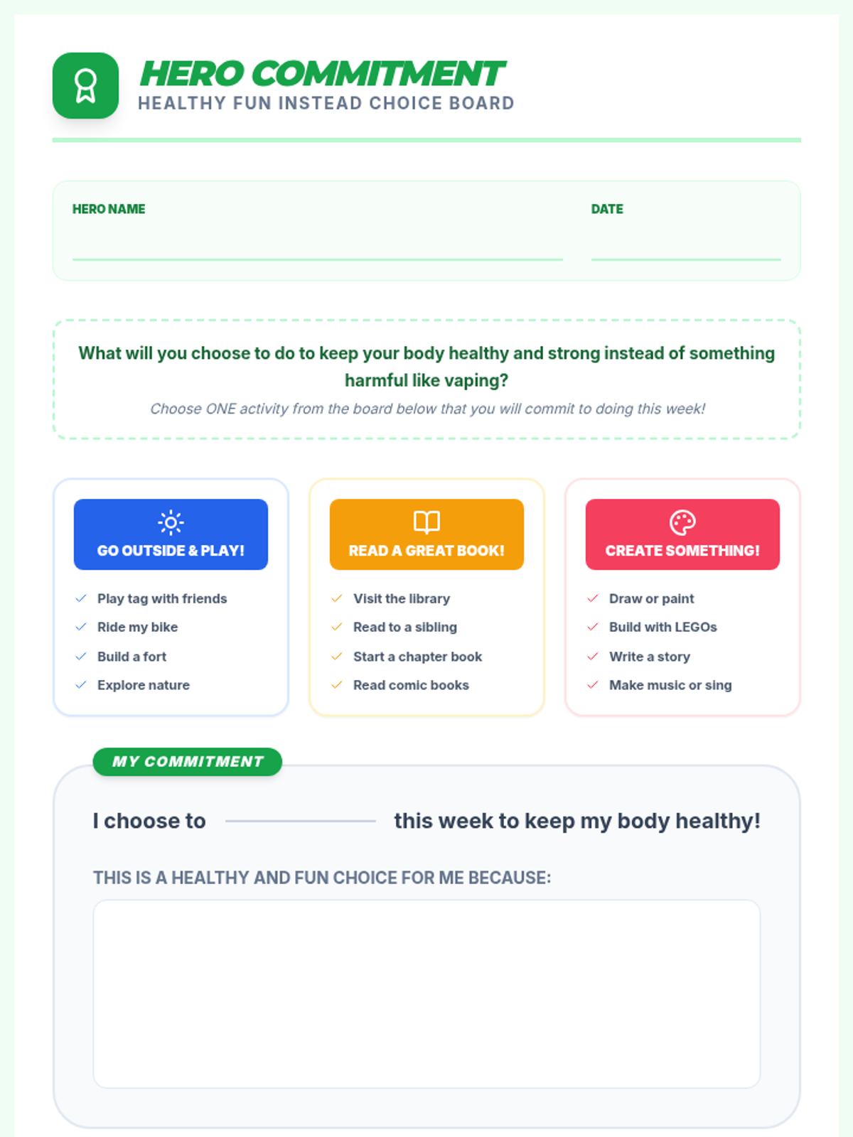 This 45-minute lesson for 2nd Grade students uses a superhero theme to teach the dangers of vaping and nicotine. Students learn a 3-step decision-making routine (Stop, Think, Choose) and practice assertive refusal skills through interactive scenarios and role-play.