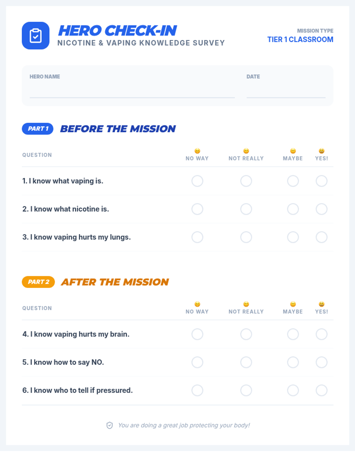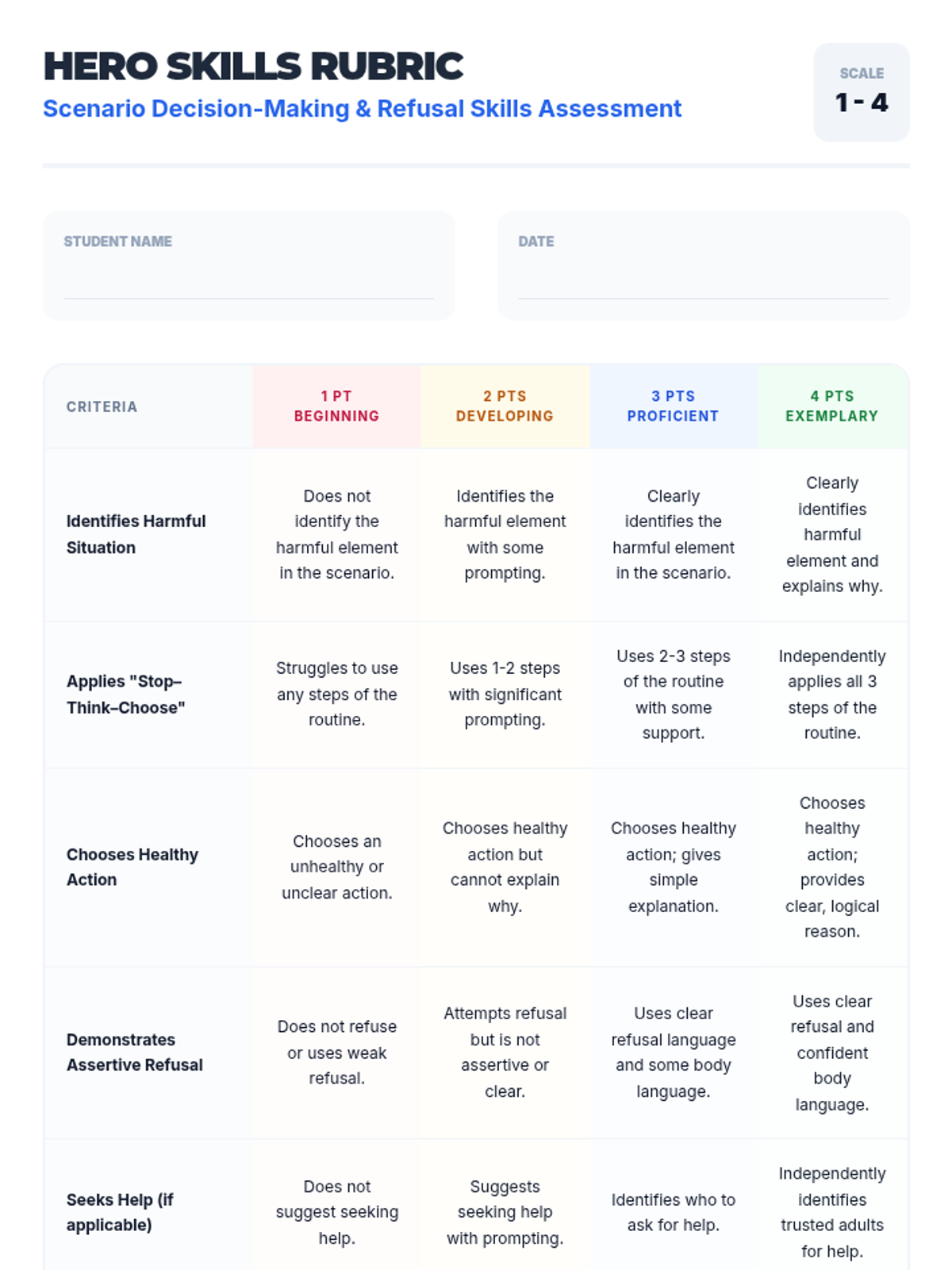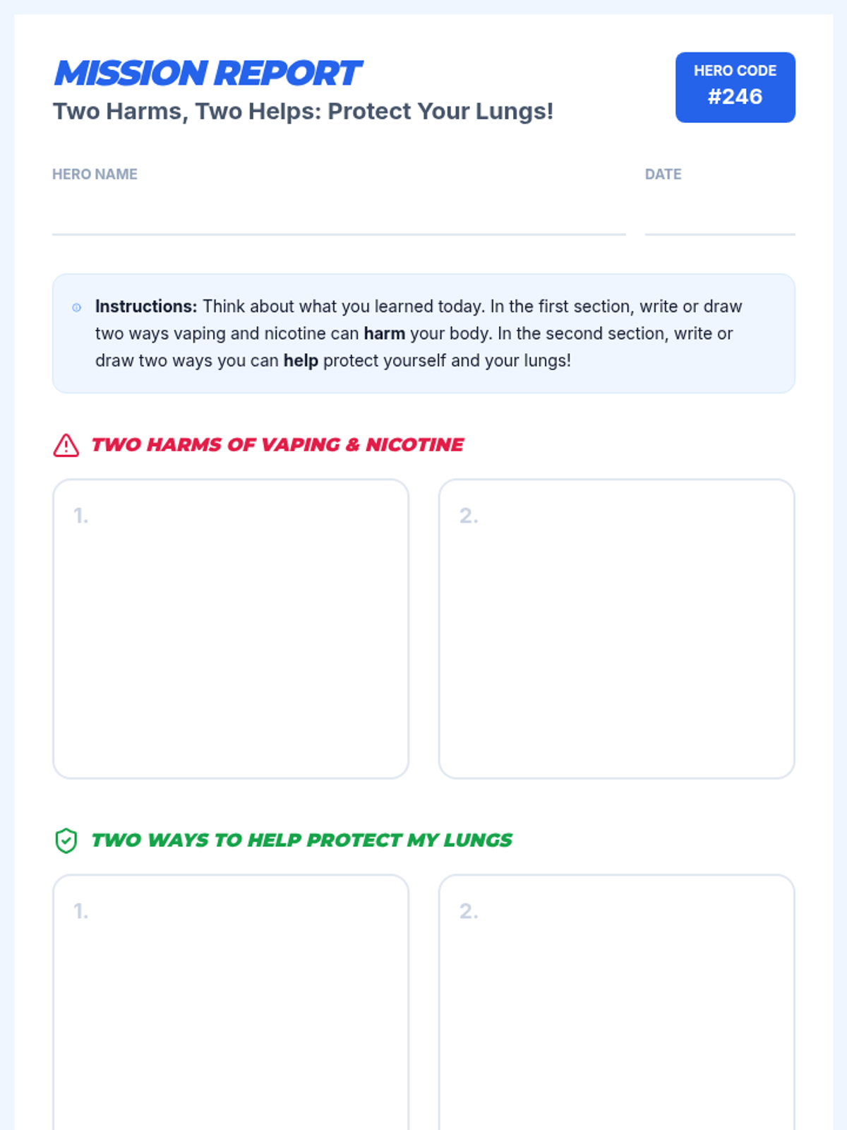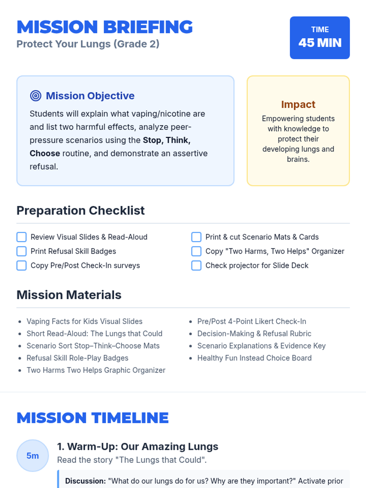 This 45-minute lesson for 2nd Grade students uses a superhero theme to teach the dangers of vaping and nicotine. Students learn a 3-step decision-making routine (Stop, Think, Choose) and practice assertive refusal skills through interactive scenarios and role-play.