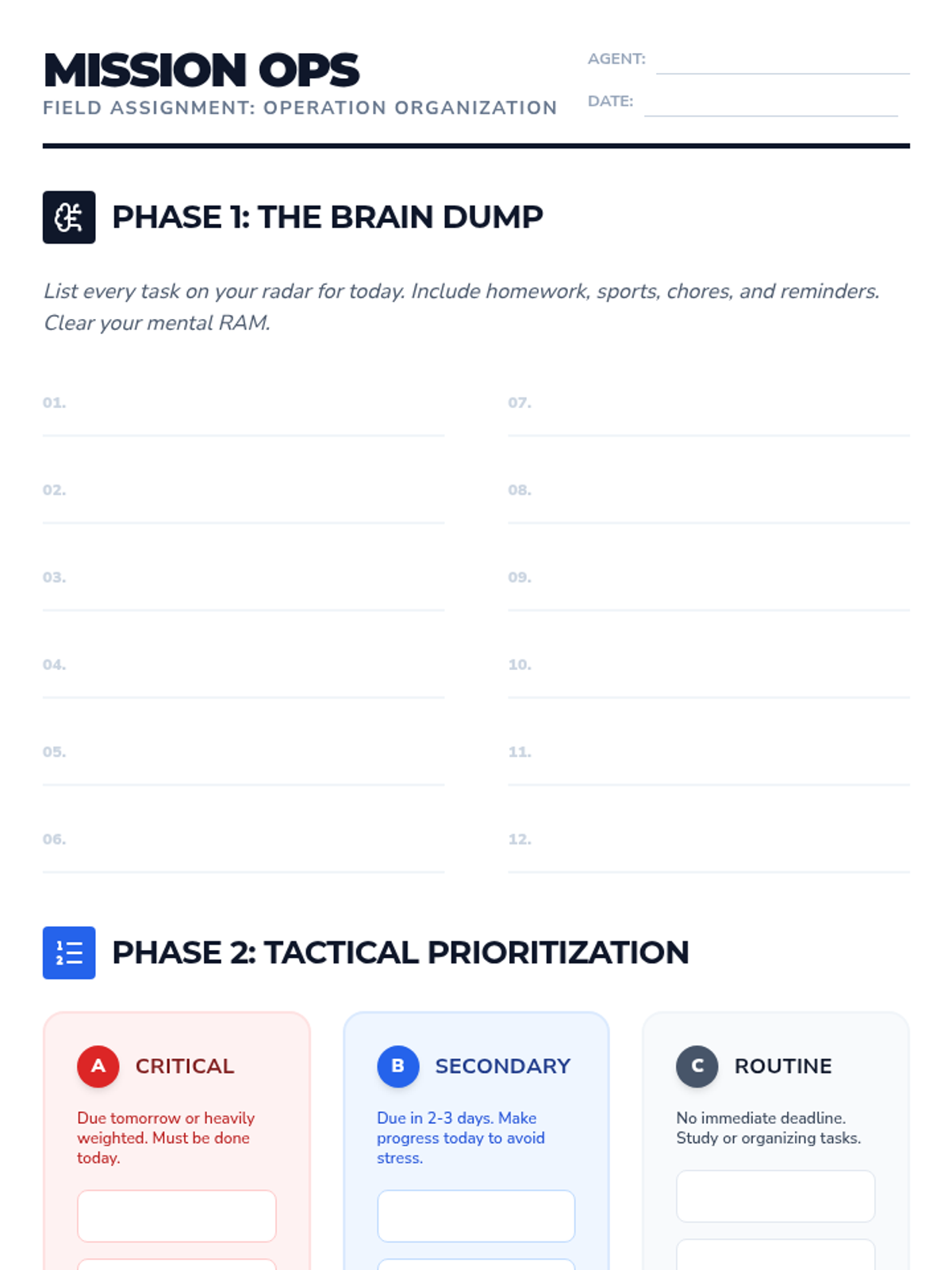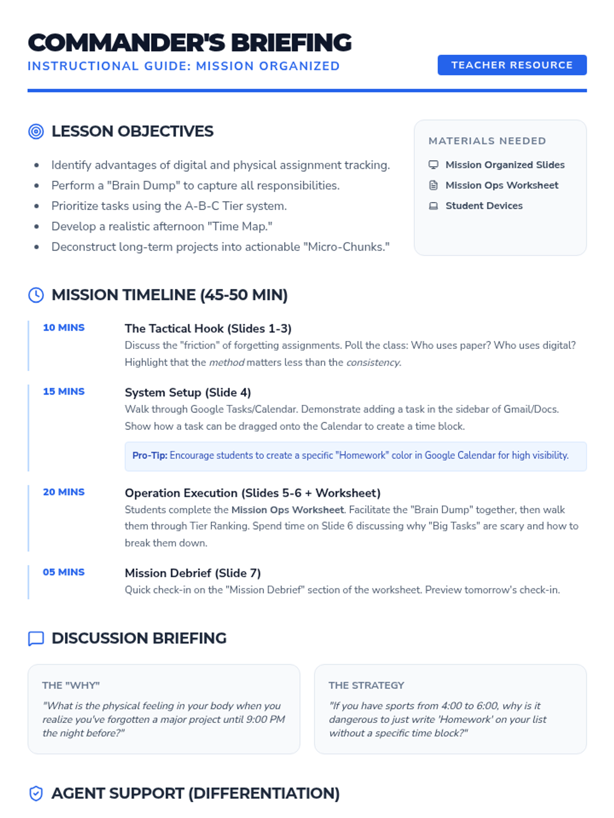 A comprehensive lesson designed to teach students effective methods for tracking daily assignments and long-term projects using both digital tools (like Google Tasks/Calendar) and physical planners. Students will learn to prioritize their afternoons and break down large tasks into manageable steps.