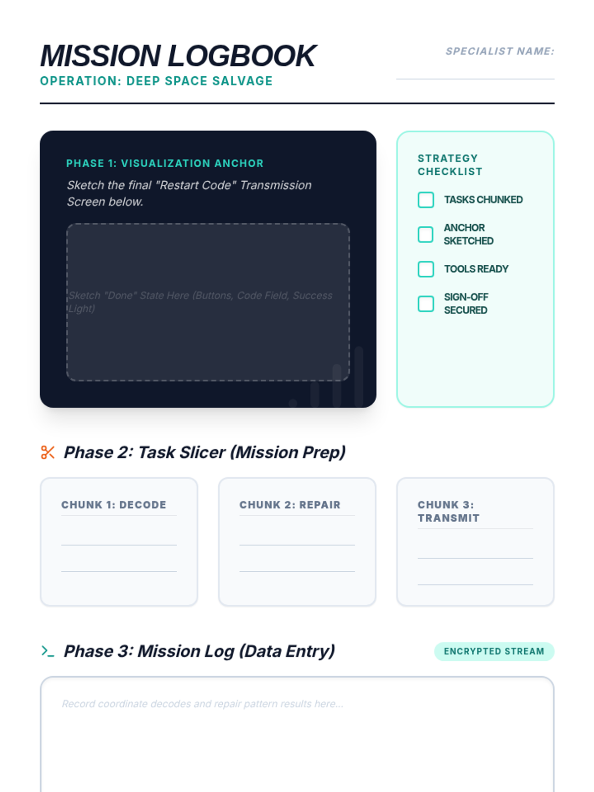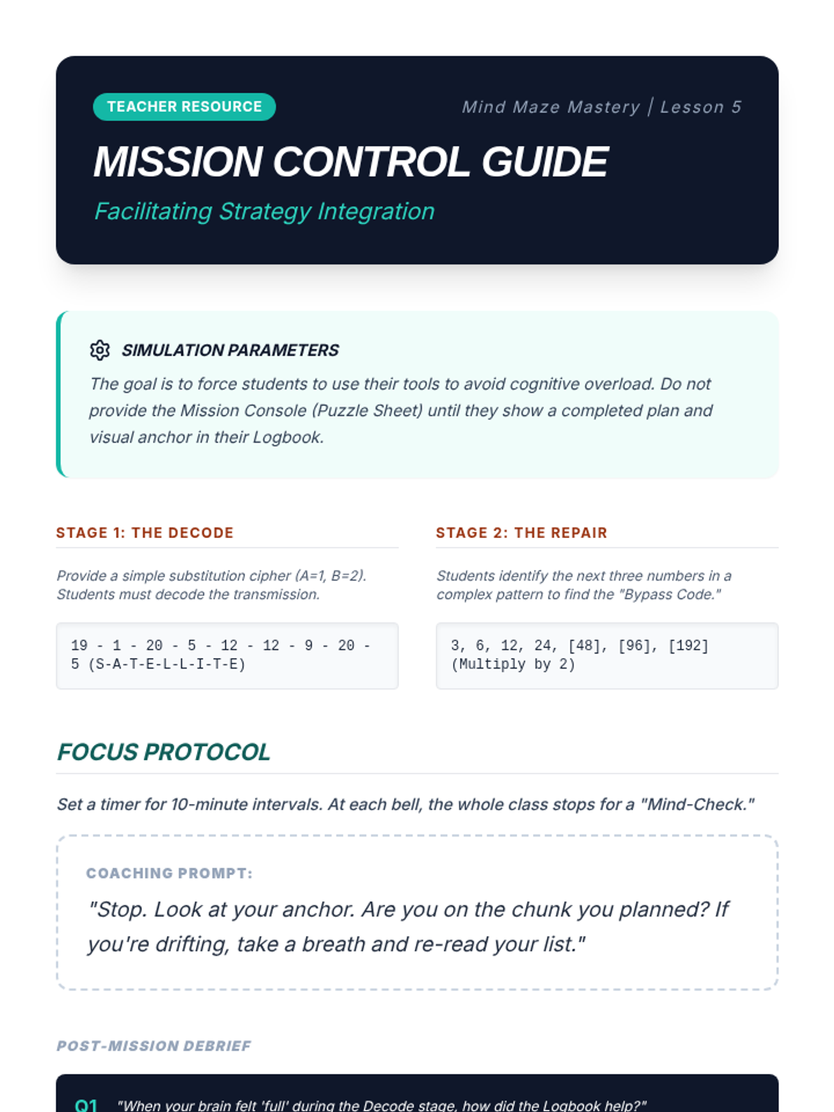 Students integrate all learned strategies (chunking, checklists, and visualization) to solve a multi-stage logic puzzle or 'escape room' scenario. They document their plan and use self-monitoring prompts to check their focus throughout the activity.