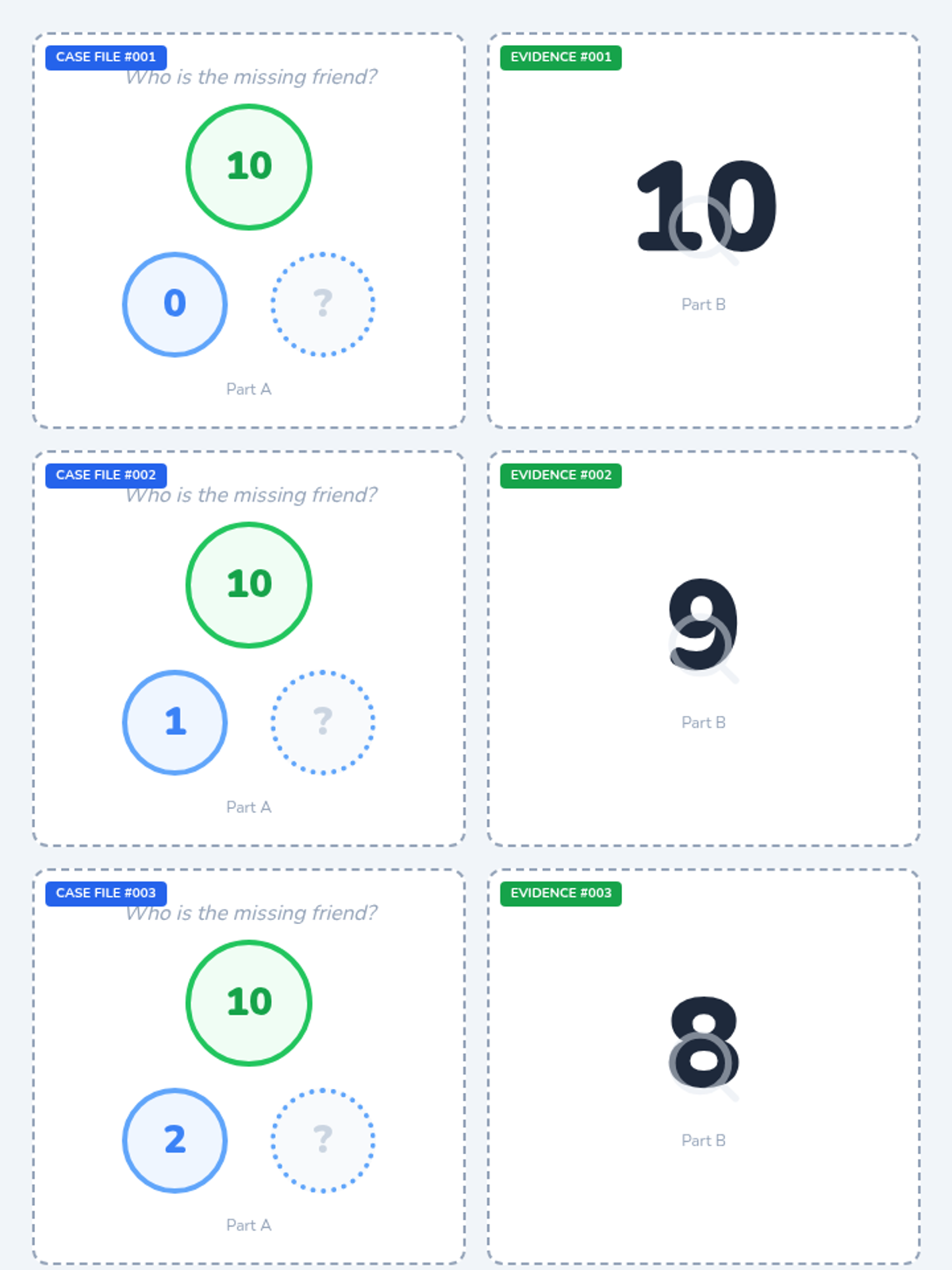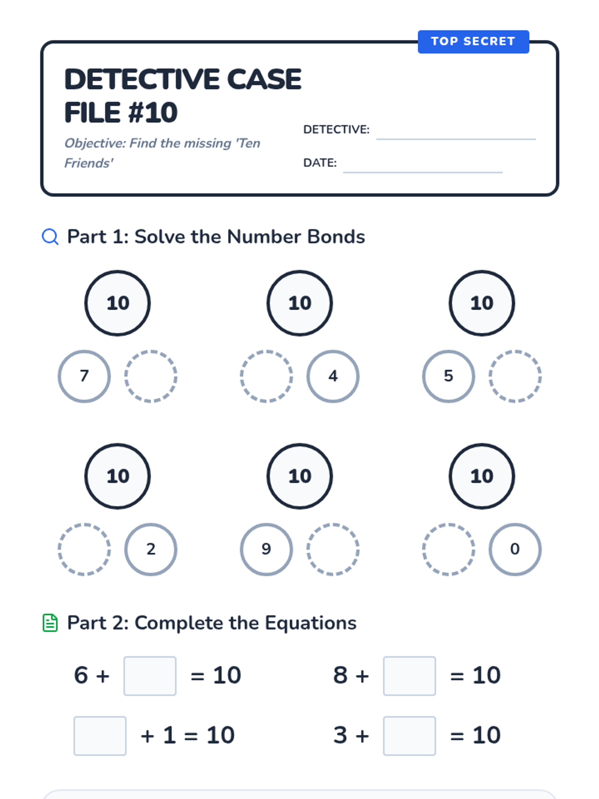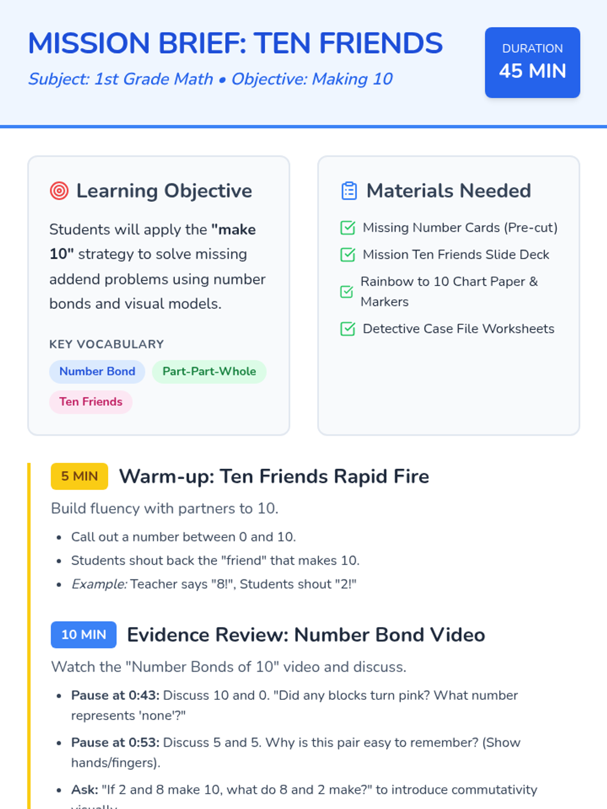 A 1st-grade math lesson where students become detectives to find 'Ten Friends' using number bonds, video analysis, and a movement-based matching activity.