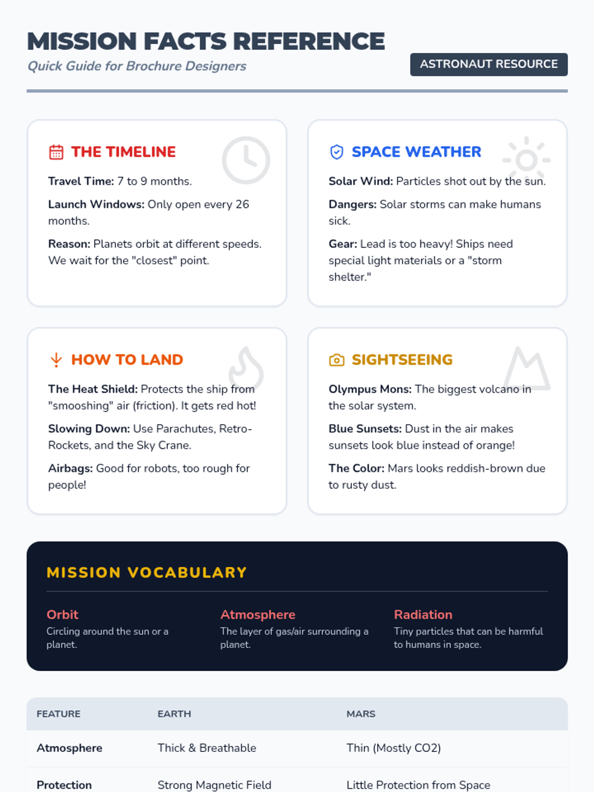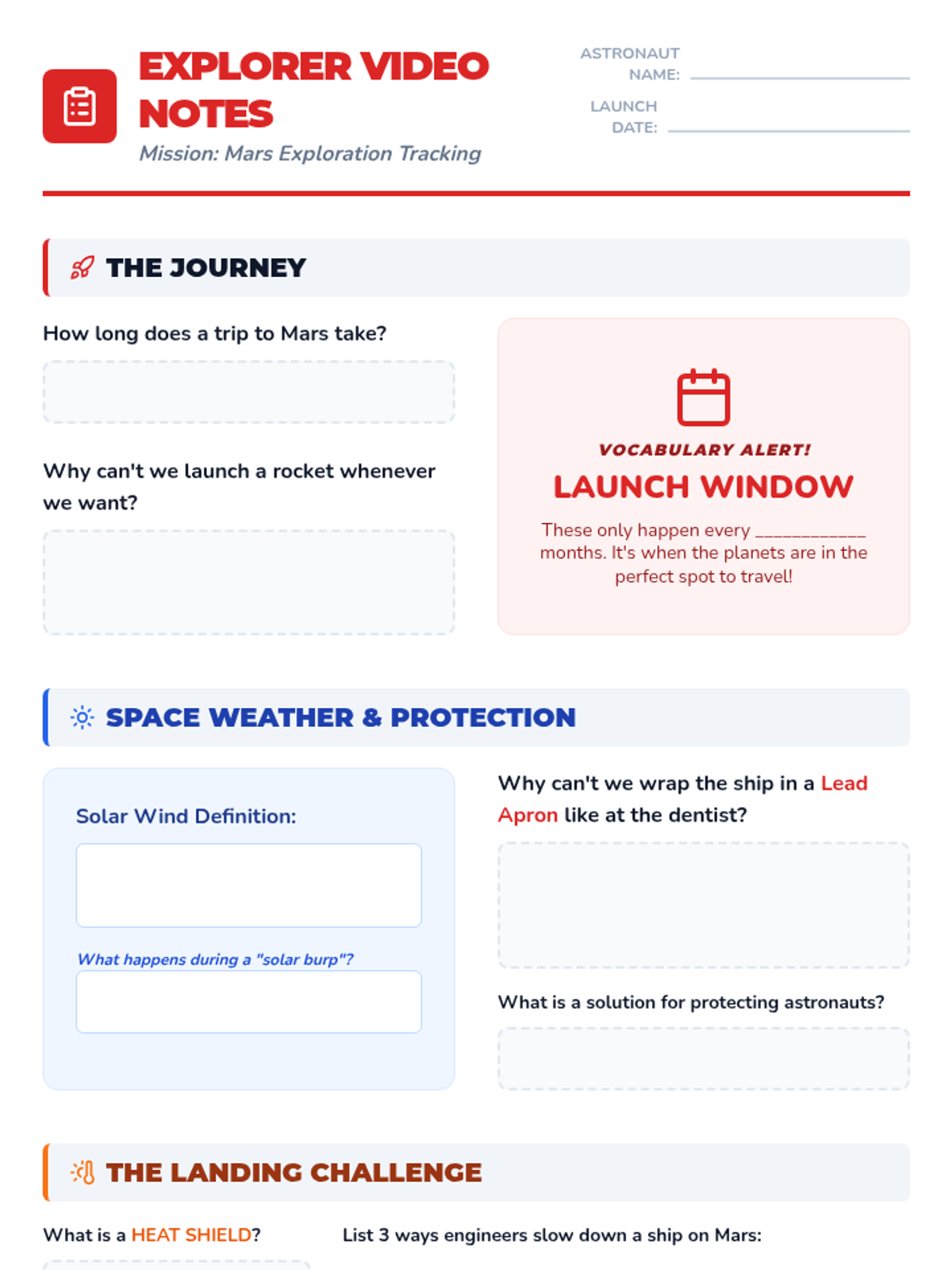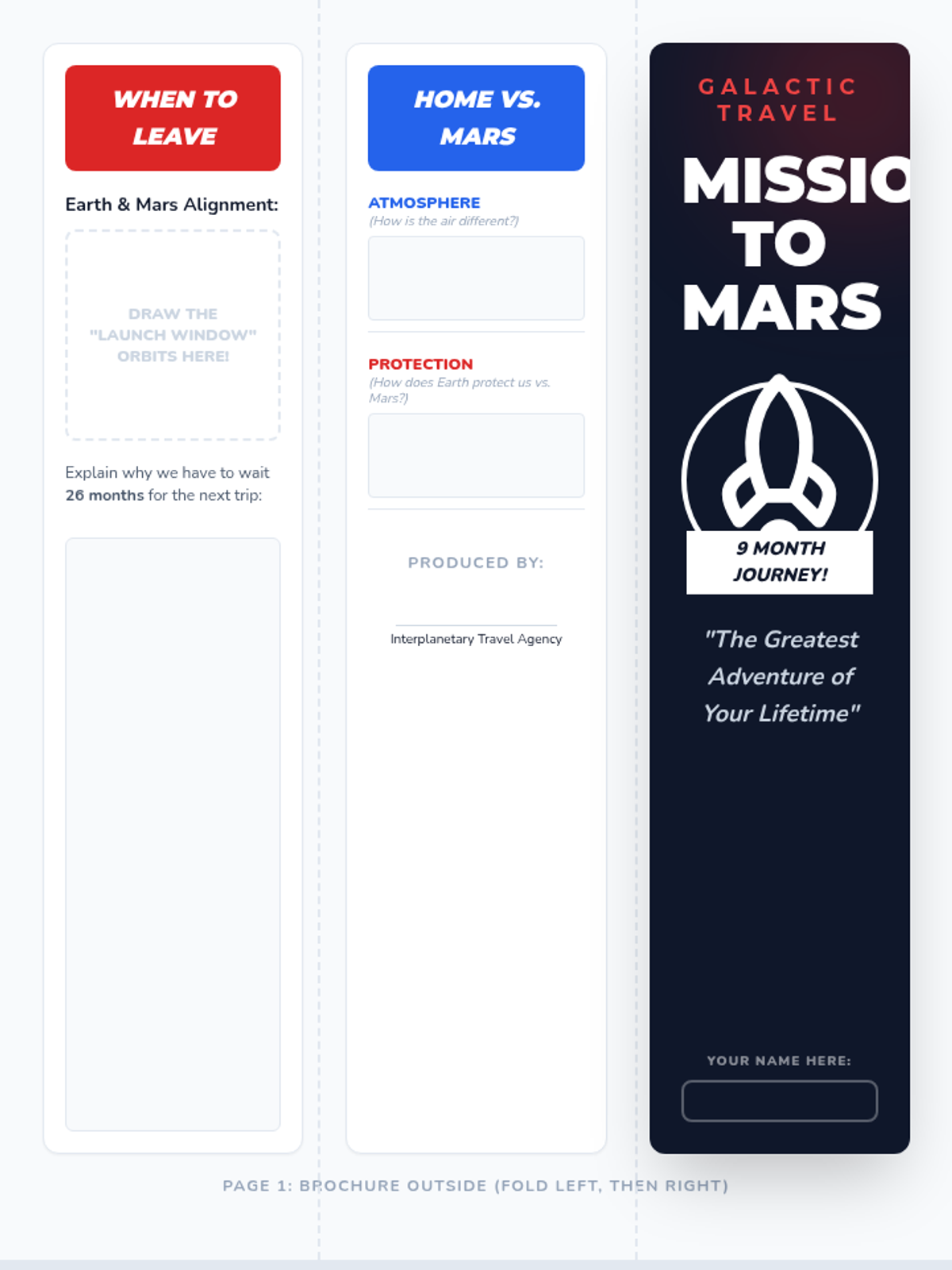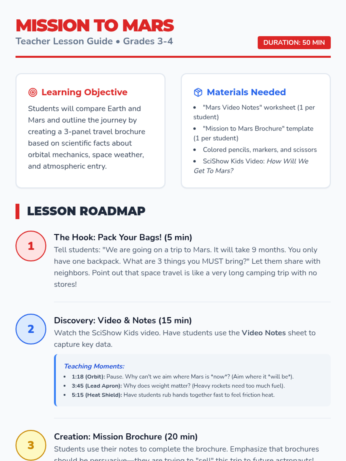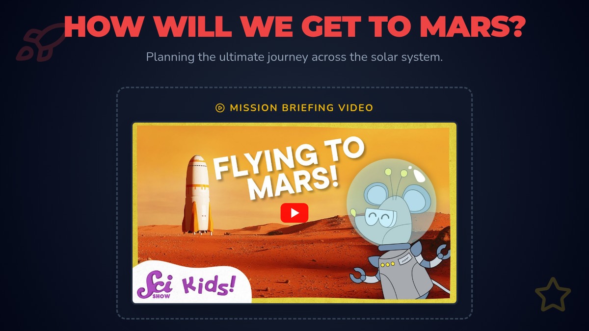 Students will learn about the challenges and logistics of traveling to Mars through a SciShow Kids video and create a creative travel brochure detailing launch windows, radiation protection, landing tech, and Martian landmarks.