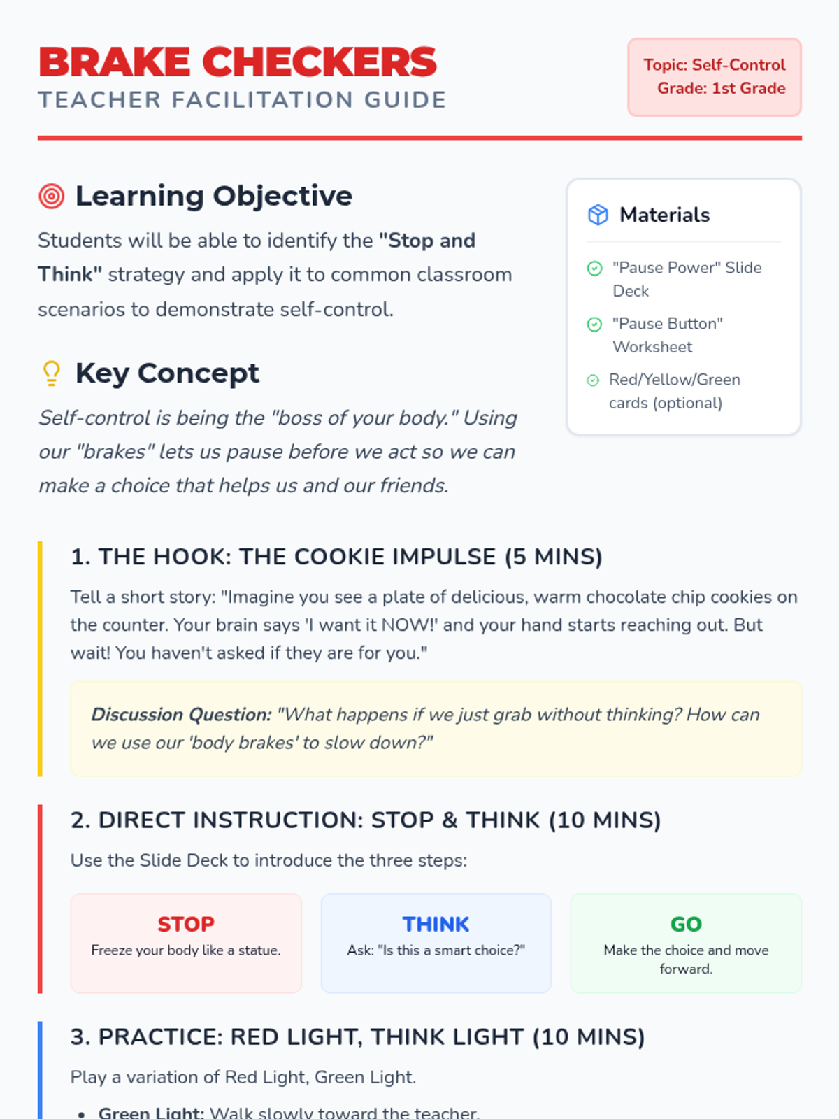 A foundational lesson for first graders on self-control using the 'Stop and Think' strategy to manage impulses and make better choices through a fun traffic-inspired theme.