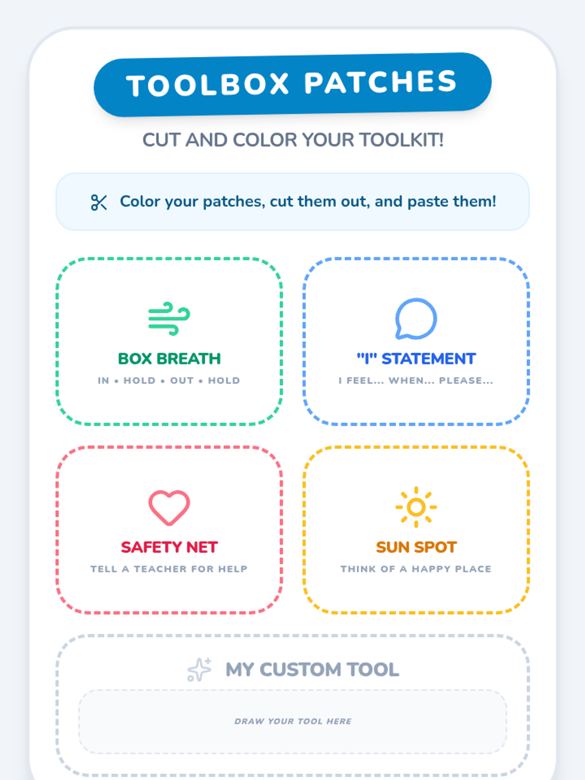 Focuses on practical tools for regulation: deep breathing, mindfulness, and the 'I' Statement tool.