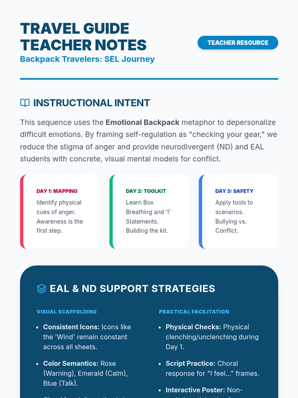 Students learn to identify physical signs of anger and use the 'Emotional Backpack' metaphor to understand that everyone carries feelings.