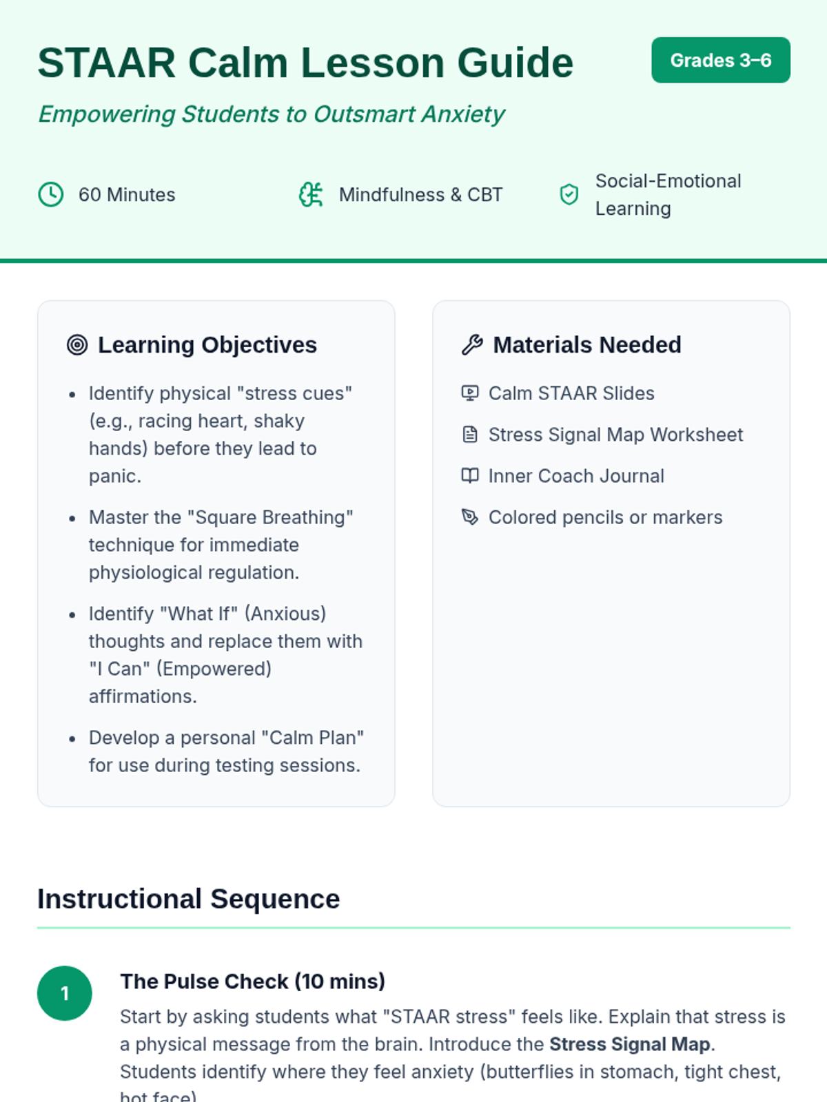 A comprehensive mindfulness workshop designed to equip 3rd-6th grade students with practical tools to manage testing anxiety, focusing on physiological awareness and cognitive reframing.