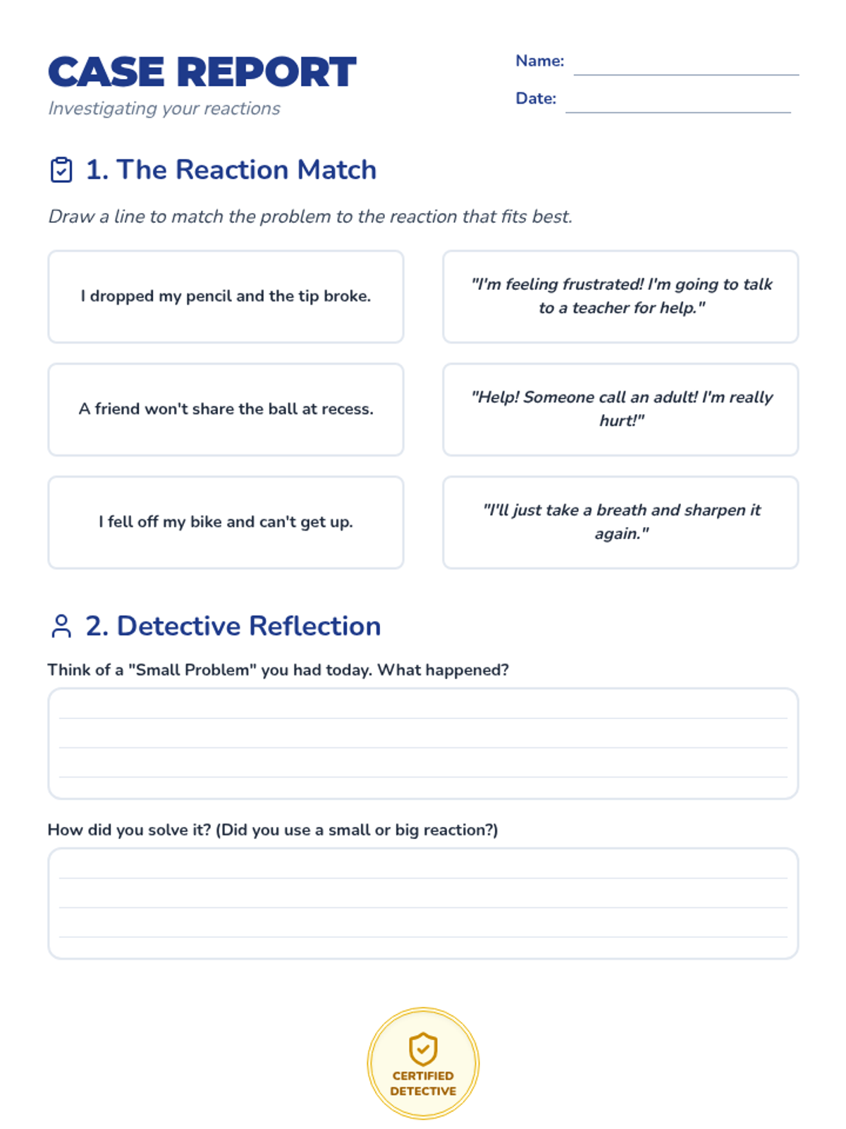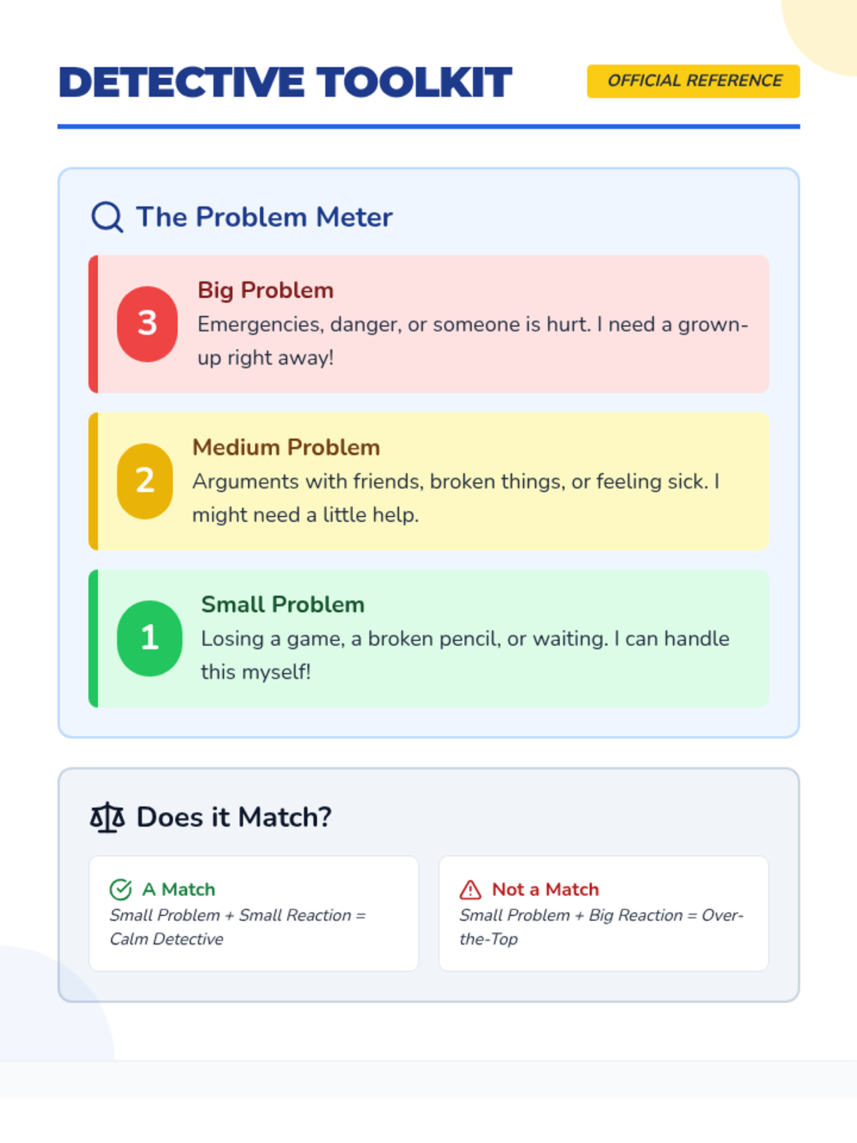 A session for 2nd graders to learn how to identify the 'size' of a problem and match their emotional reaction to it using a detective-themed framework.