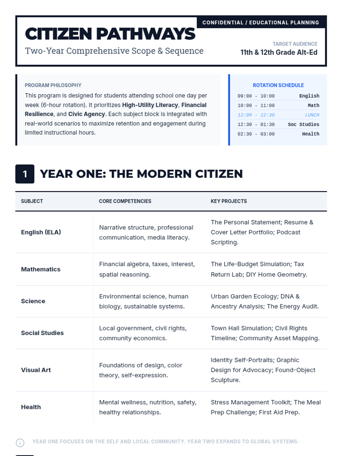 The first year of the program focuses on establishing the 'Modern Citizen,' emphasizing local community involvement, personal financial management, and foundational health and expression.