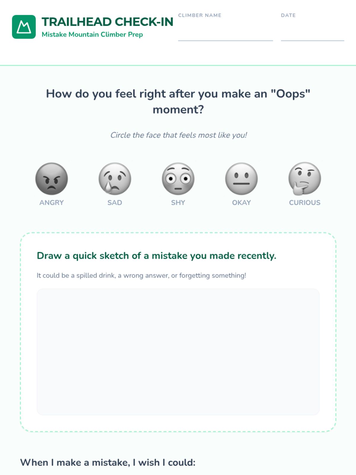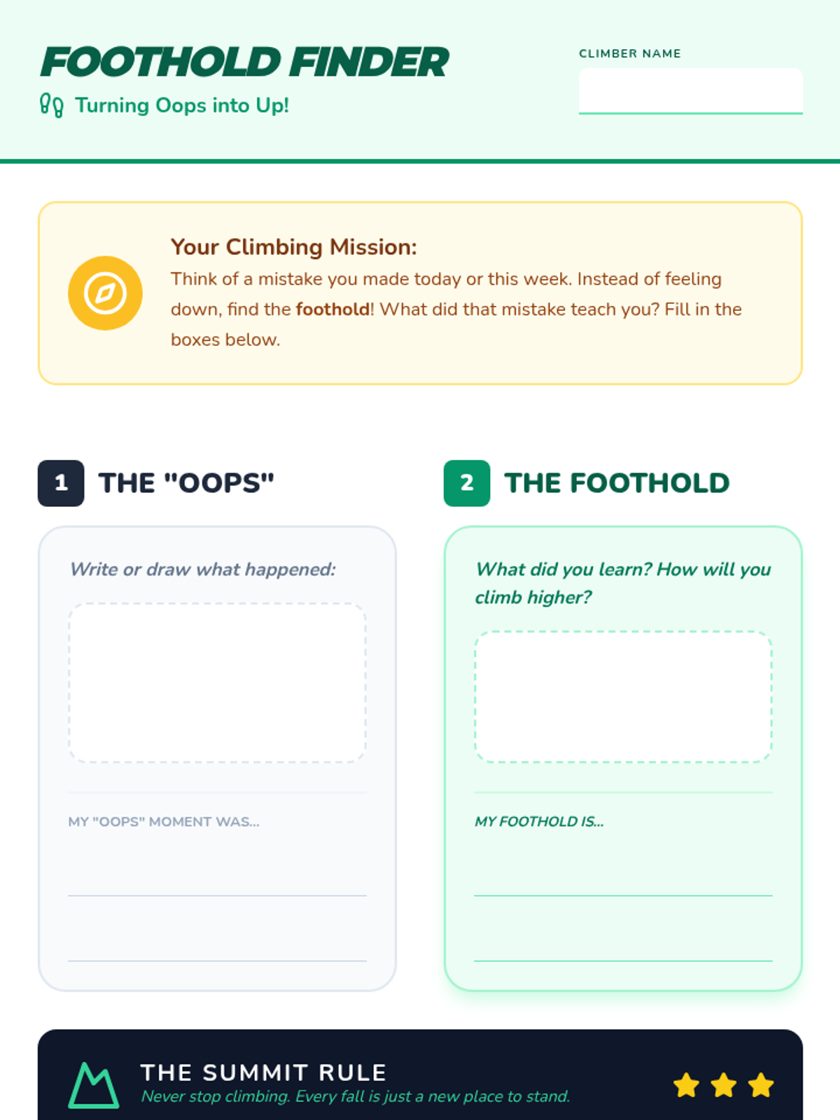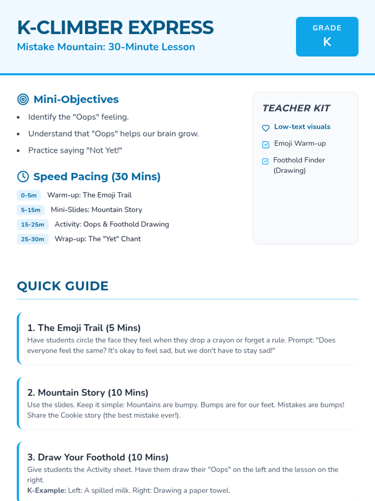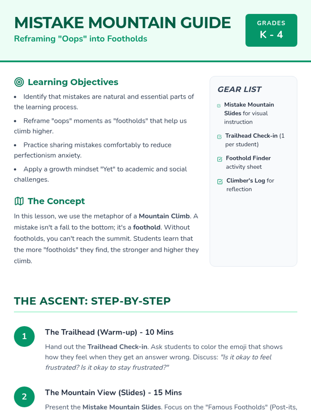 A social-emotional learning lesson for K-4 students that reframes mistakes as 'footholds' on the climb to success. Students will learn to embrace 'oops' moments, reduce perfectionism, and build a resilient growth mindset through interactive sharing and creative reflection.