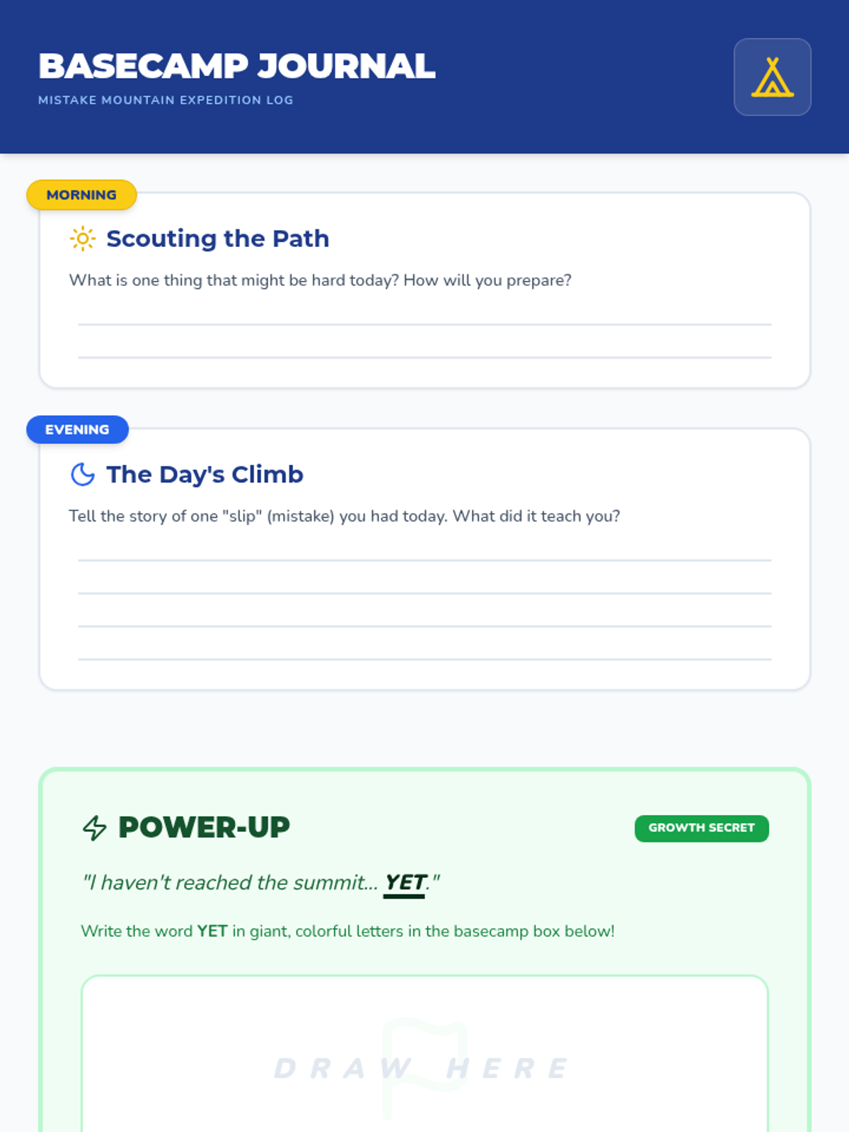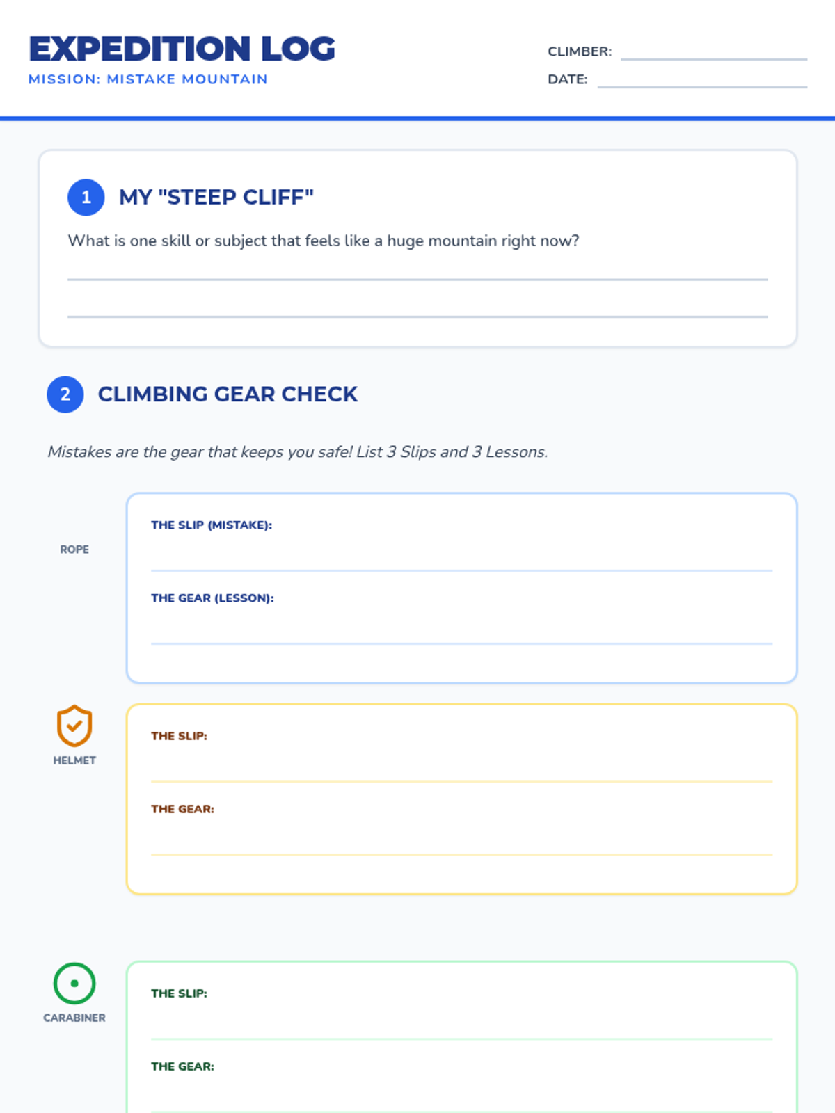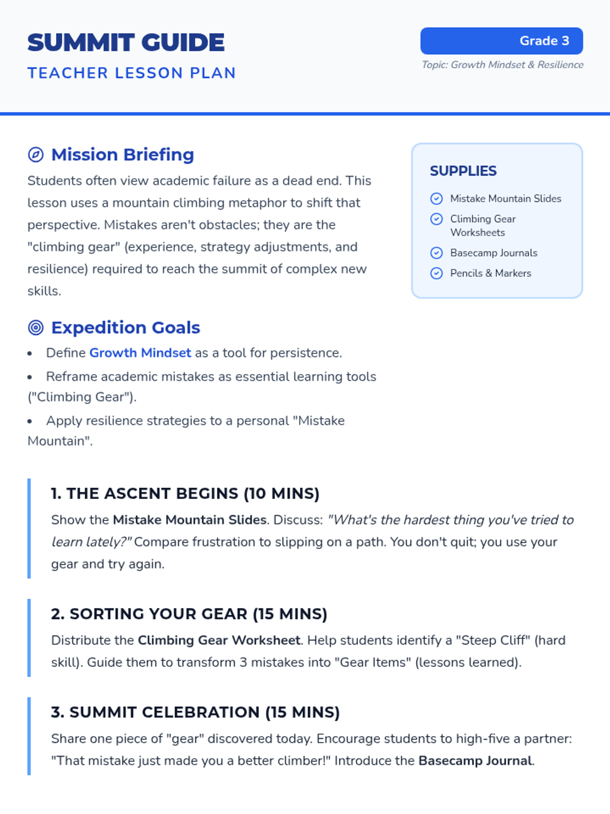 An adventure-themed lesson for 3rd graders that reframes academic mistakes as essential 'climbing gear' for reaching the summit of new skills. Students will learn growth mindset strategies and resilience through the metaphor of a mountain expedition.