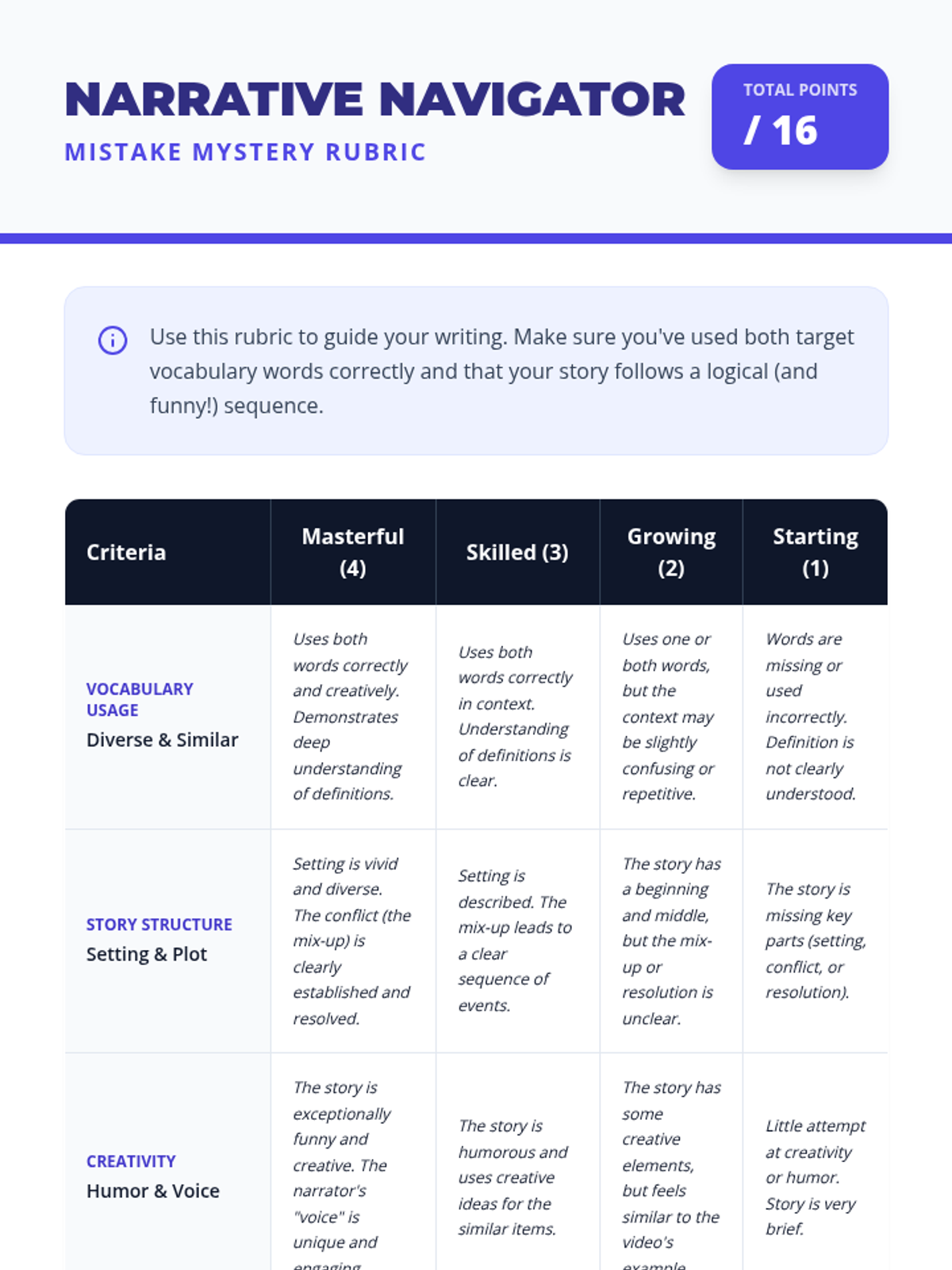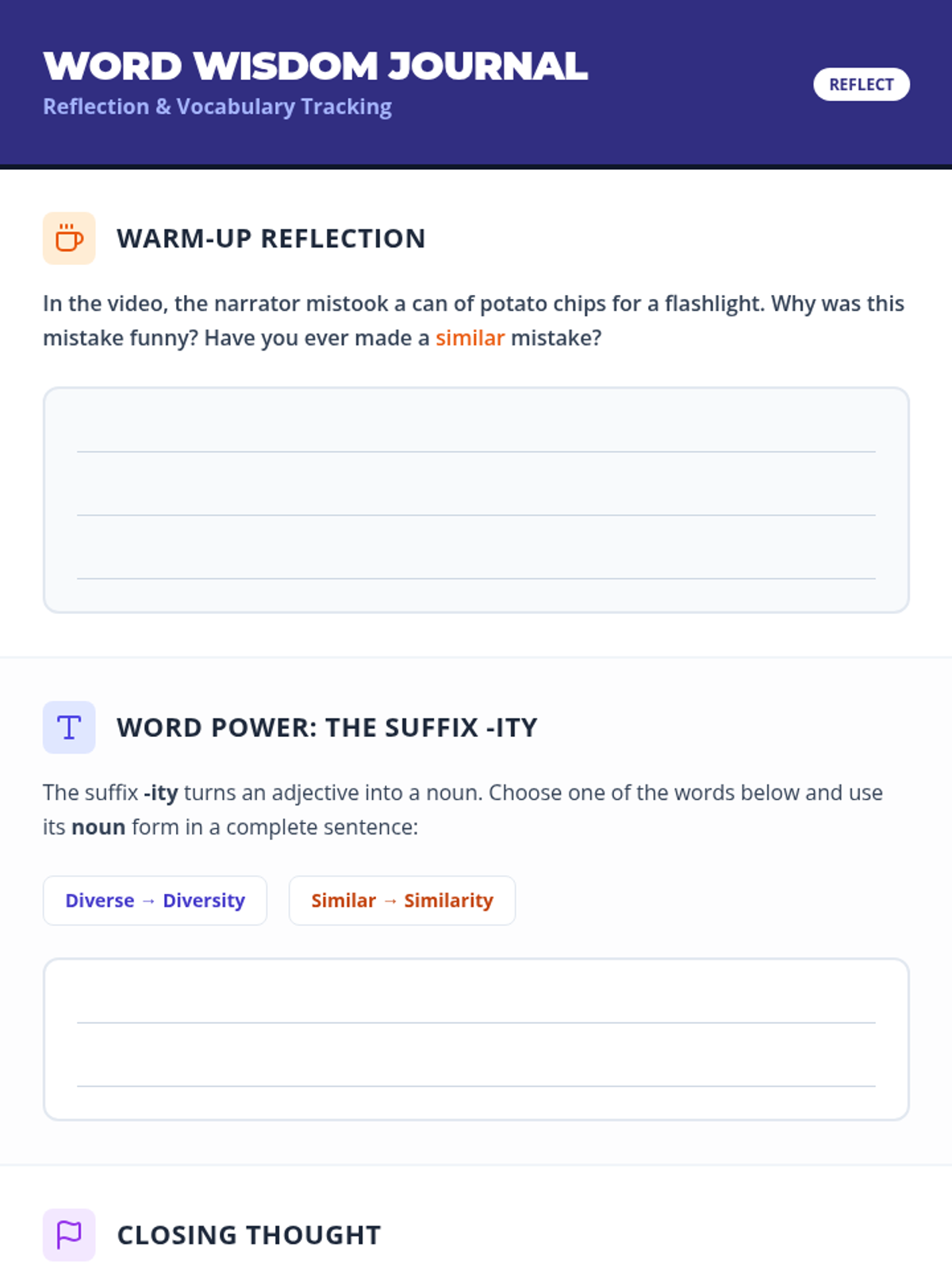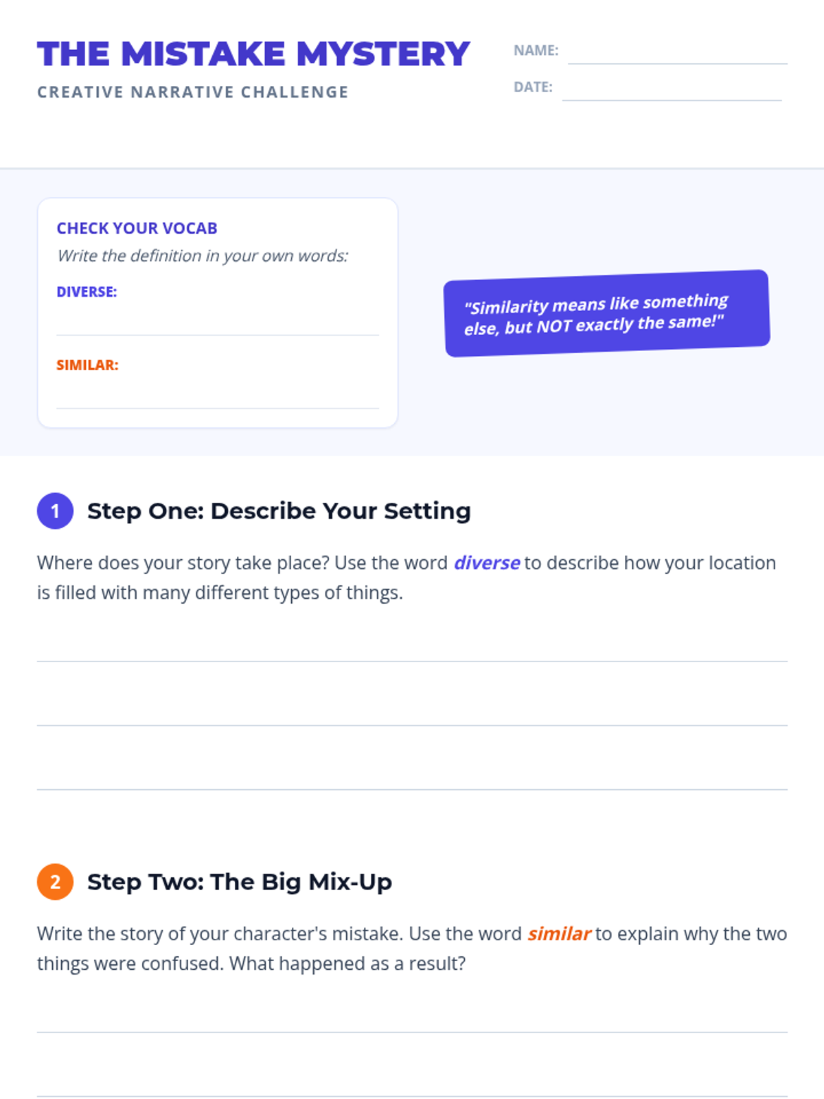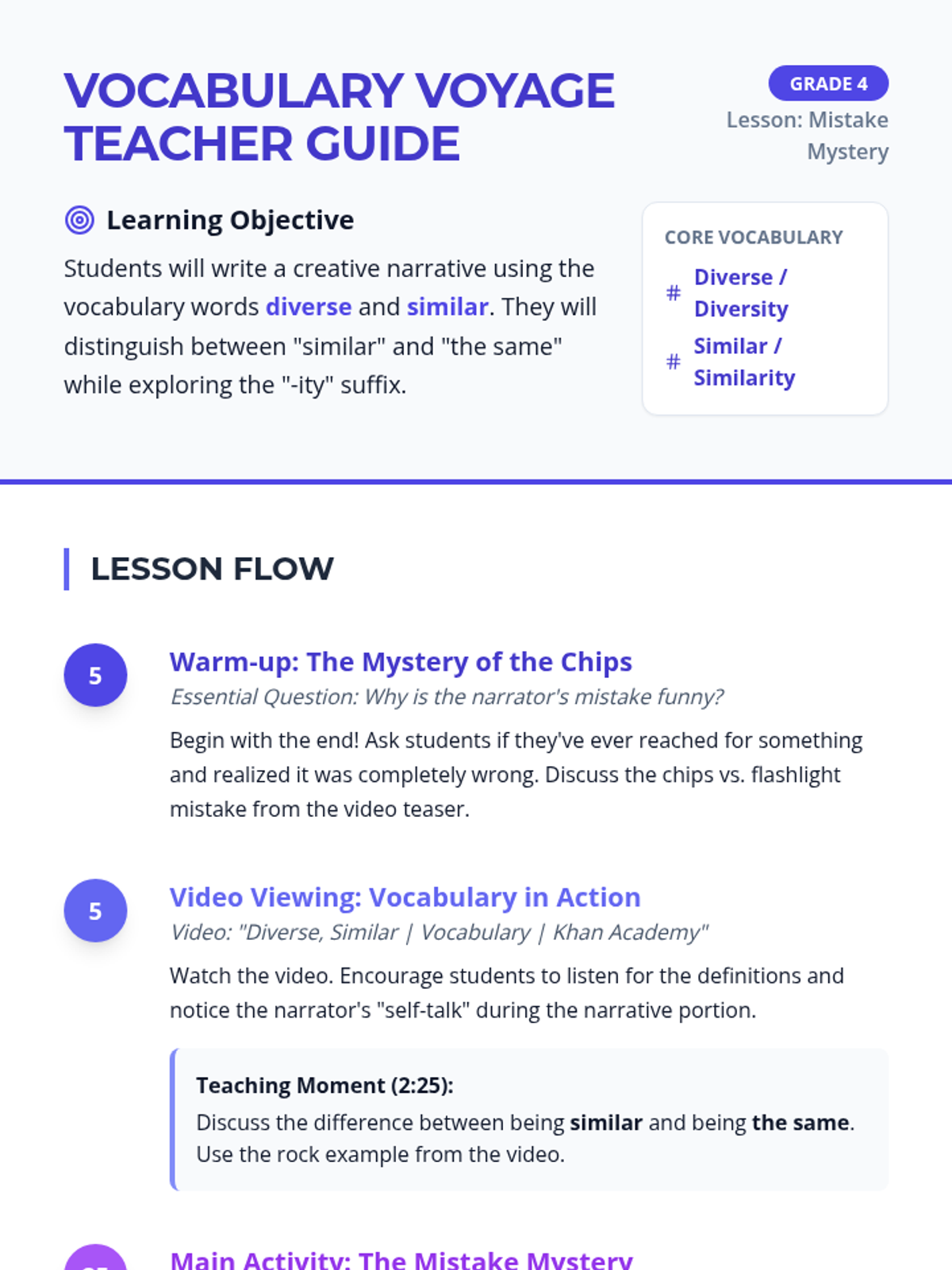 A creative writing lesson for 4th graders focused on the vocabulary words 'diverse' and 'similar.' Students will explore definitions, grammatical suffixes, and write a humorous 'mistake mystery' narrative based on a Khan Academy video.