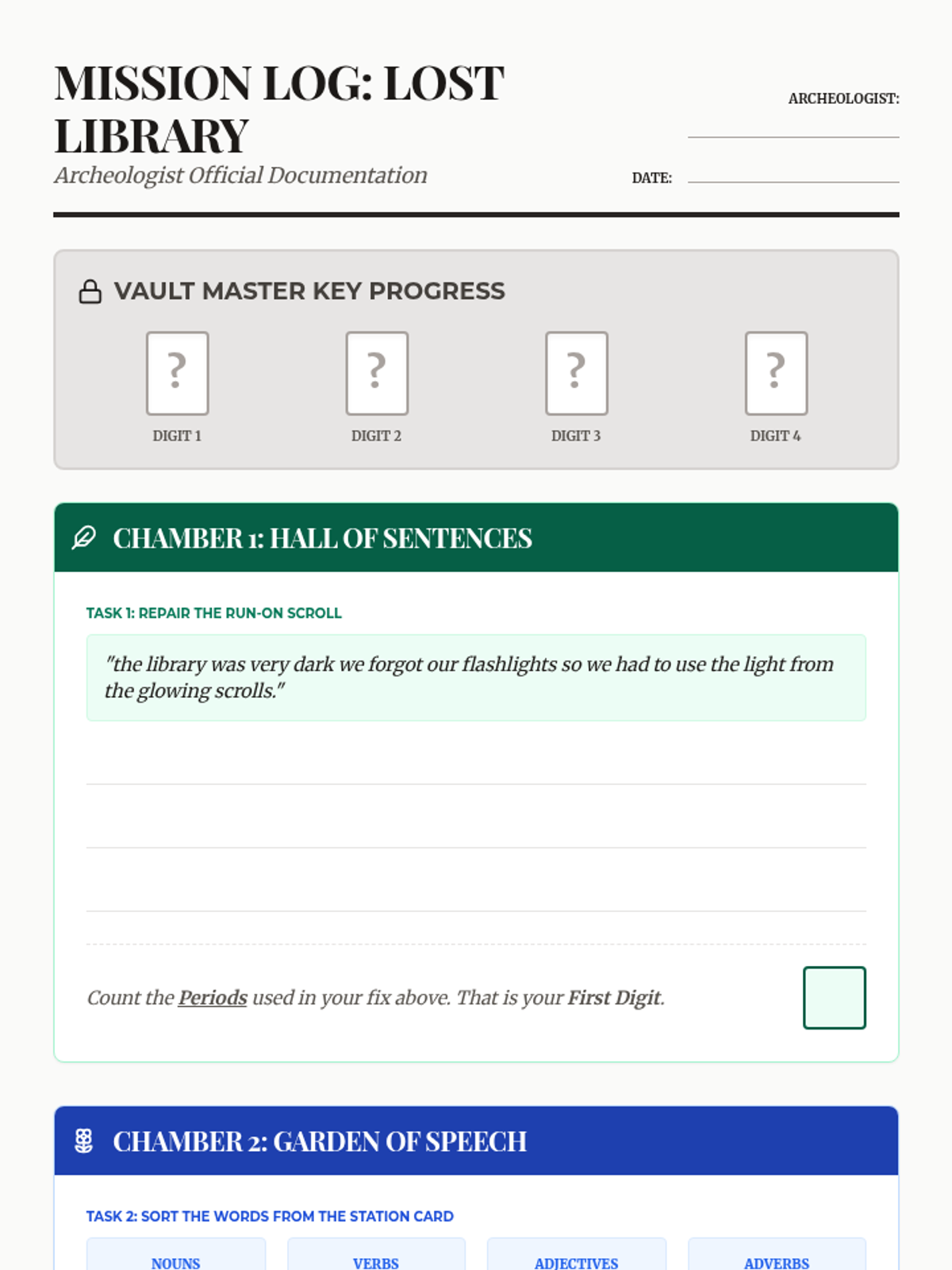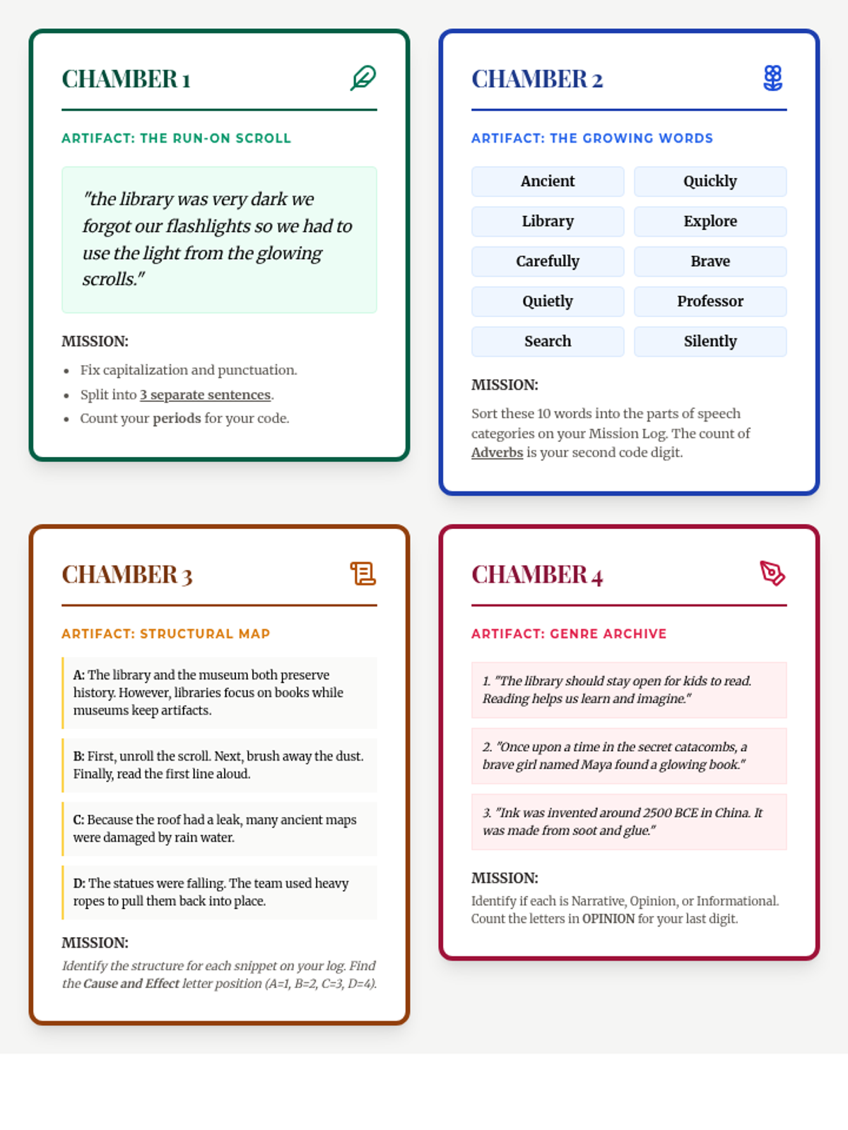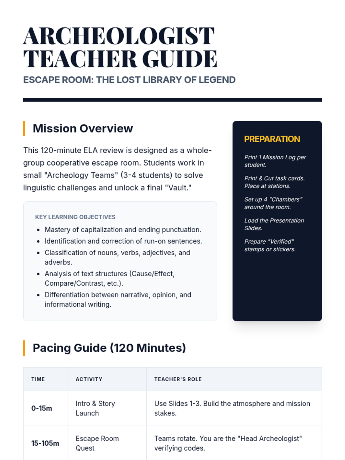 A high-energy, 120-minute whole-group escape room where students act as Linguistic Archeologists to save the Lost Library of Legend. This lesson reviews 4th-grade ELA standards including sentence structure, parts of speech, text structures, and writing genres.