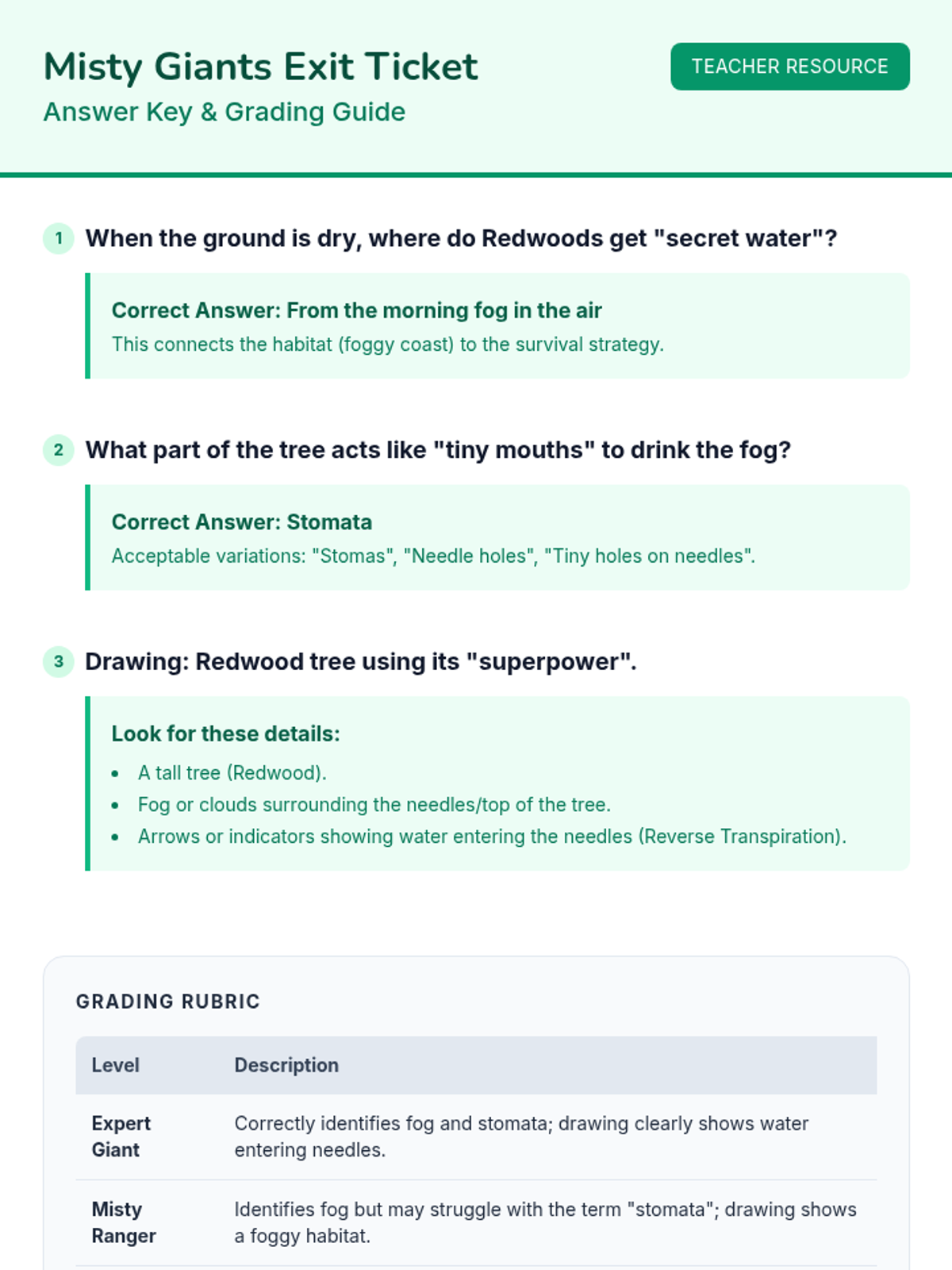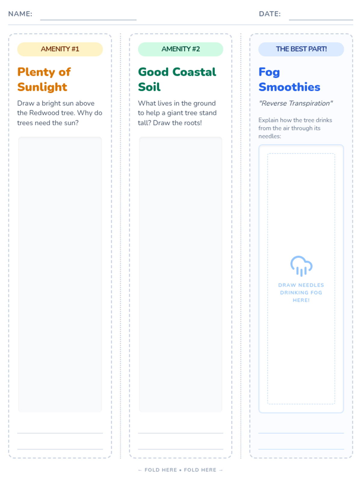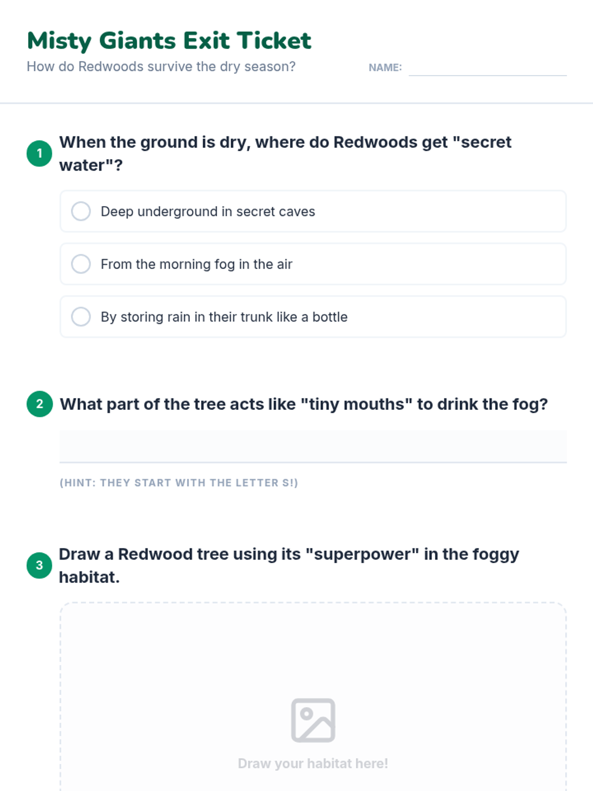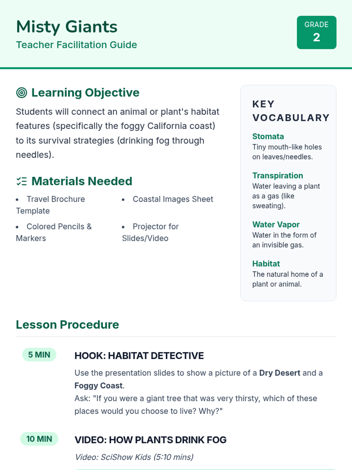 A 2nd-grade science lesson exploring how Redwood trees survive California's dry season by 'drinking' fog through their needles. Students will learn about stomata and reverse transpiration before creating a persuasive travel brochure for a thirsty tree.