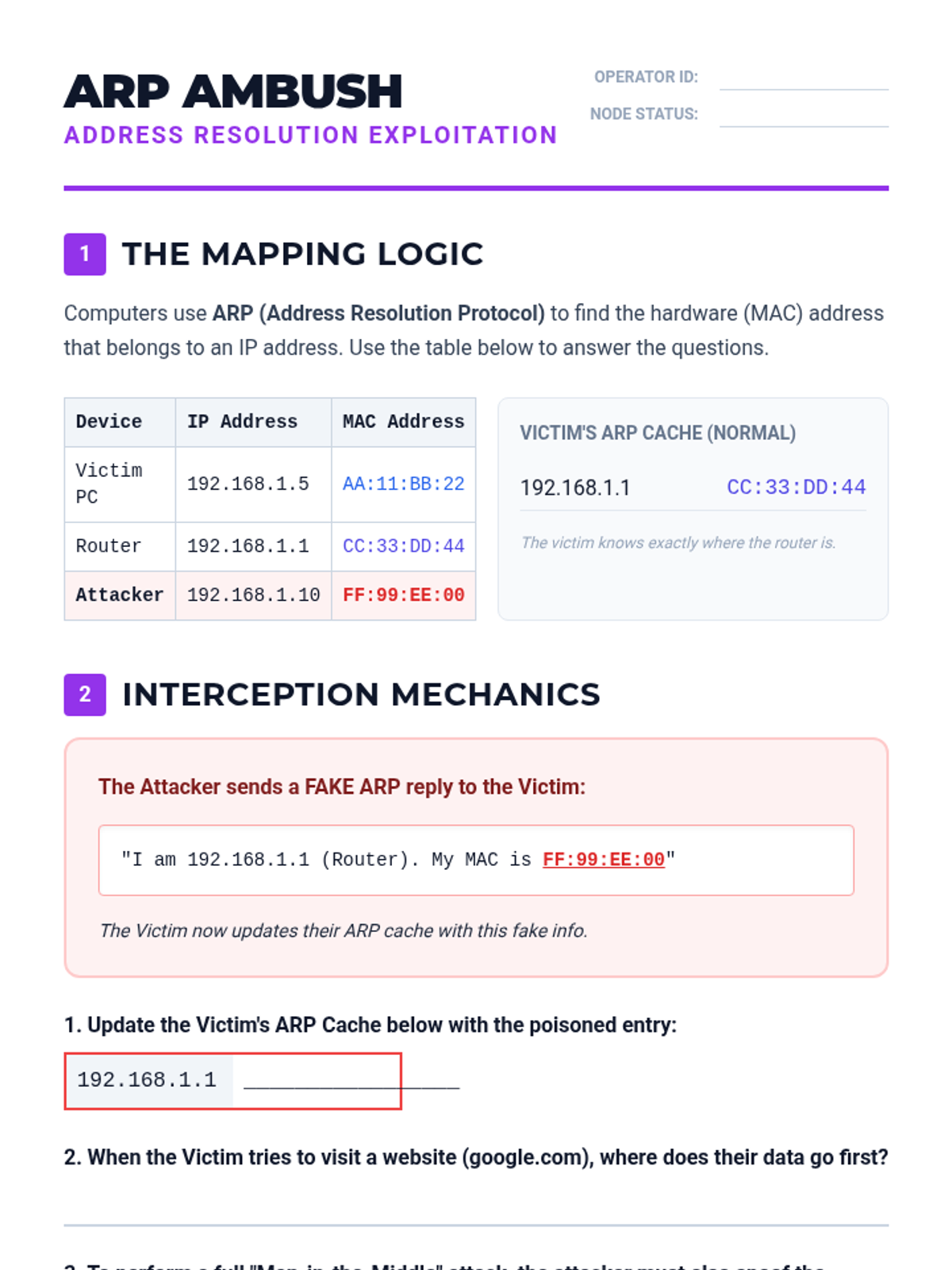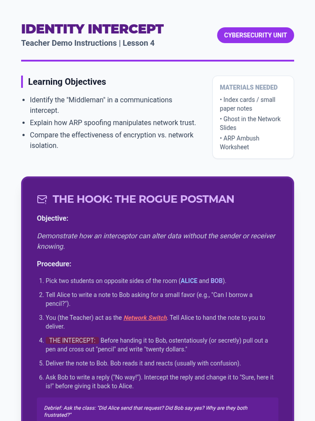 This lesson covers how attackers insert themselves between two communicating parties. Students learn the mechanics of ARP spoofing on a local network and discuss strategies for detection and prevention.