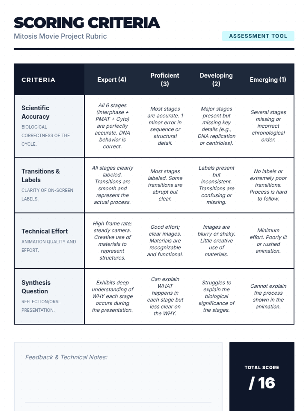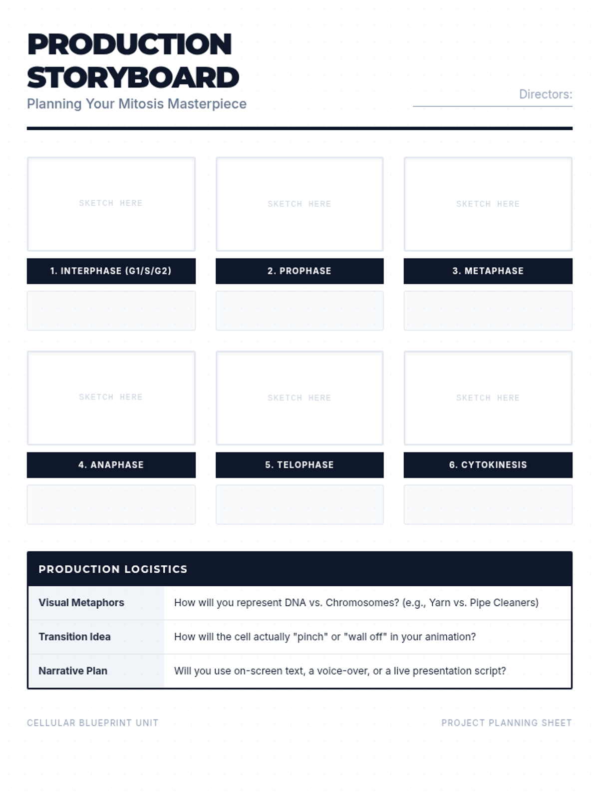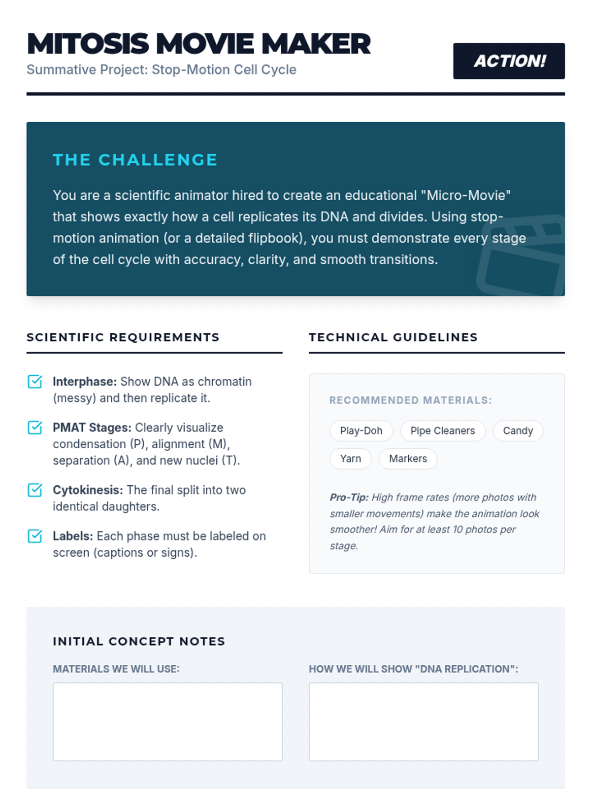 A synthesis project where students create a stop-motion animation to demonstrate their mastery of the cell cycle's chronological sequence.