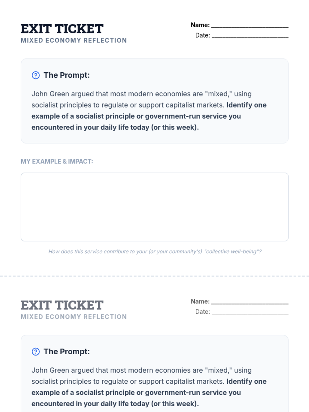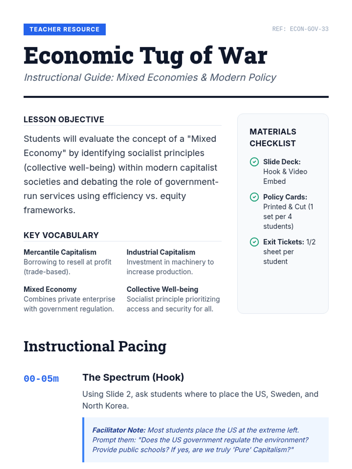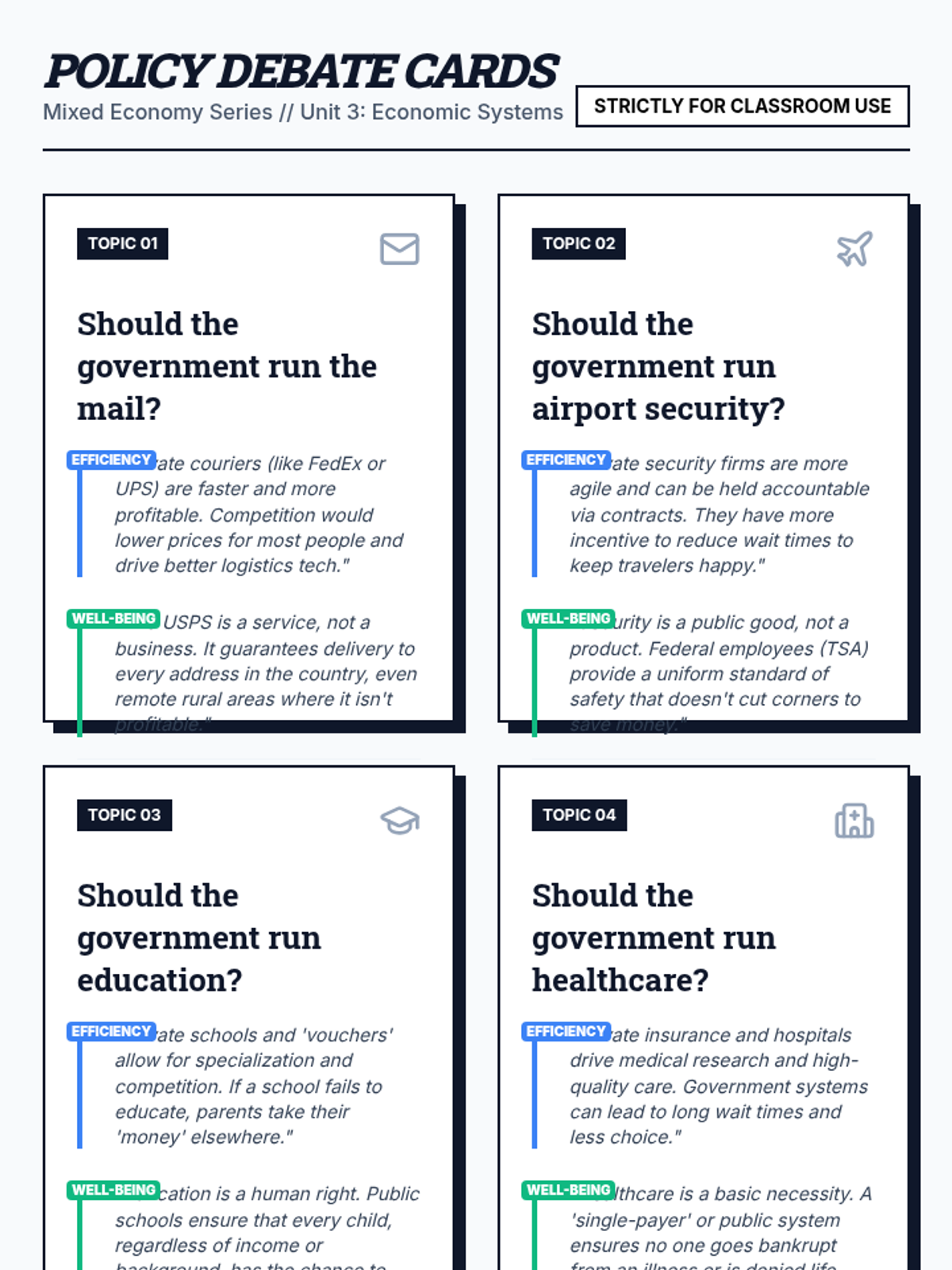 An interactive High School Economics/Government lesson exploring the blend of capitalist and socialist principles in modern mixed economies. Students evaluate government-run services through the lenses of efficiency and collective well-being.