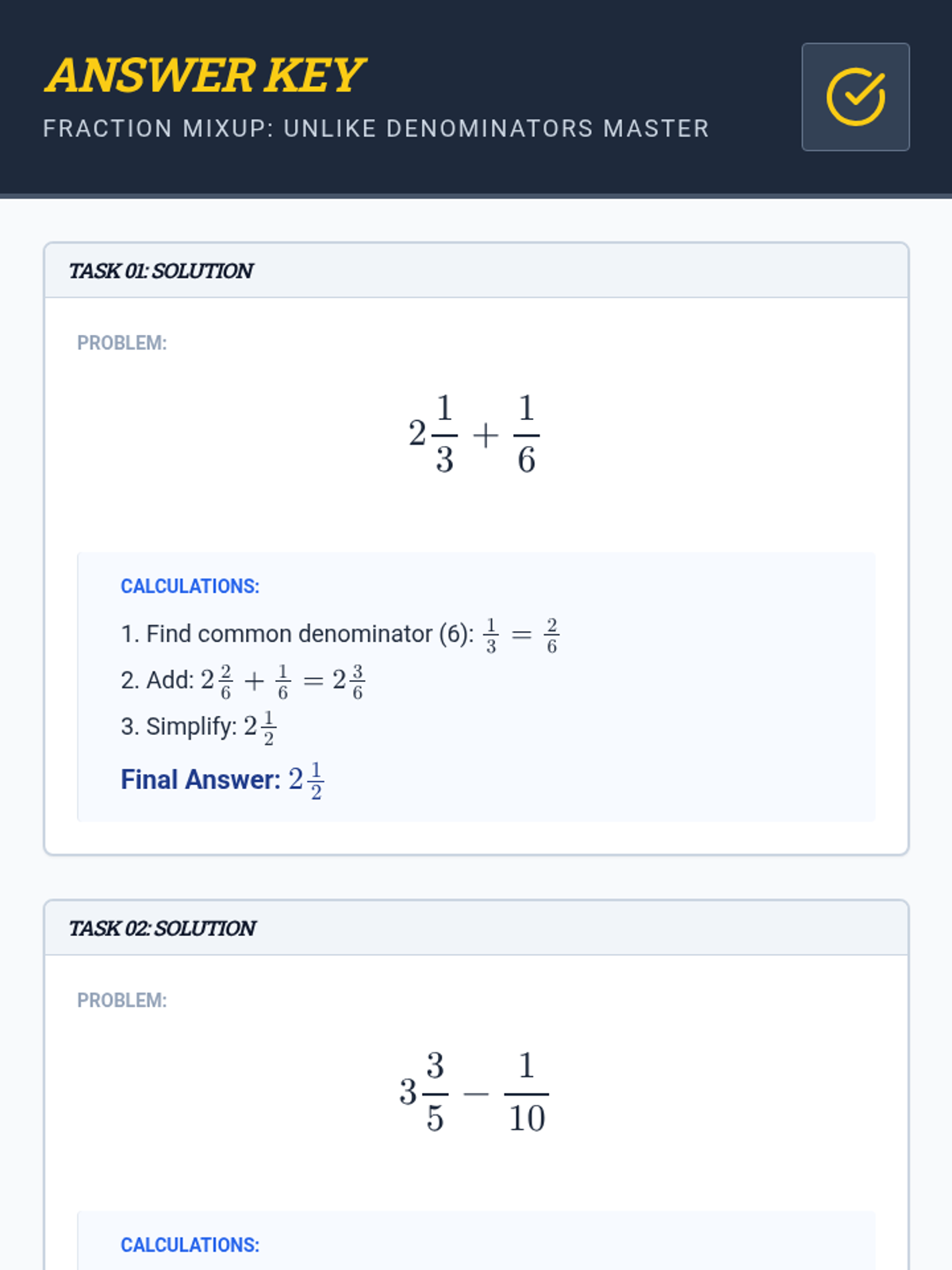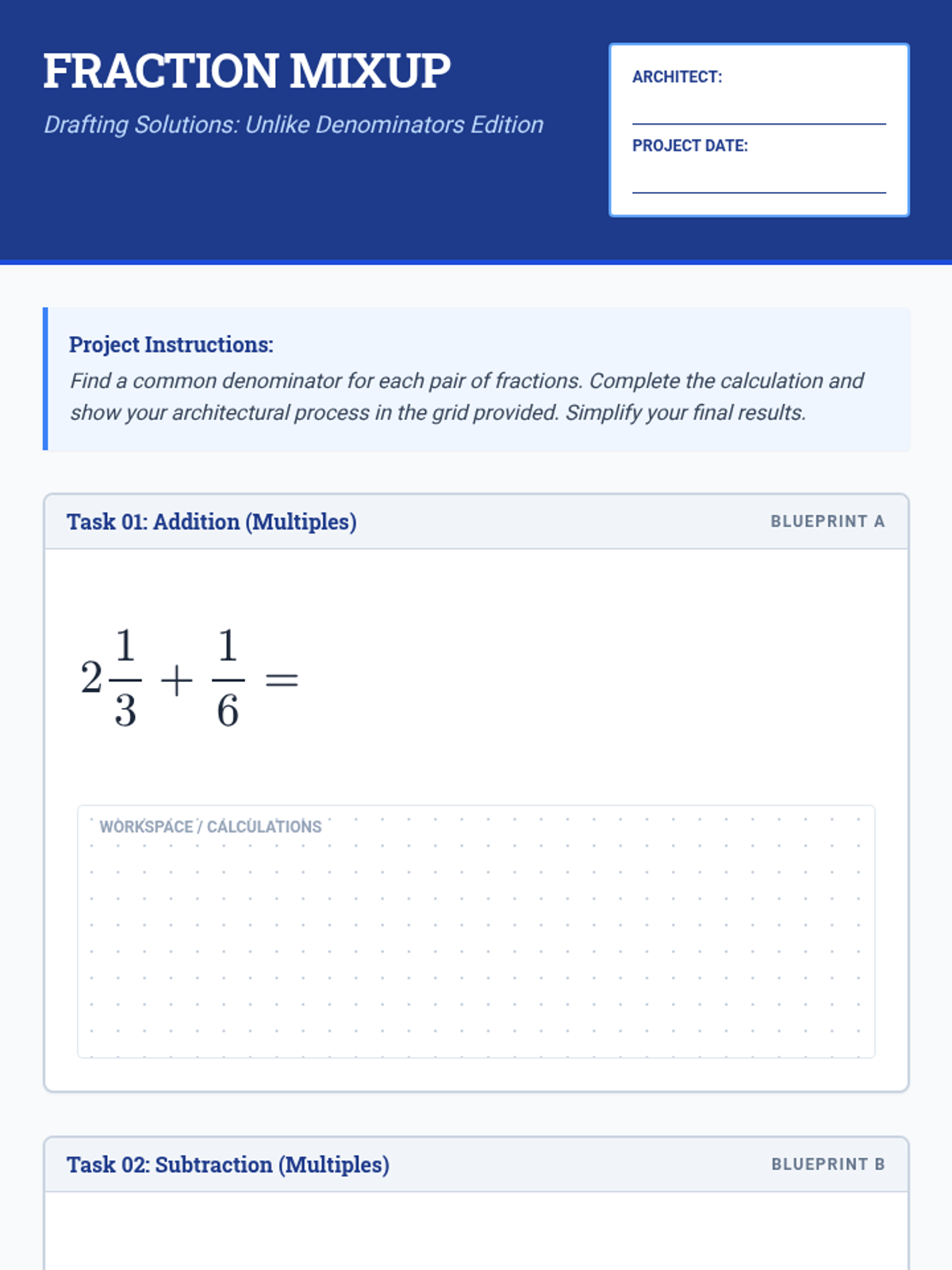 A focused practice session on adding and subtracting mixed numbers with proper fractions, featuring step-by-step workspace for student calculation.