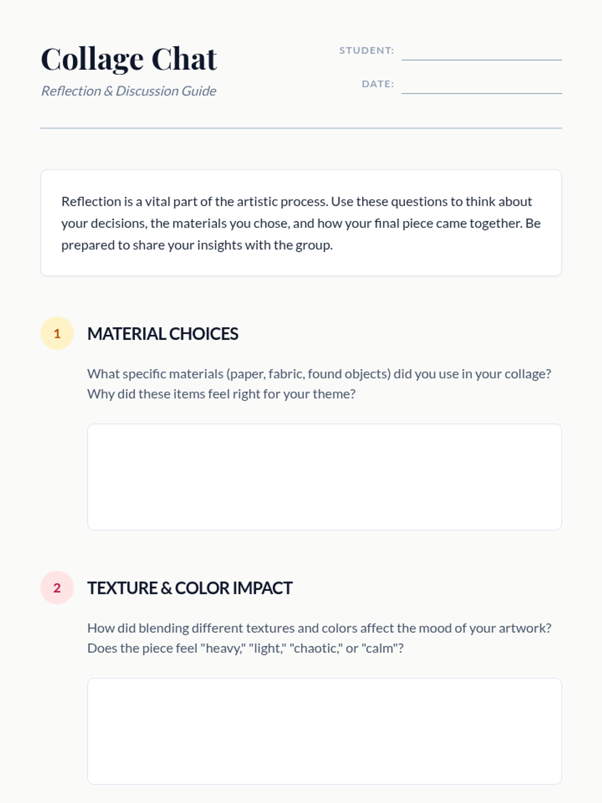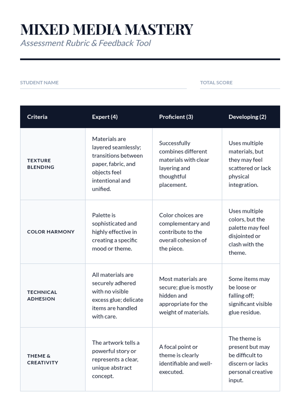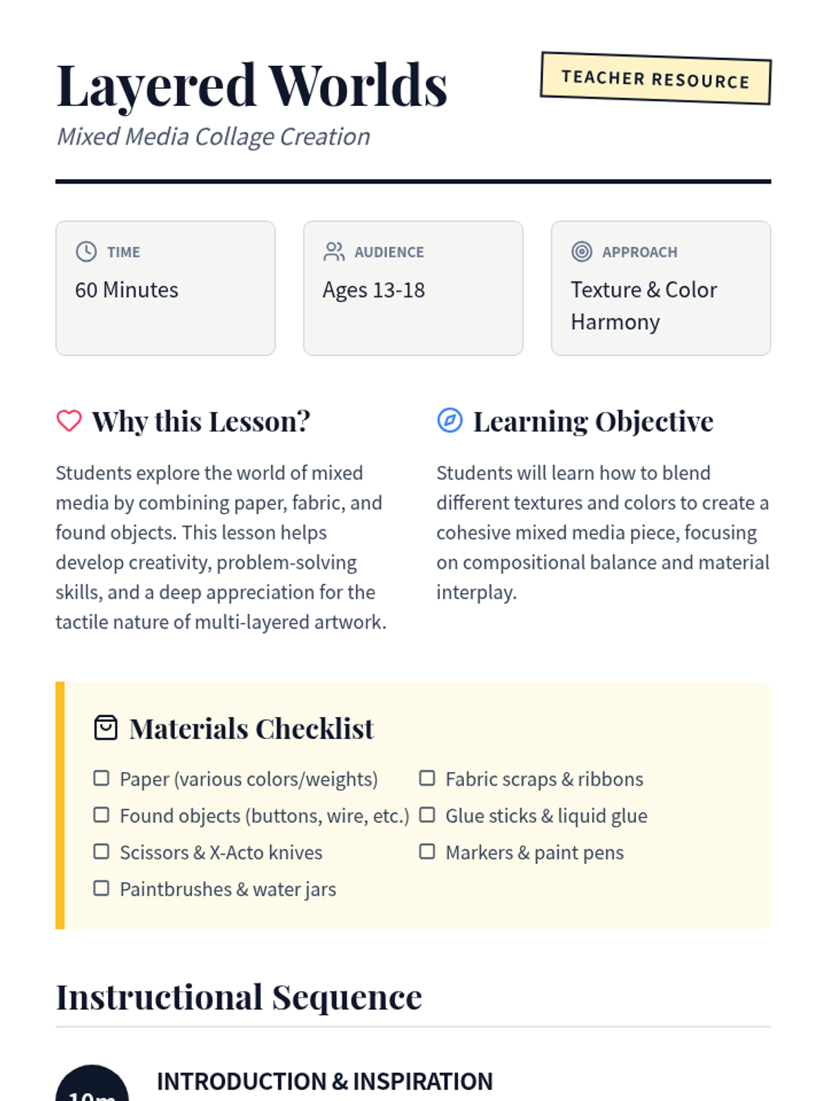 Students explore the world of mixed media by combining paper, fabric, and found objects. This lesson focuses on texture, color harmony, and creative problem-solving to produce cohesive, multi-layered artworks.