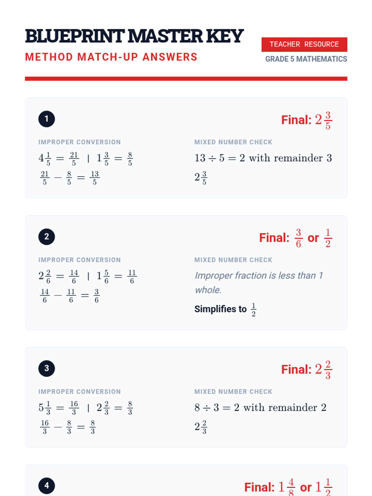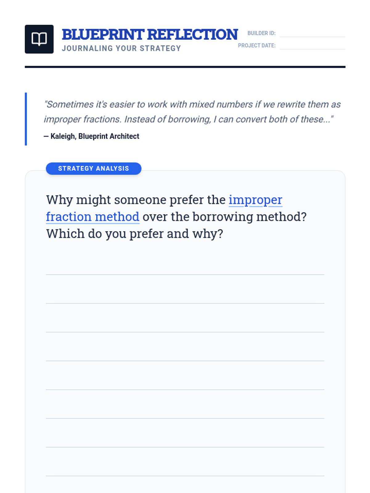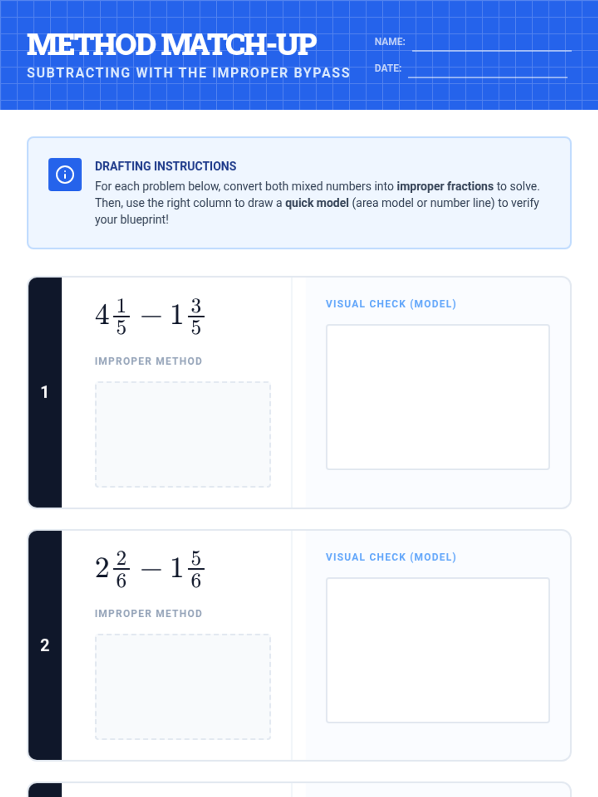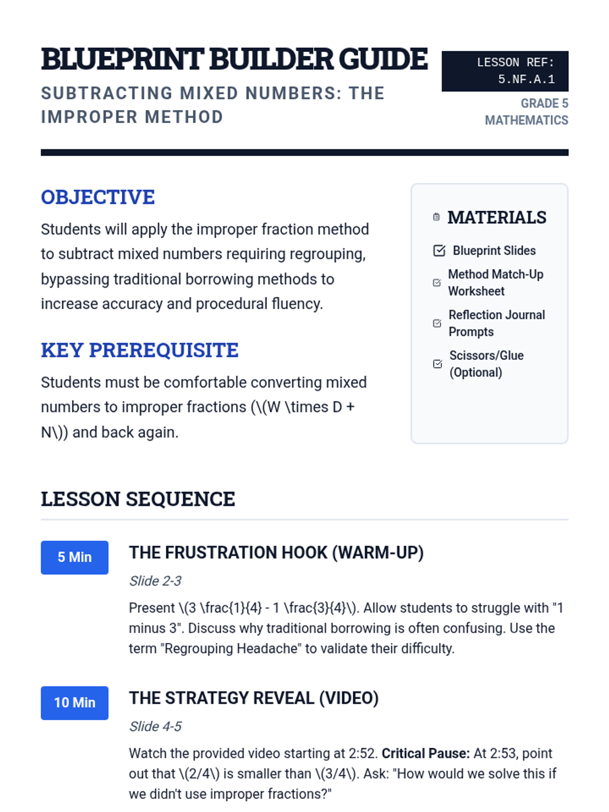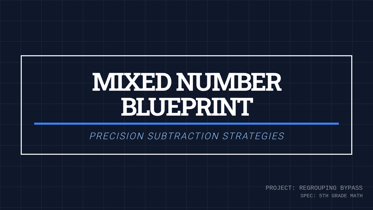 A 5th-grade math lesson focused on subtracting mixed numbers by converting them to improper fractions, specifically designed to bypass the difficulties of regrouping/borrowing. Students will watch a instructional video, practice the 'Improper Method', and verify their results with visual models.