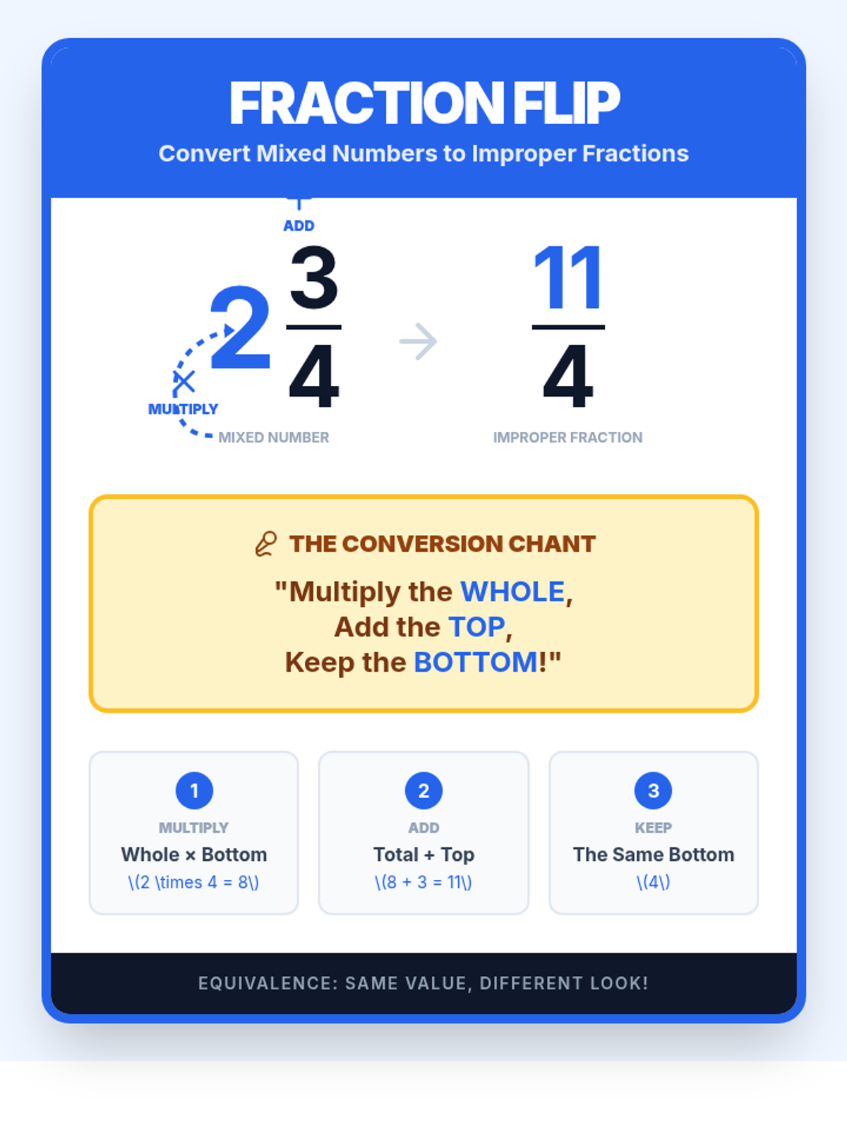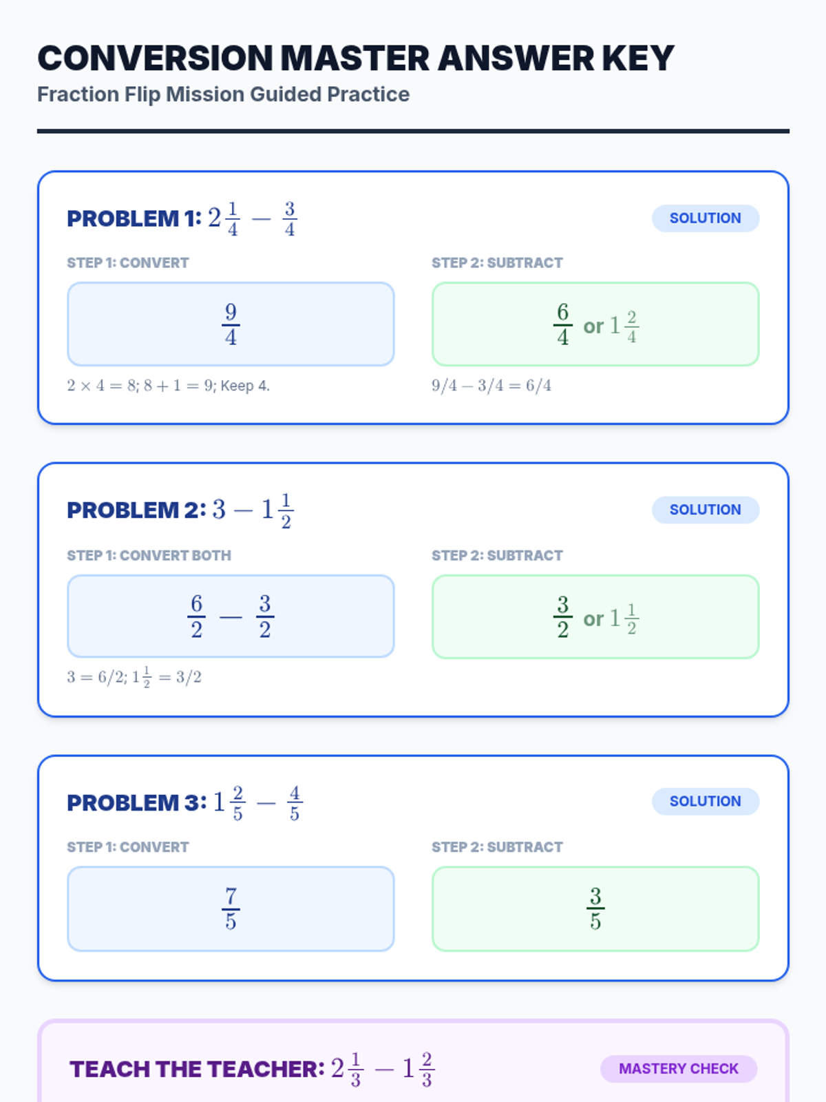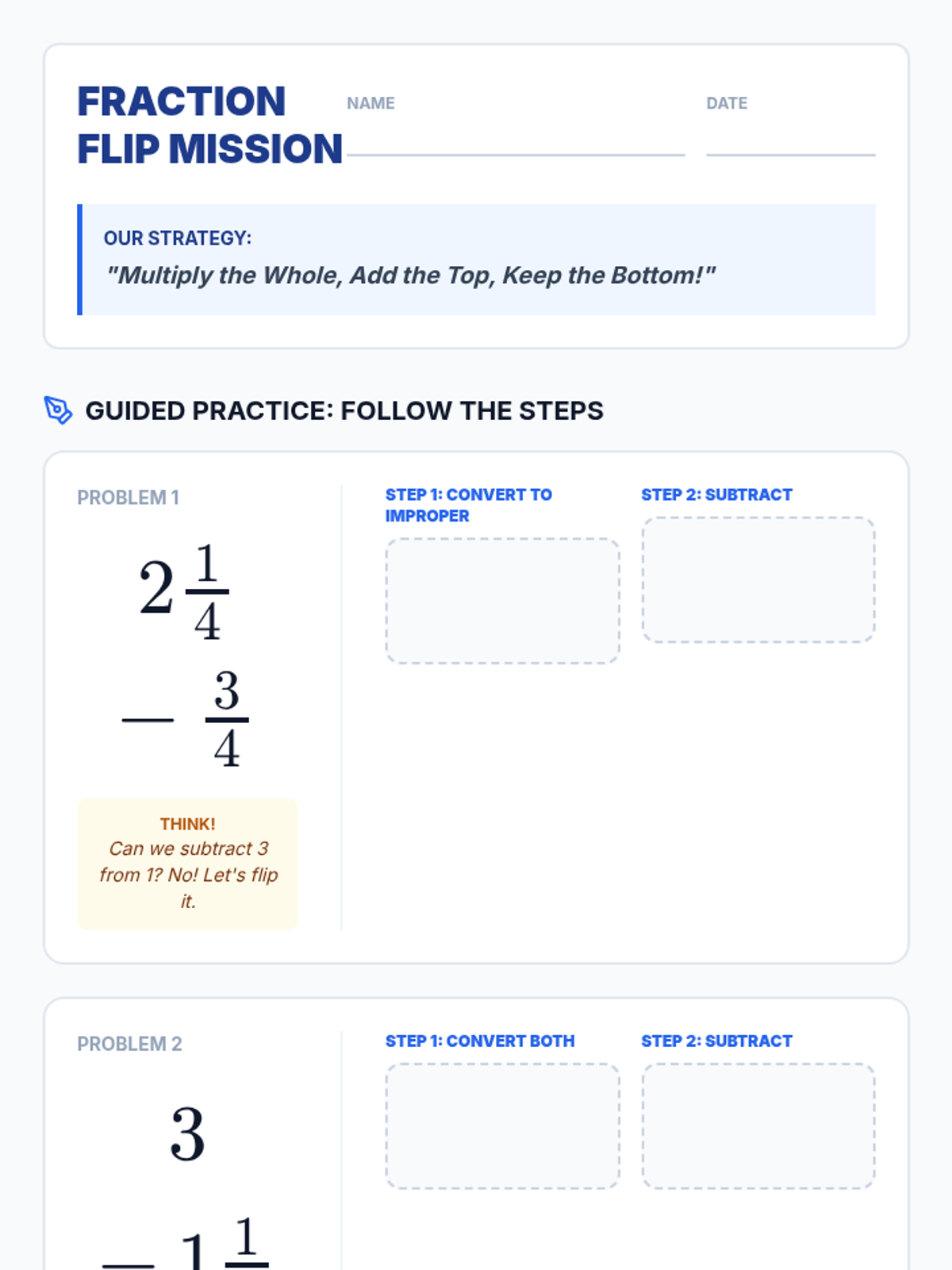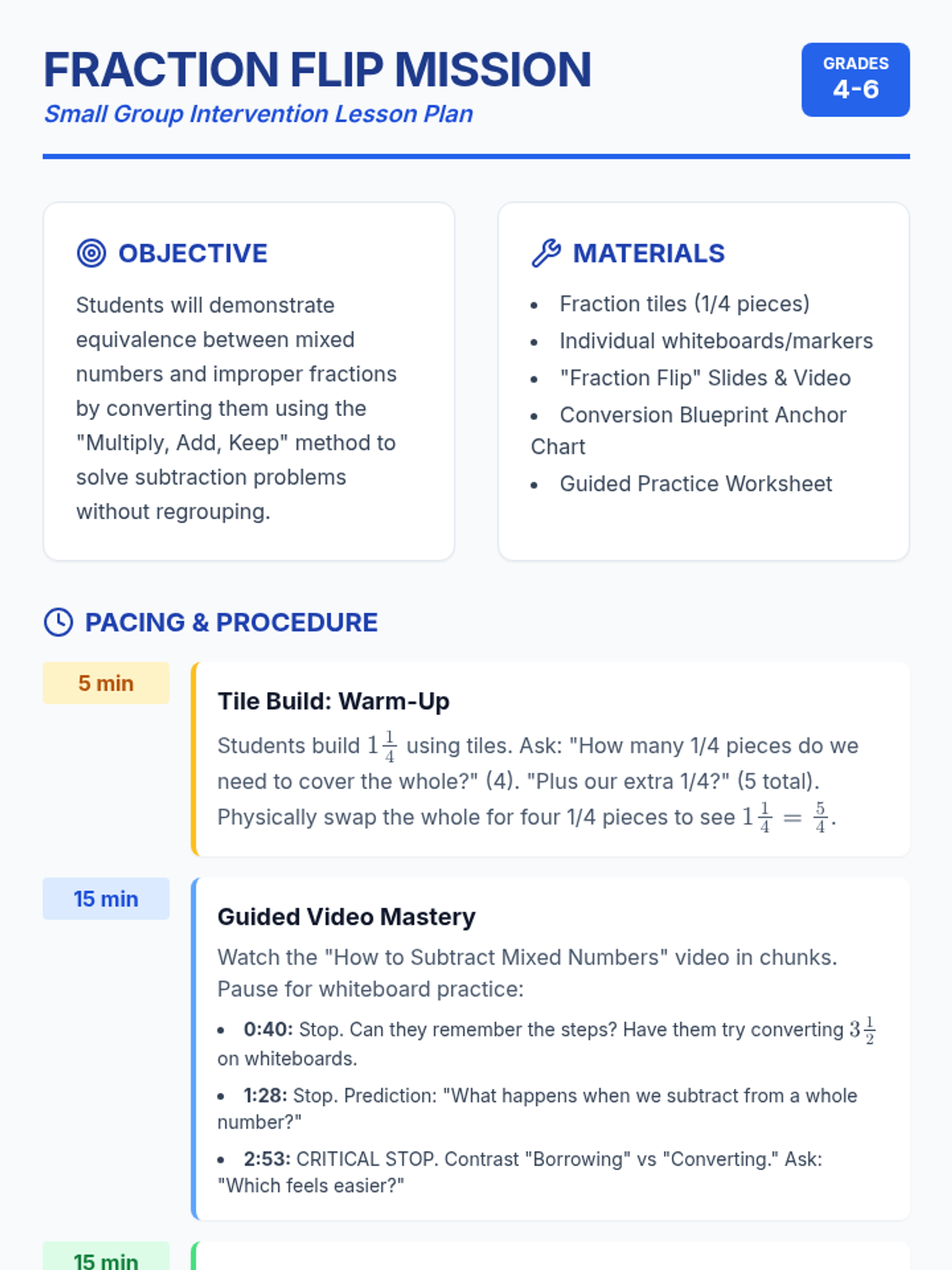 This lesson focuses on converting mixed numbers to improper fractions to simplify subtraction. Designed for small group intervention, it utilizes hands-on manipulatives, a step-by-step video, and a catchy mnemonic chant to support struggling 4th-6th grade learners.