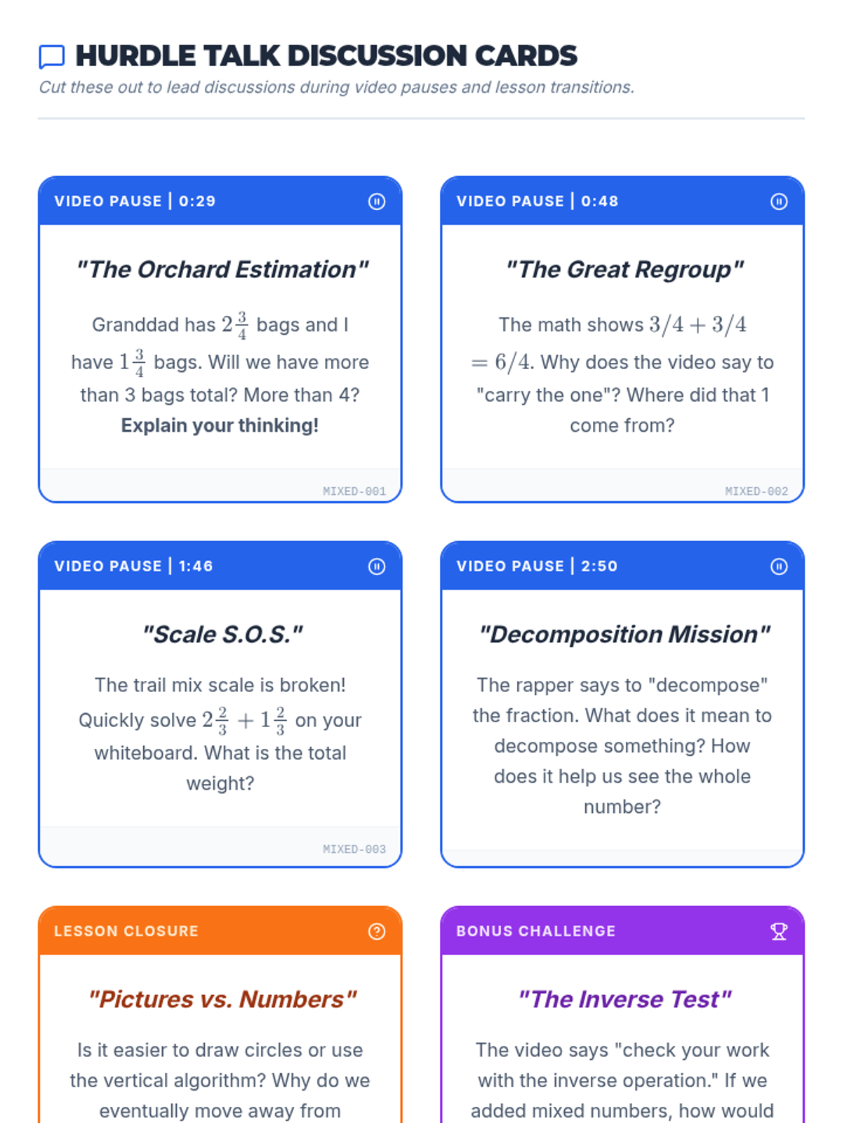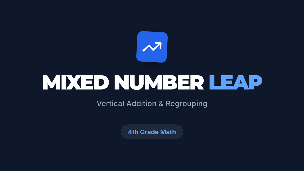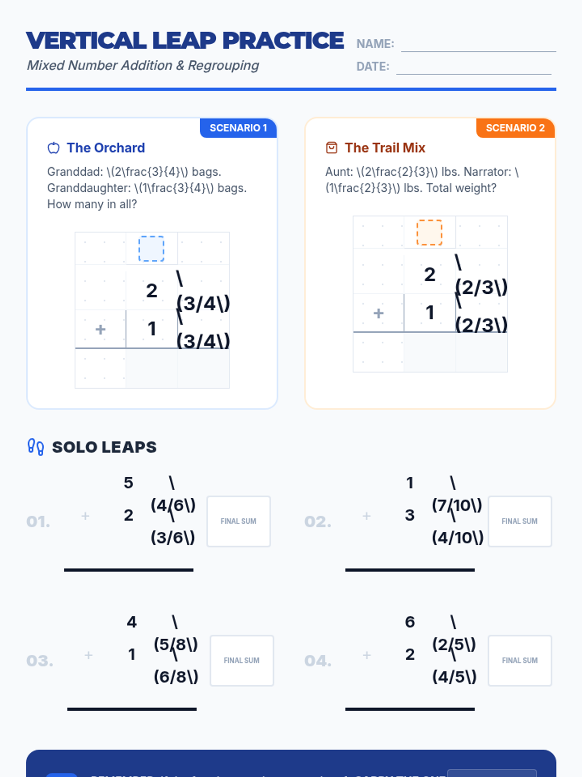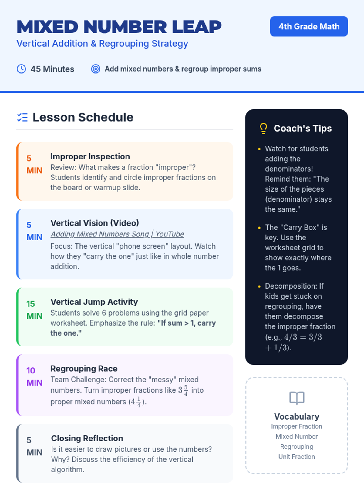 A 4th-grade math lesson focused on the algorithmic addition of mixed numbers with like denominators, specifically emphasizing regrouping (carrying) when fraction sums exceed one whole. Students use a vertical grid layout to maintain place value and learn to convert improper fractions back into mixed numbers.