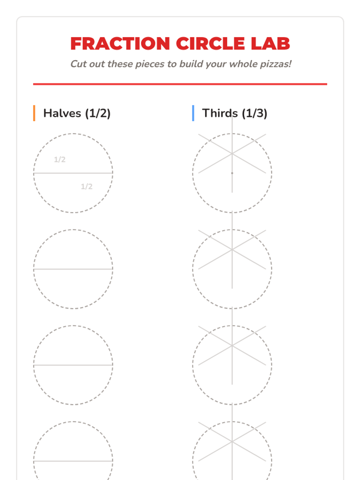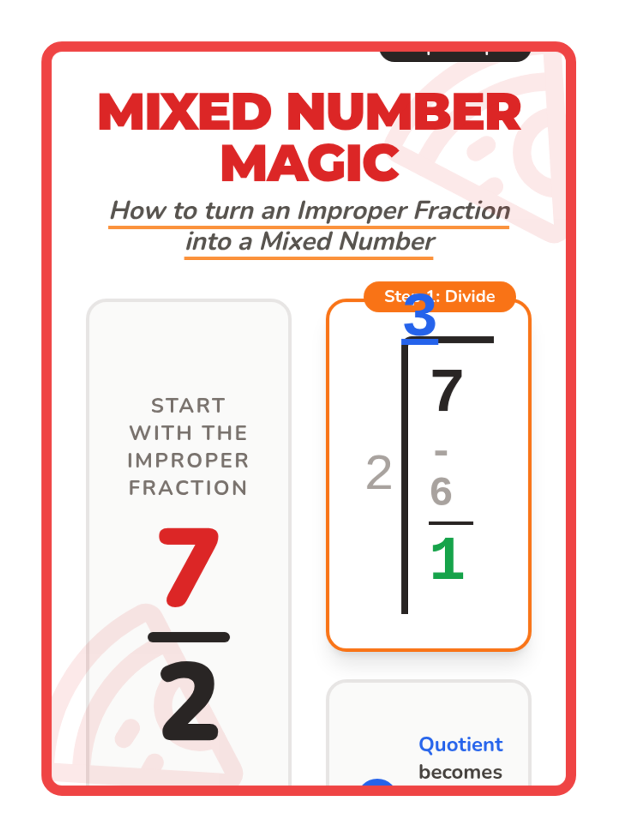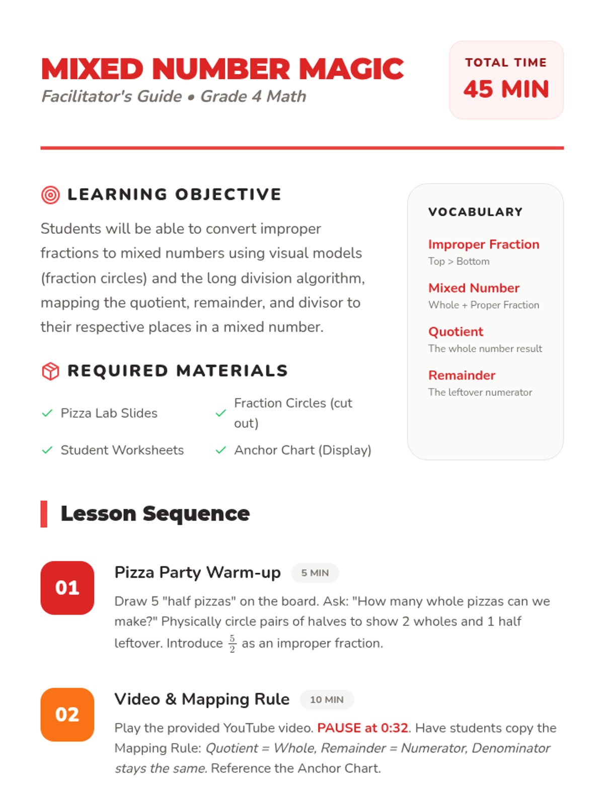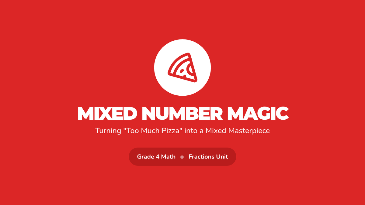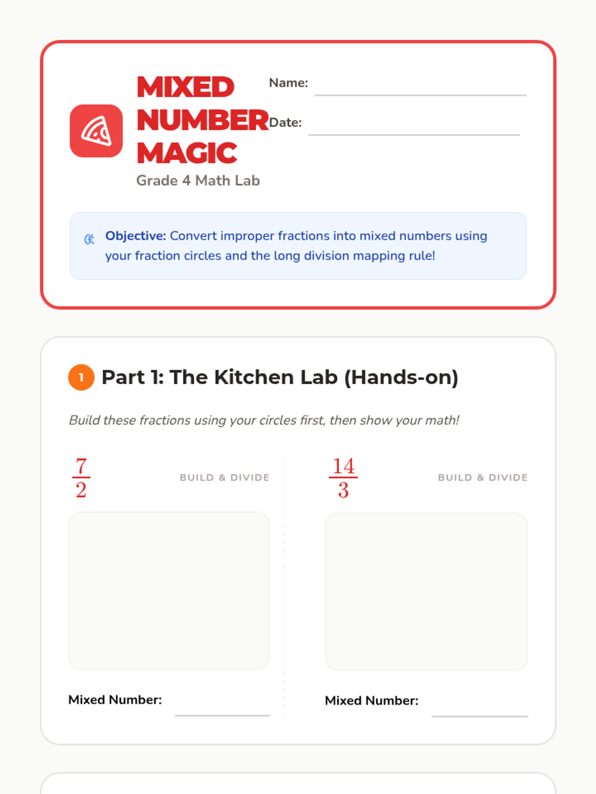 Students will master converting improper fractions to mixed numbers using a combination of hands-on fraction circle manipulatives and the long division algorithm, supported by a pizza-themed narrative.