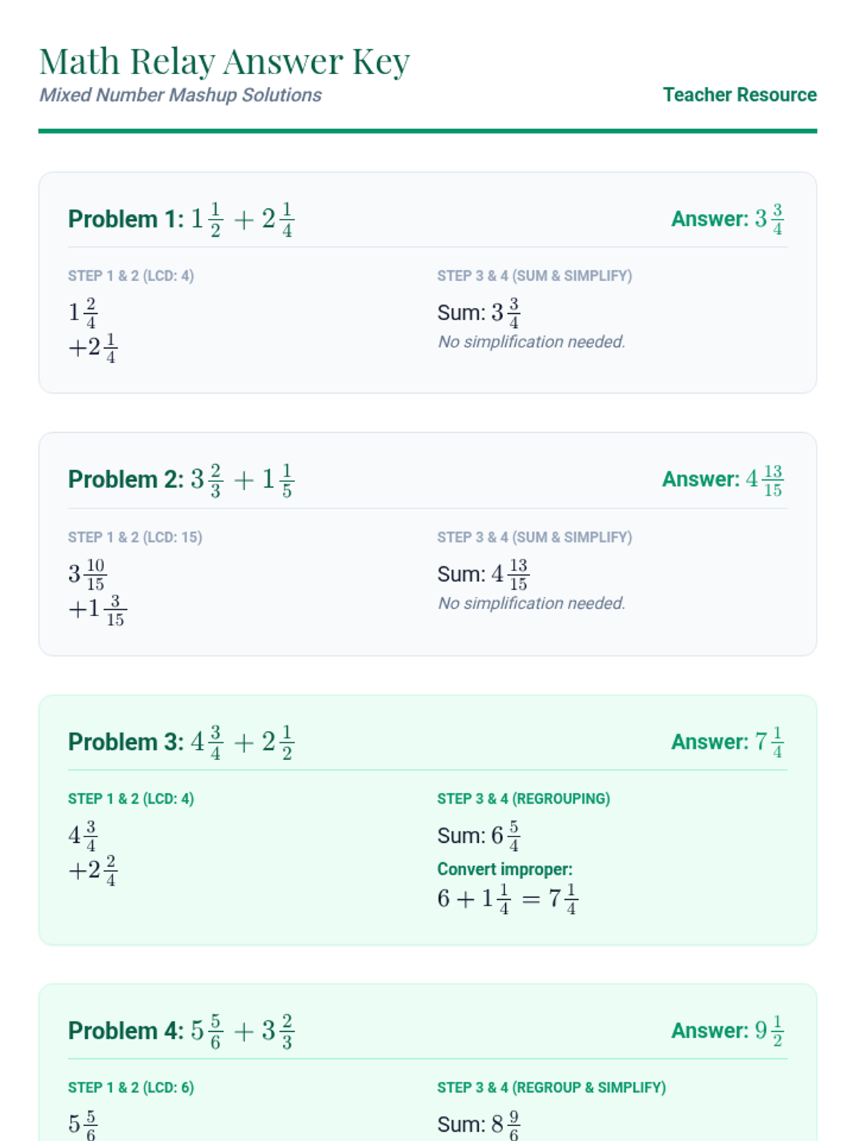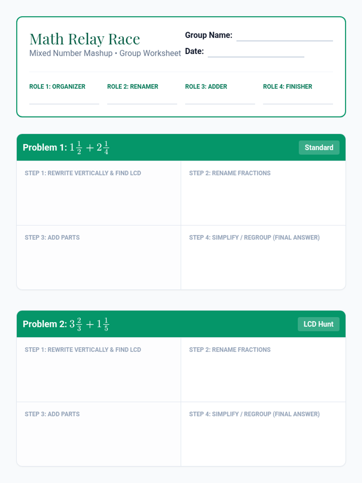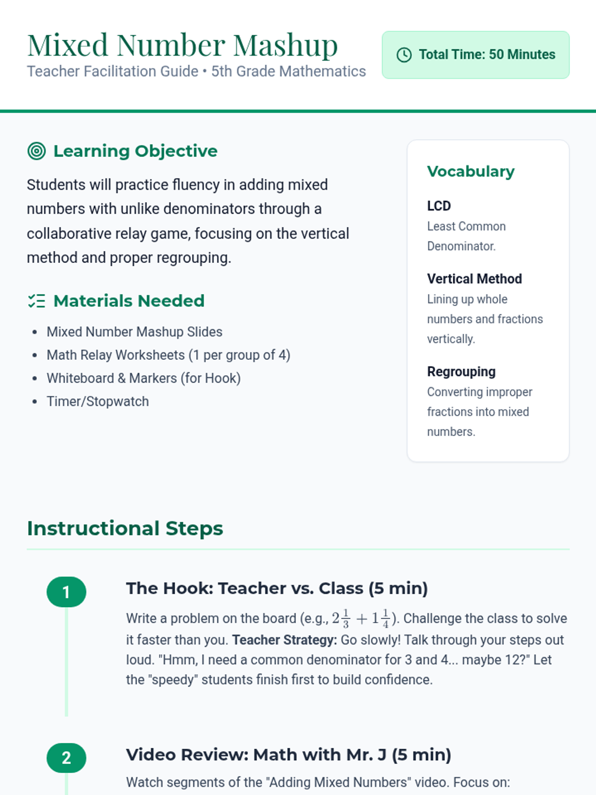 A high-energy 5th-grade math lesson where students master adding mixed numbers with unlike denominators using the 'Vertical Method.' Through a teacher-vs-class race, a video review, and a four-person relay activity, students build fluency and collaborative problem-solving skills.