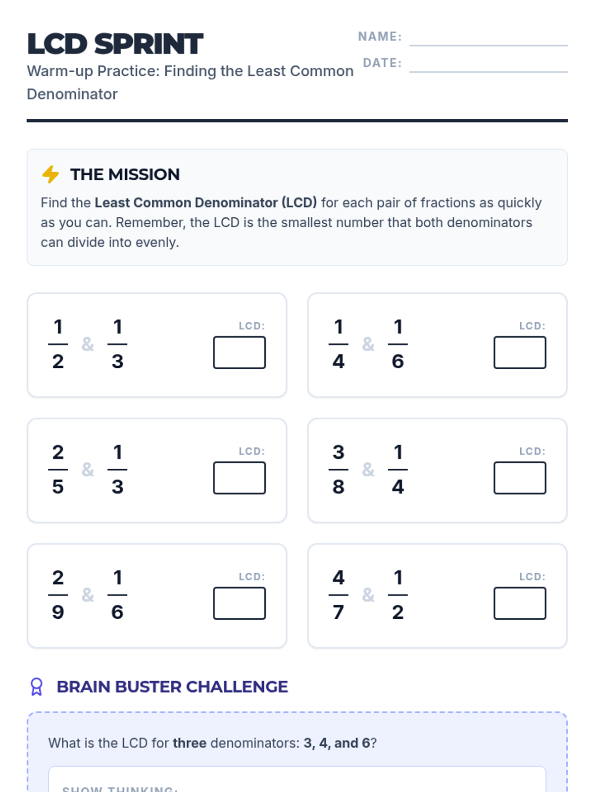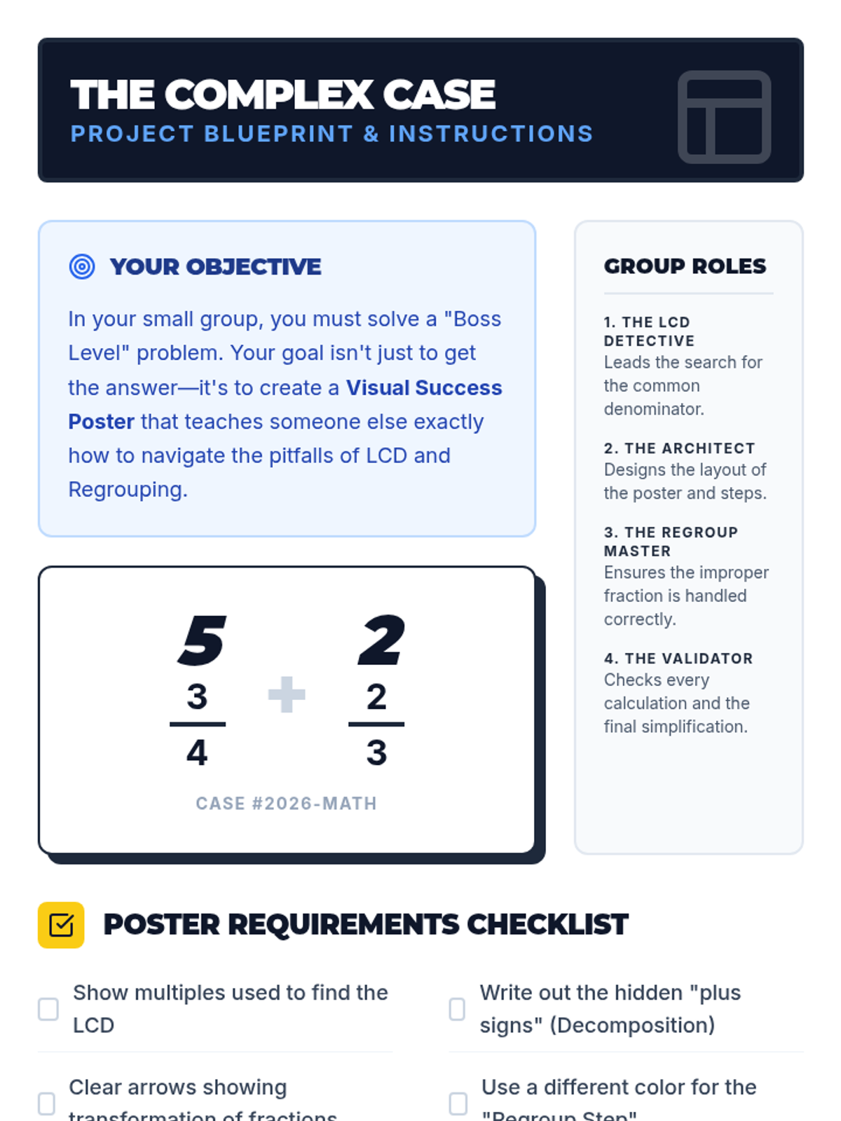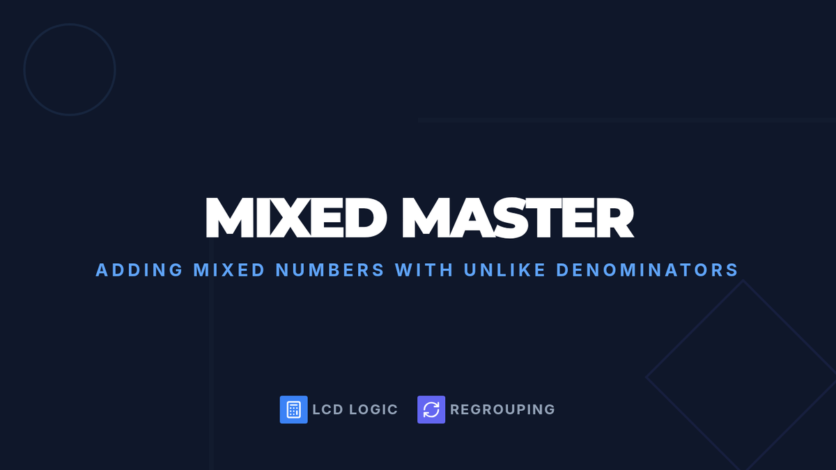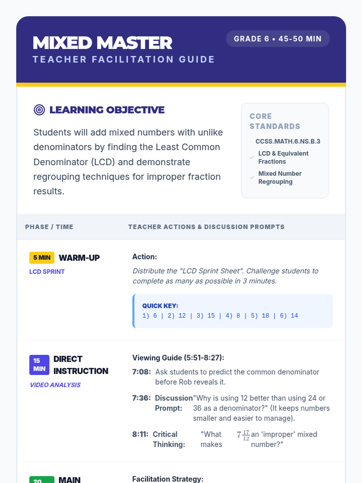 A 6th-grade math lesson focused on adding mixed numbers with unlike denominators. Students will master finding the Least Common Denominator (LCD) and handling regrouping through a high-energy warm-up, a scaffolded video walkthrough, and a collaborative 'Boss Level' problem-solving activity.