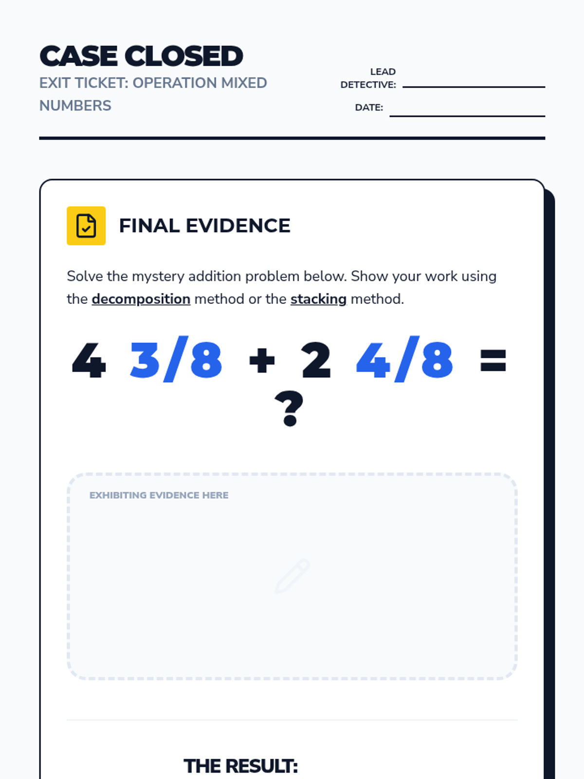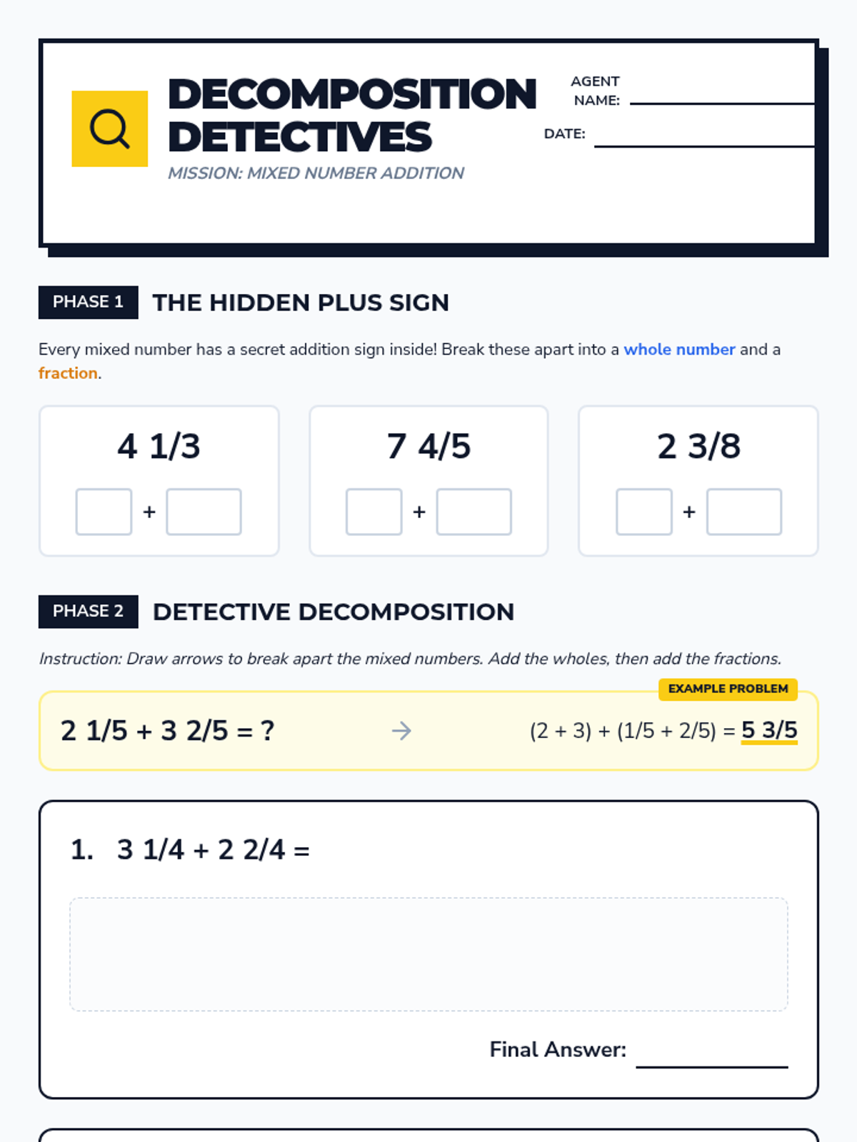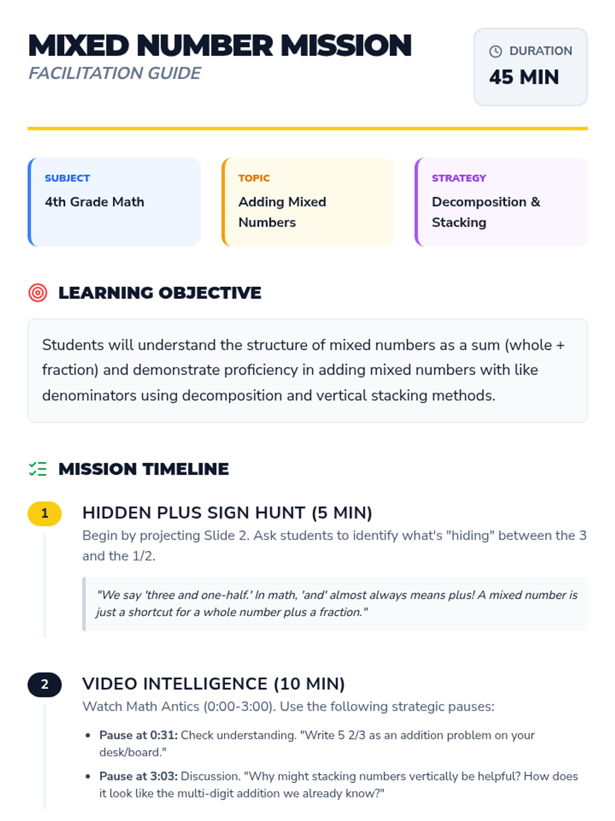 A 4th-grade math lesson that introduces mixed numbers as the sum of a whole number and a fraction, teaching students to add mixed numbers with like denominators using decomposition and vertical stacking.