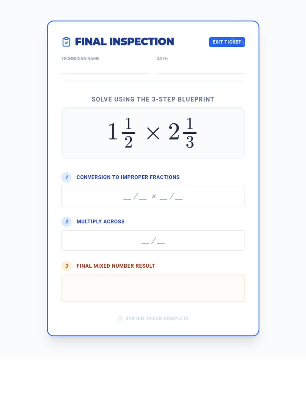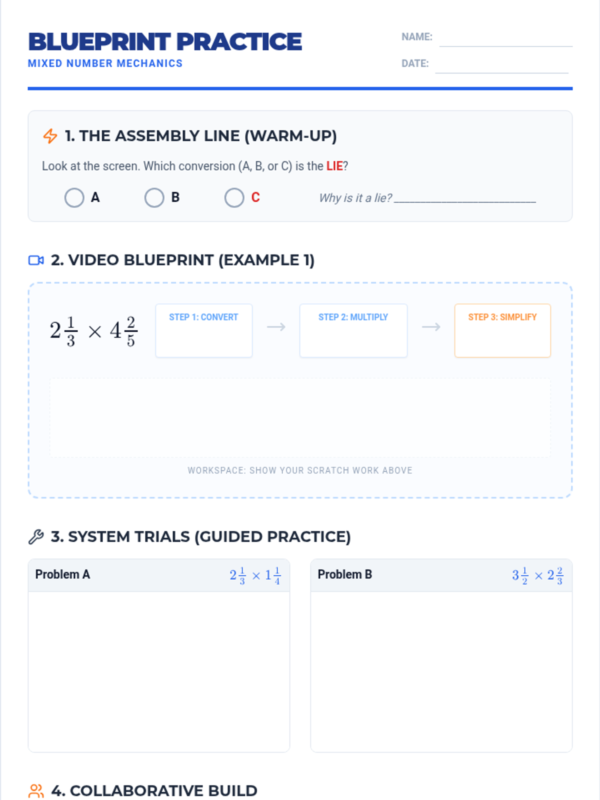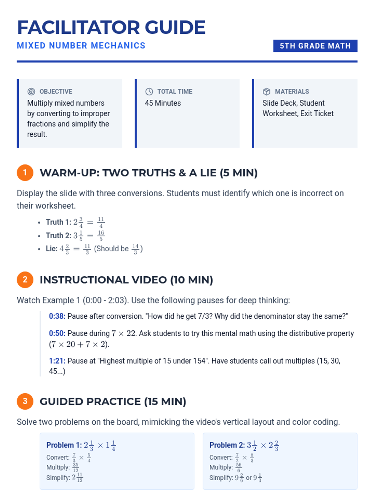 A comprehensive lesson on multiplying mixed numbers by converting to improper fractions, featuring a step-by-step algorithm, a 'Two Truths and a Lie' warm-up, and guided partner practice.