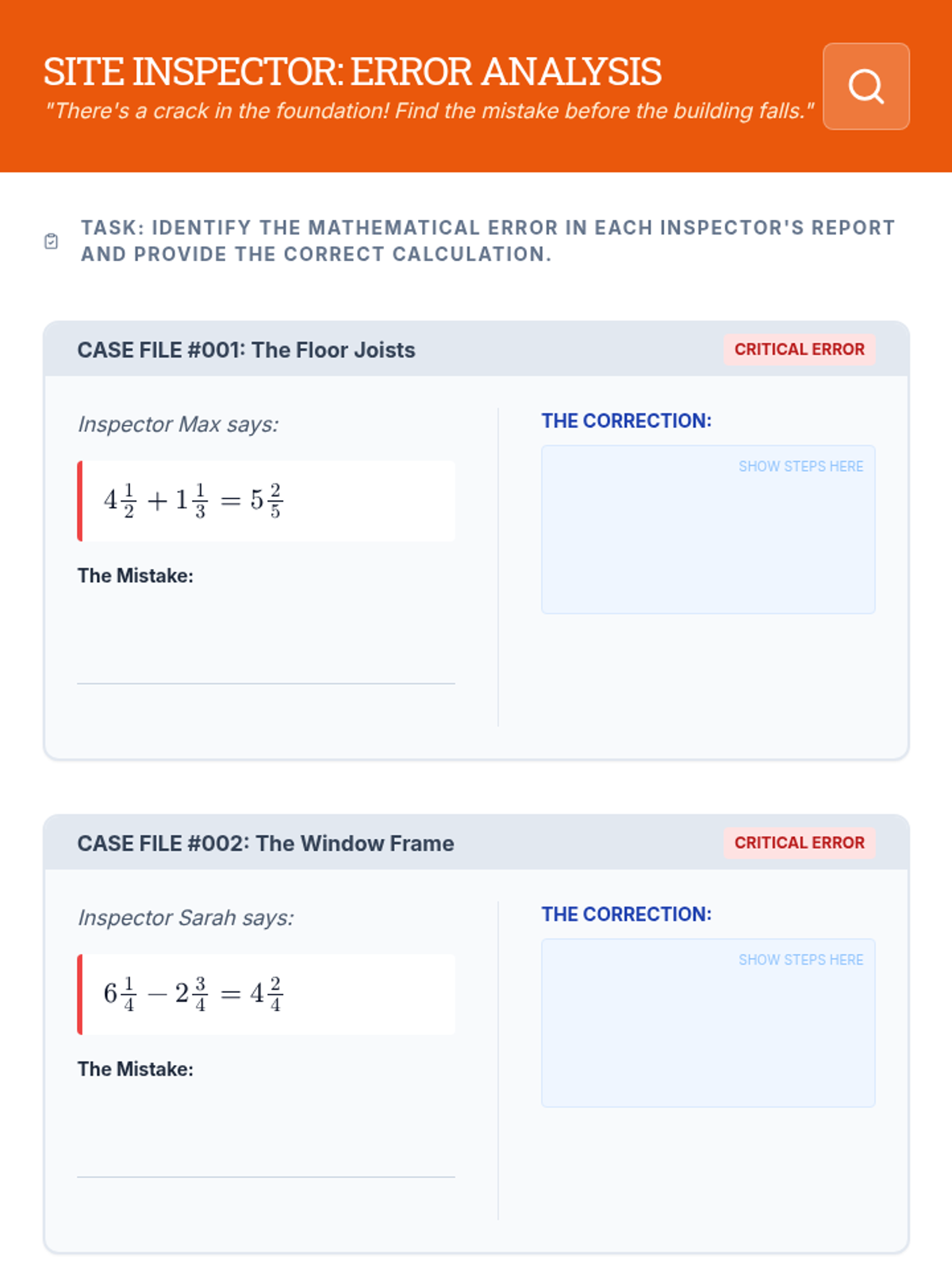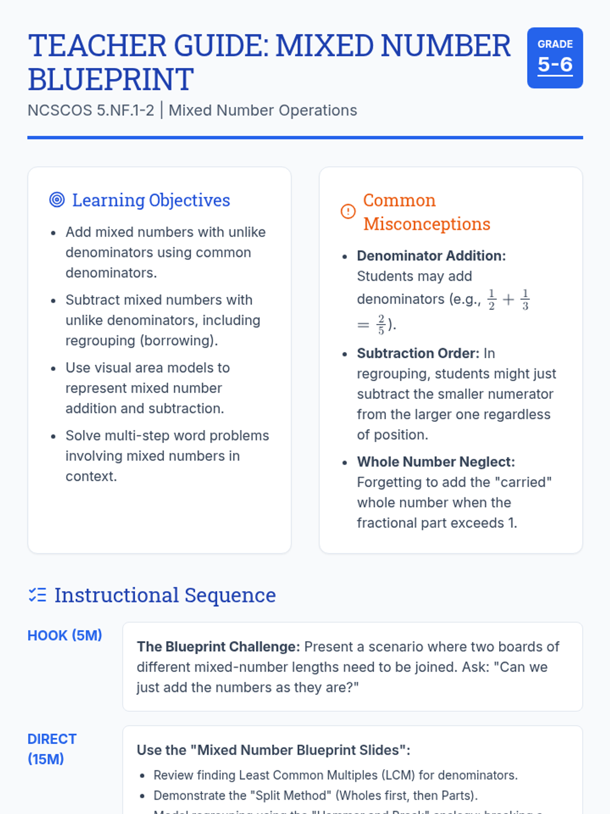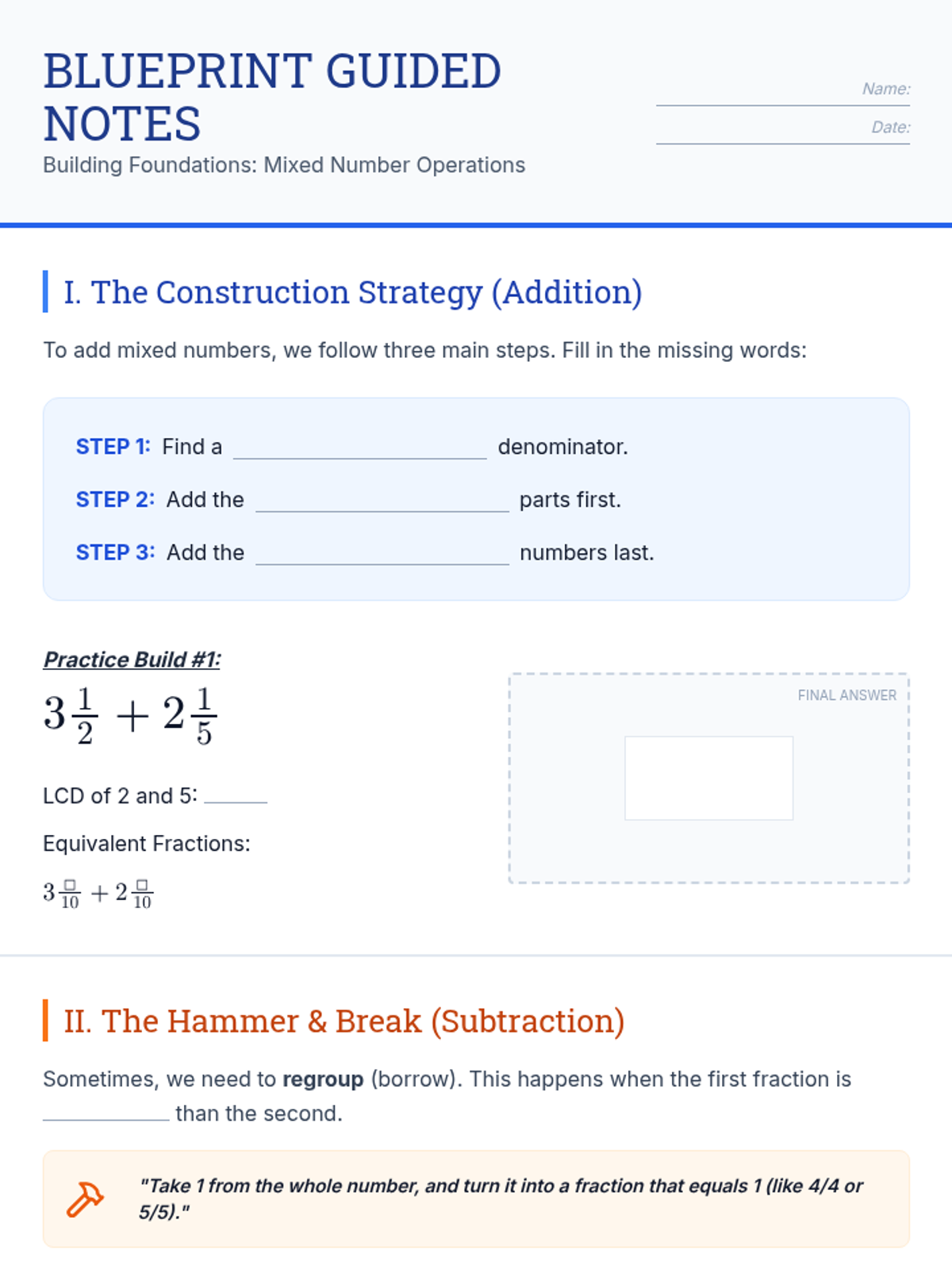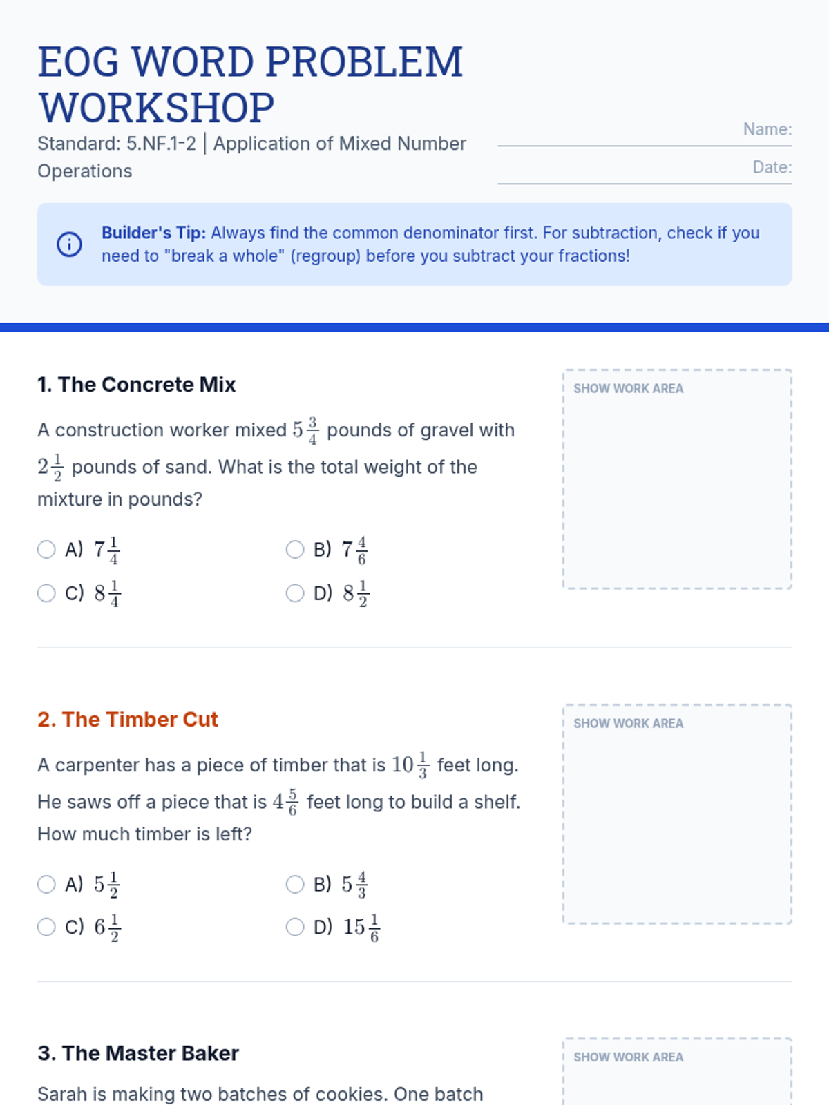 A comprehensive lesson on adding and subtracting mixed numbers with unlike denominators, featuring visual models, regrouping strategies, and EOG-style word problems within a 'Master Builder' workshop theme.