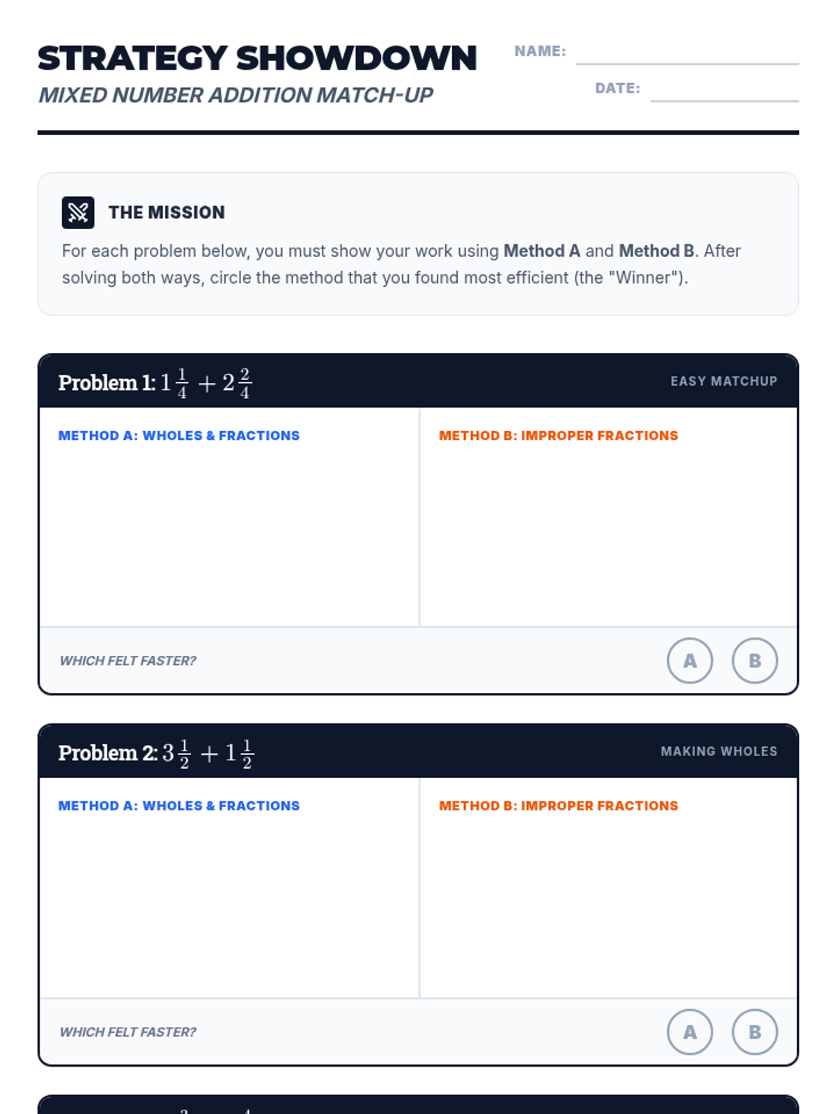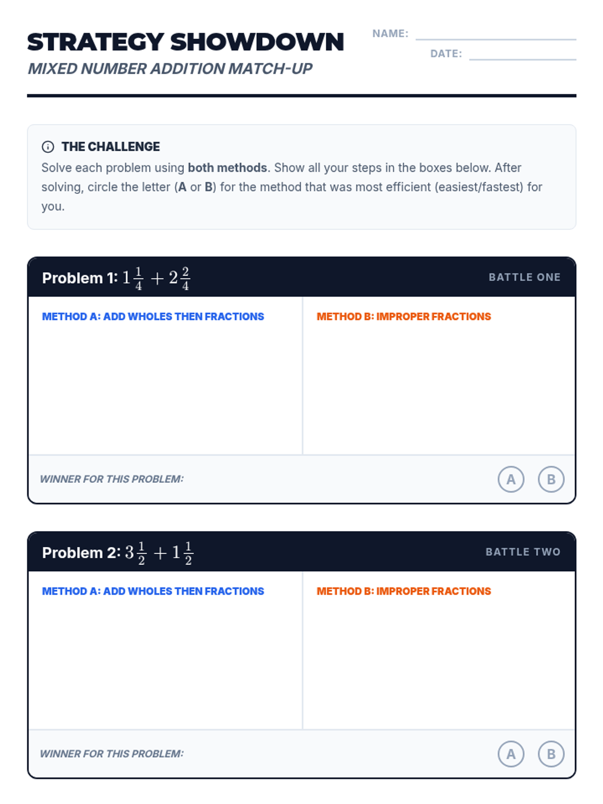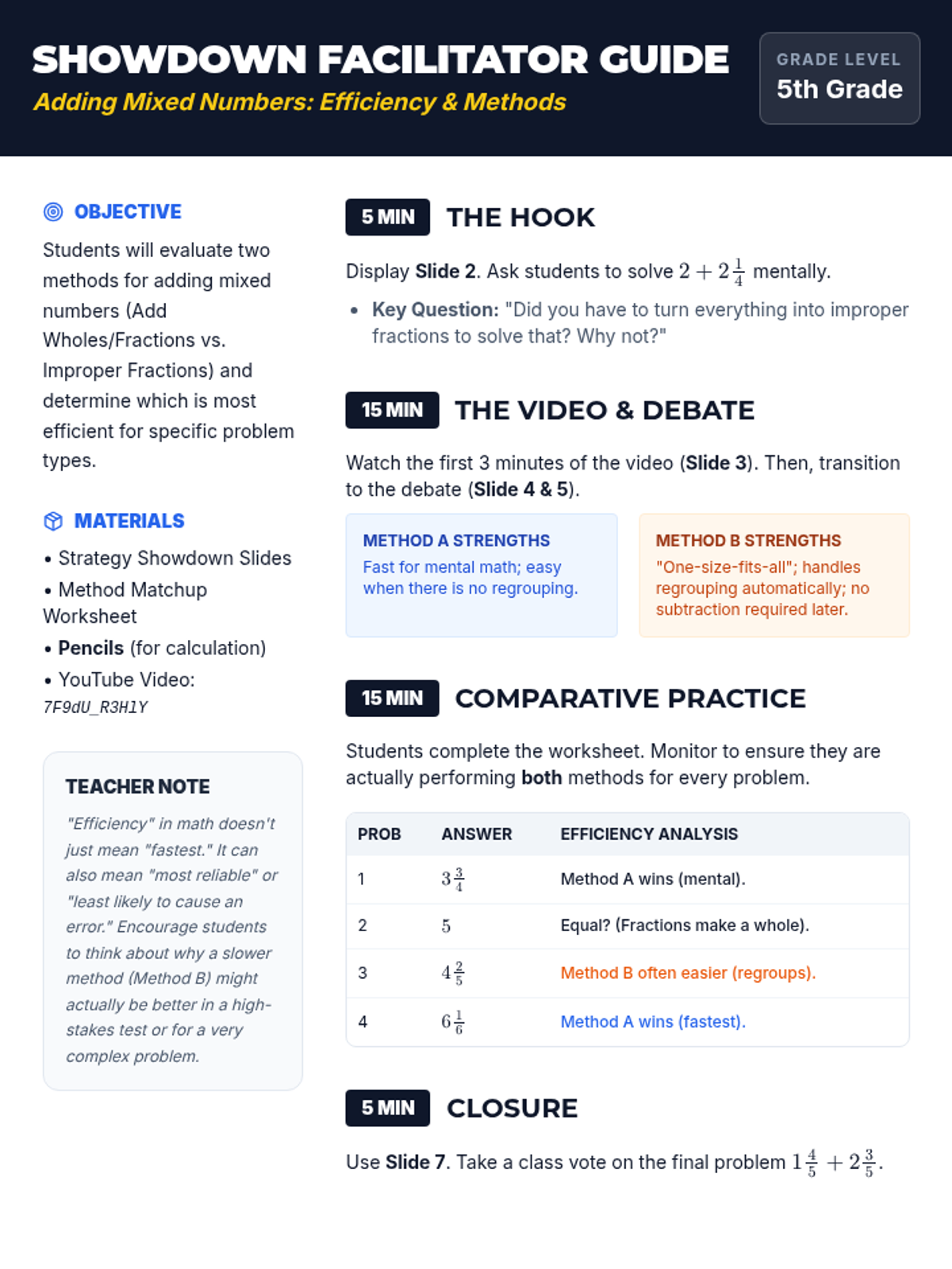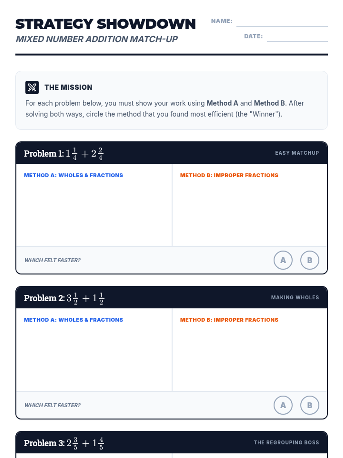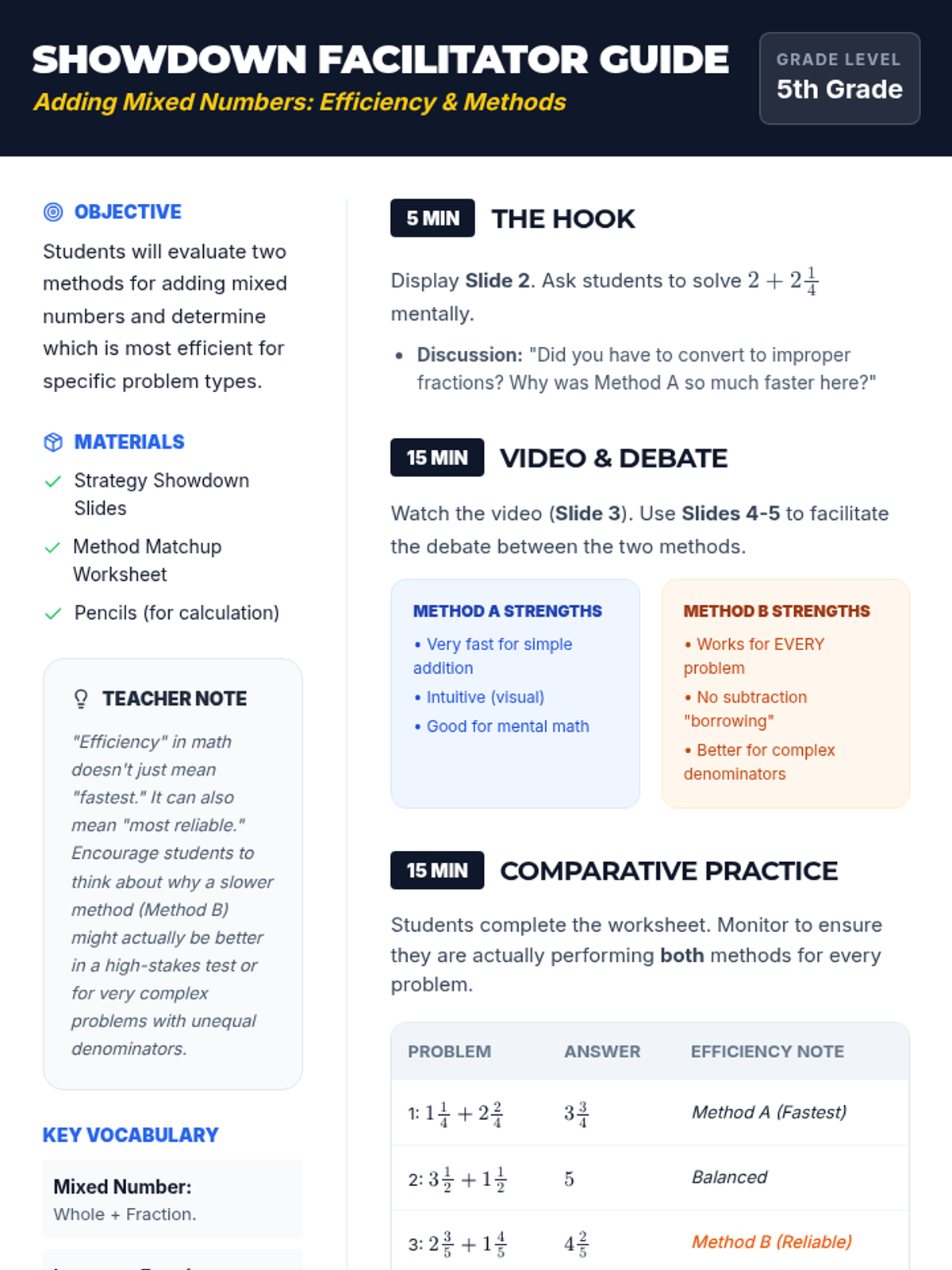 A 5th-grade math lesson where students compare two methods for adding mixed numbers: adding whole numbers/fractions separately versus converting to improper fractions. Students evaluate which strategy is most efficient for different types of problems.