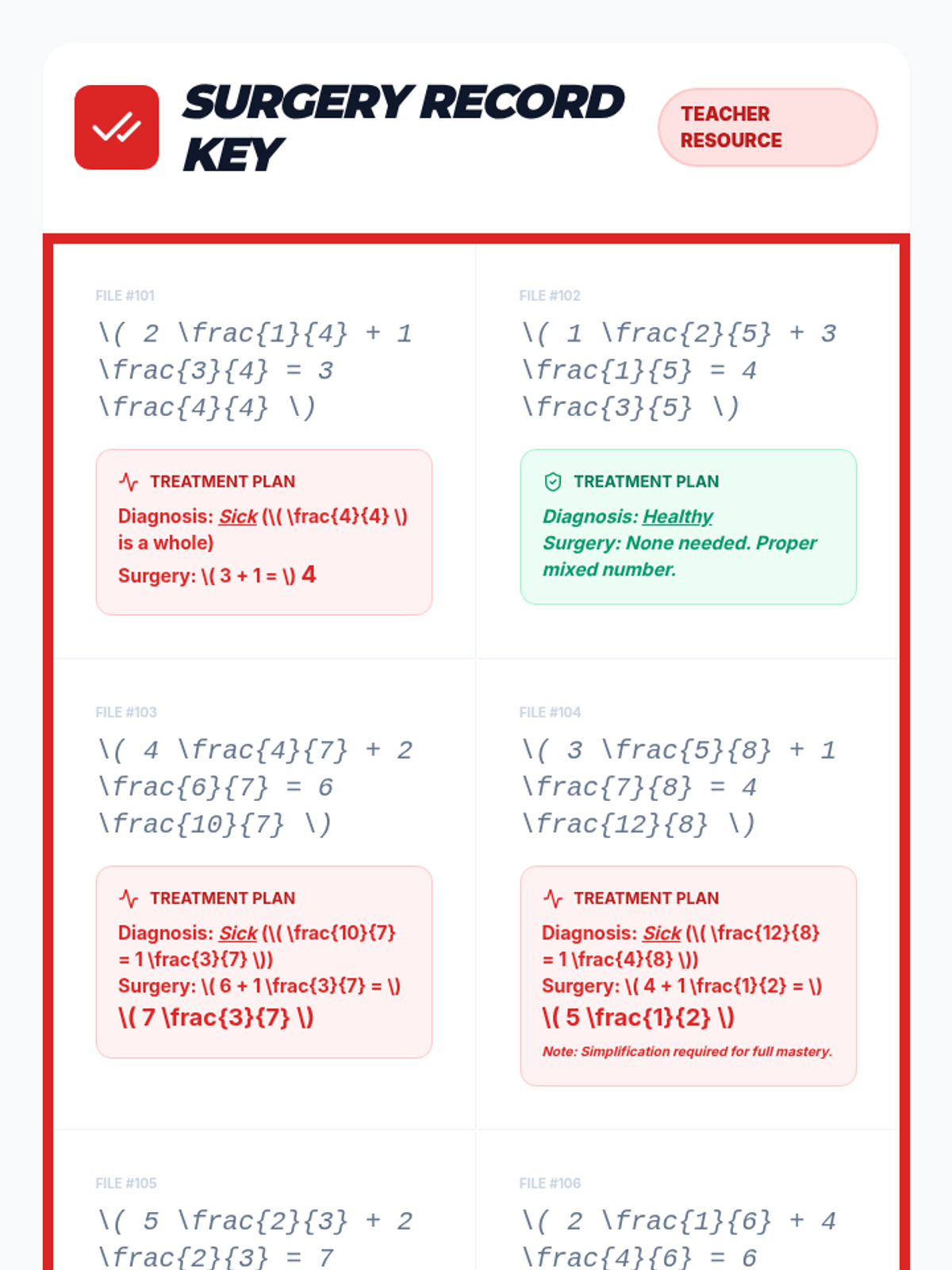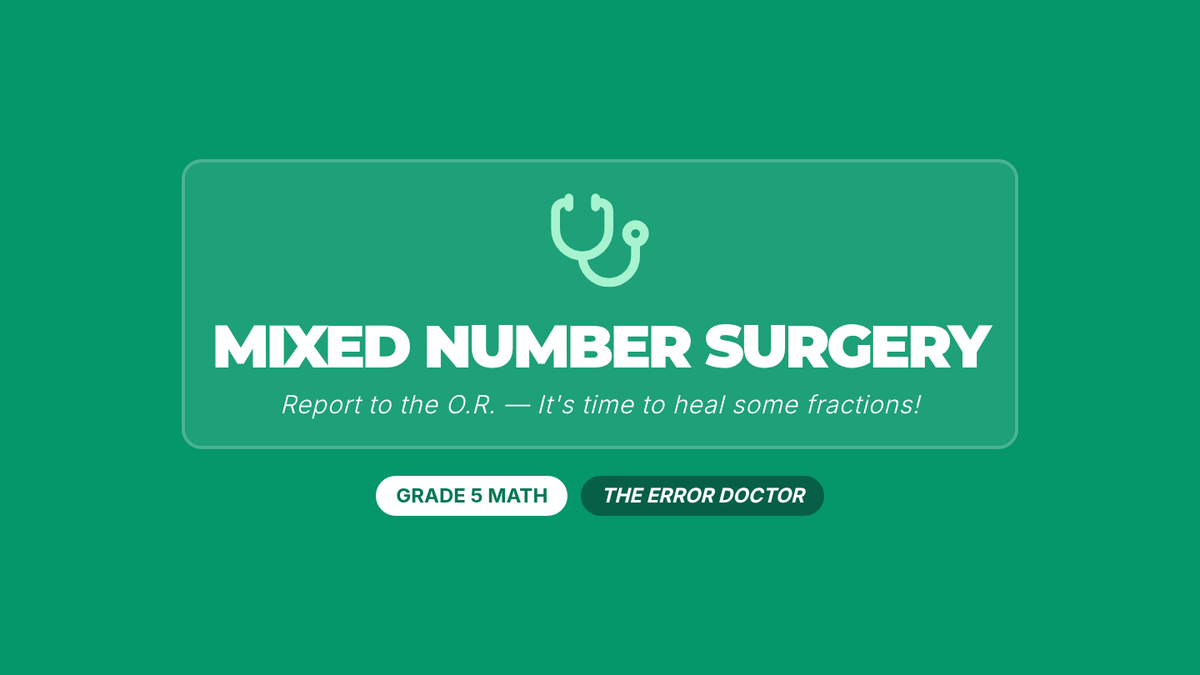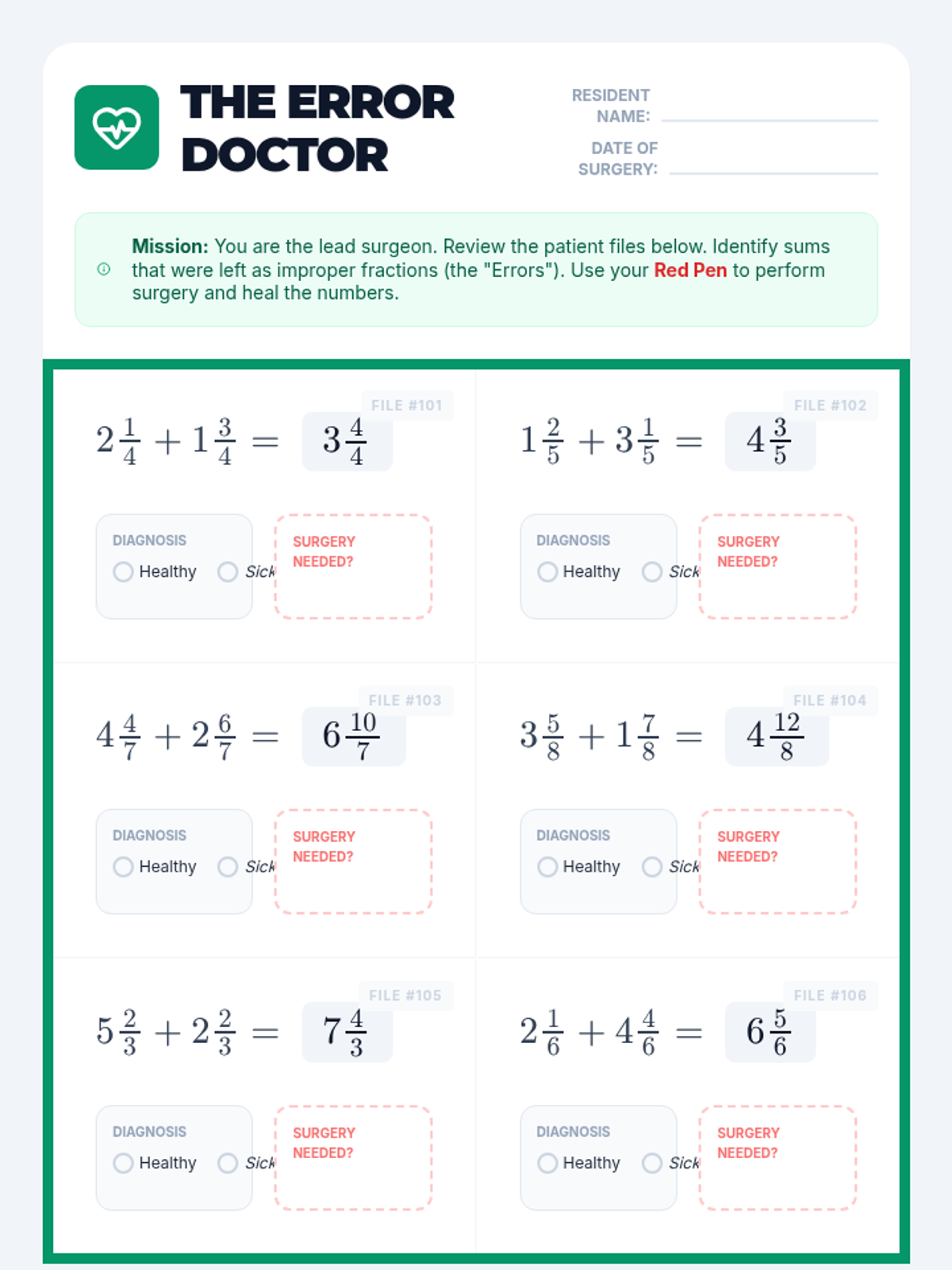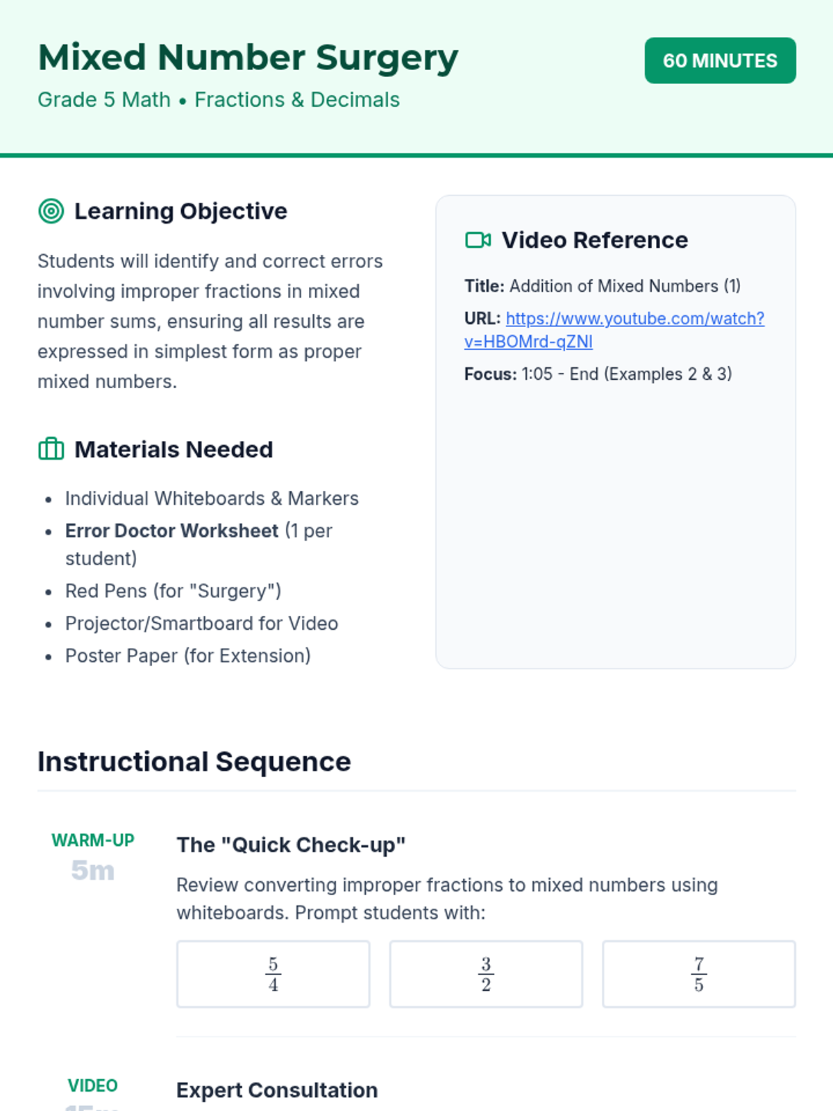 A 5th-grade math lesson focused on identifying and correcting improper fraction remainders in mixed number addition, featuring 'The Error Doctor' activity and a video-led discussion.