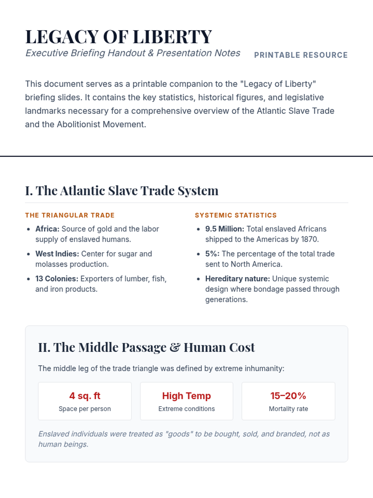 A comprehensive resource bundle for school leaders covering the history of the Atlantic Slave Trade and the Abolitionist Movement, featuring a detailed reference guide and a visual infographic.