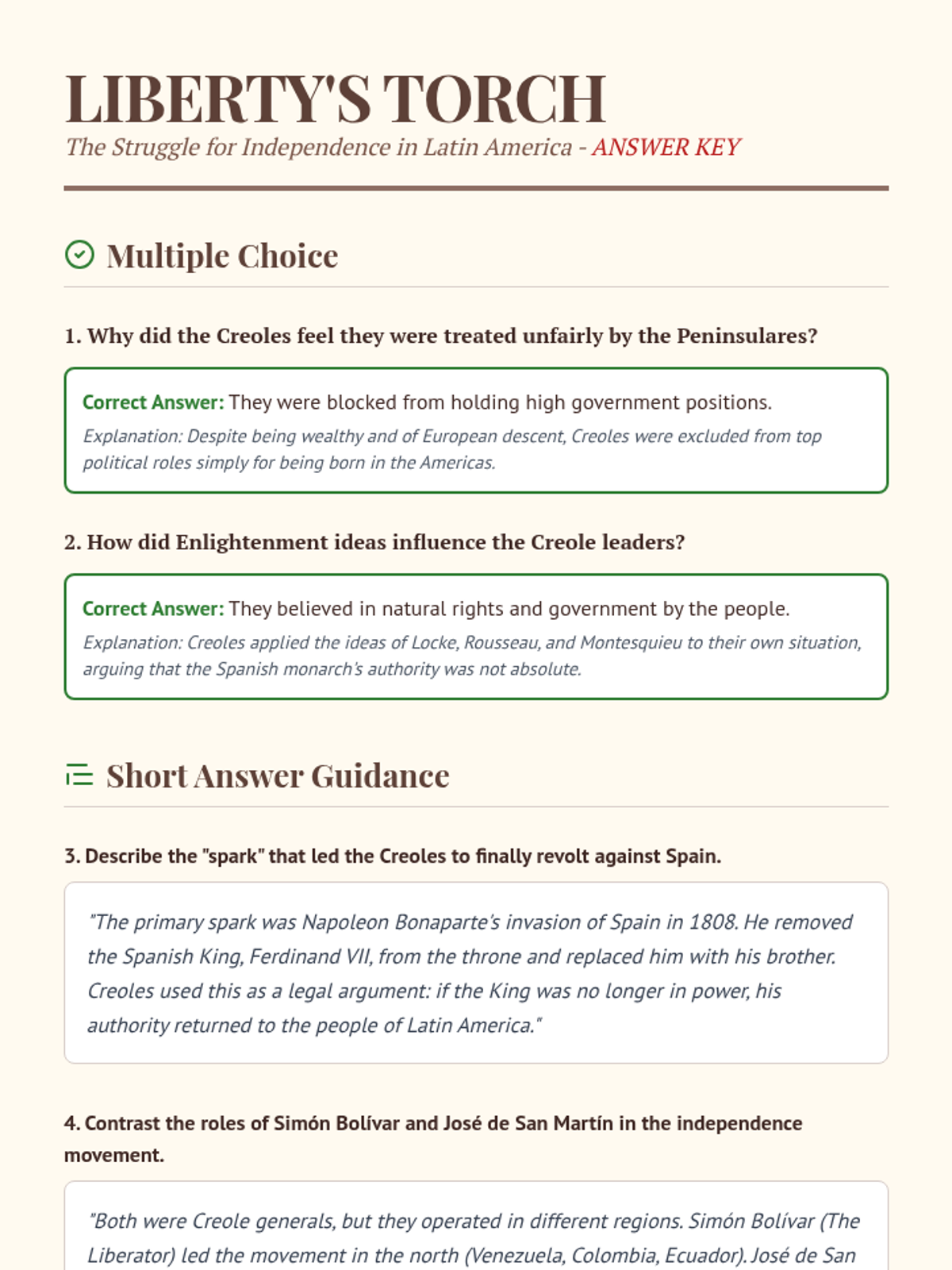 A lesson exploring the social and political causes of Latin American independence movements, with a focus on the leadership of the Creole class and the influence of Enlightenment ideals.