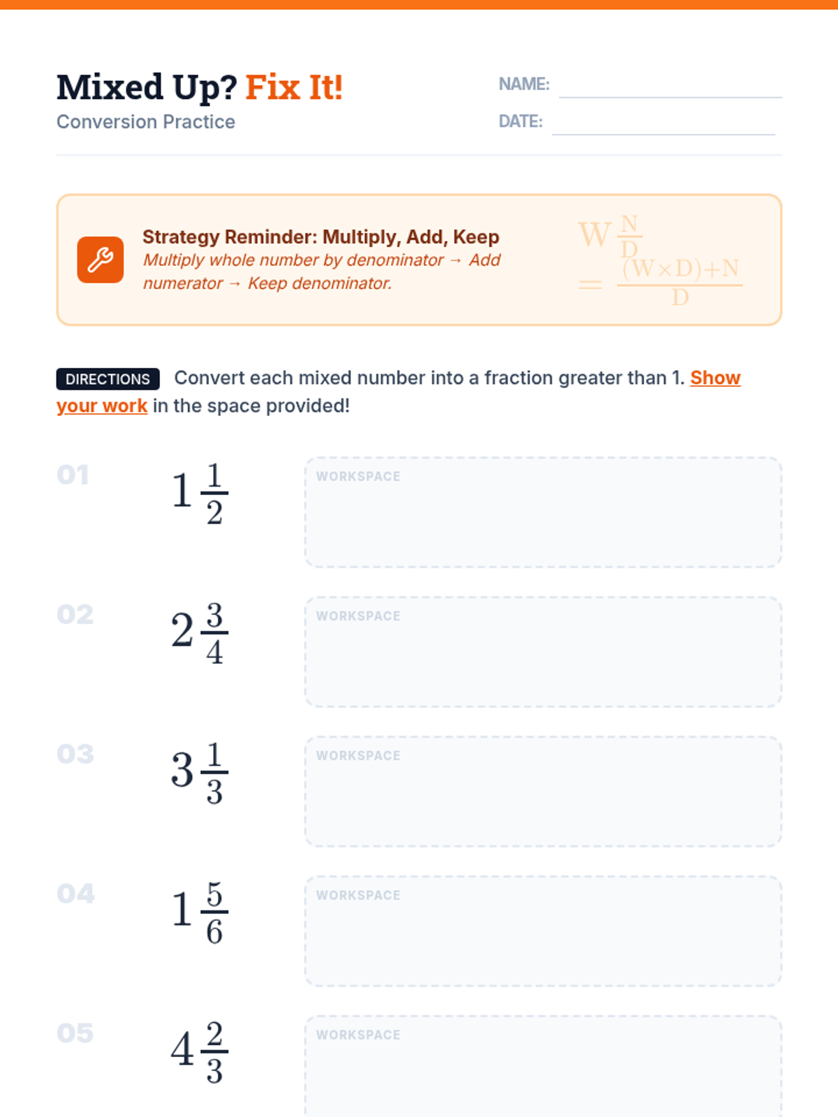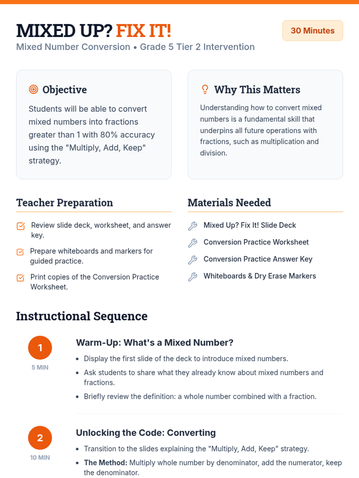 A Tier 2 intervention lesson for 5th grade focused on converting mixed numbers to fractions greater than 1 using the 'Multiply, Add, Keep' strategy.
