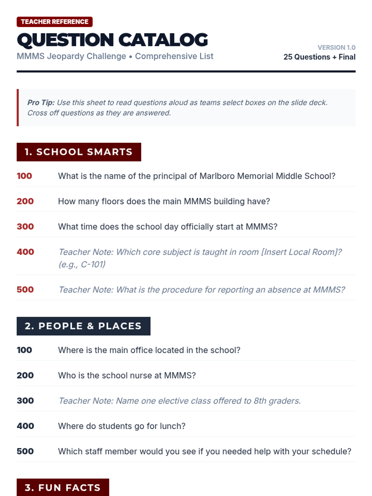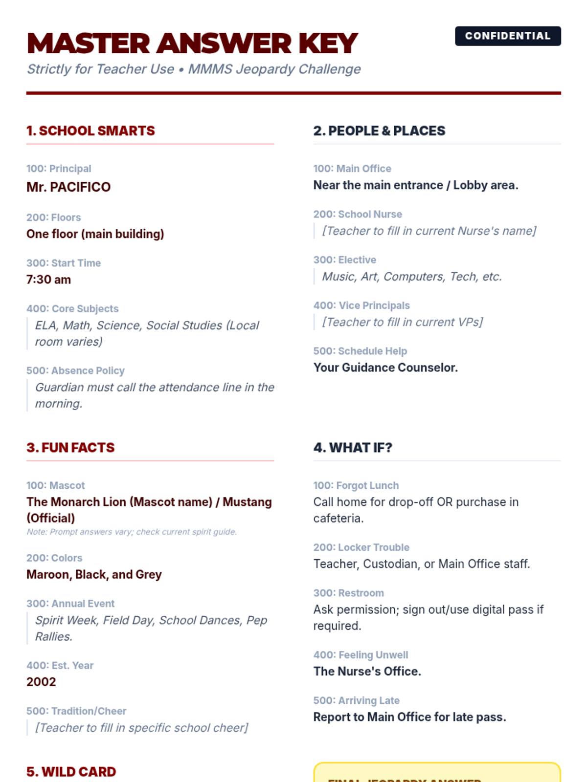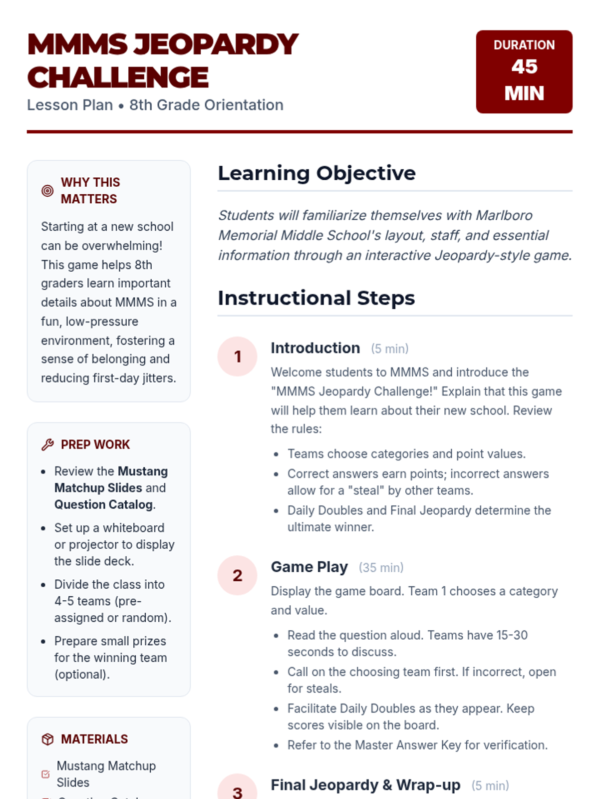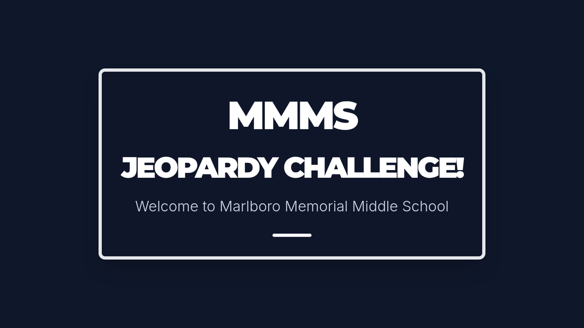 A high-energy, Jeopardy-style orientation game to help 8th-grade students master the routines, staff, and secrets of Marlboro Memorial Middle School.