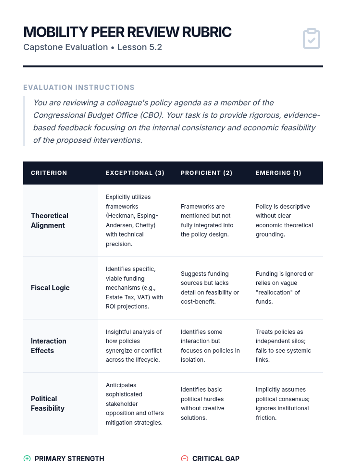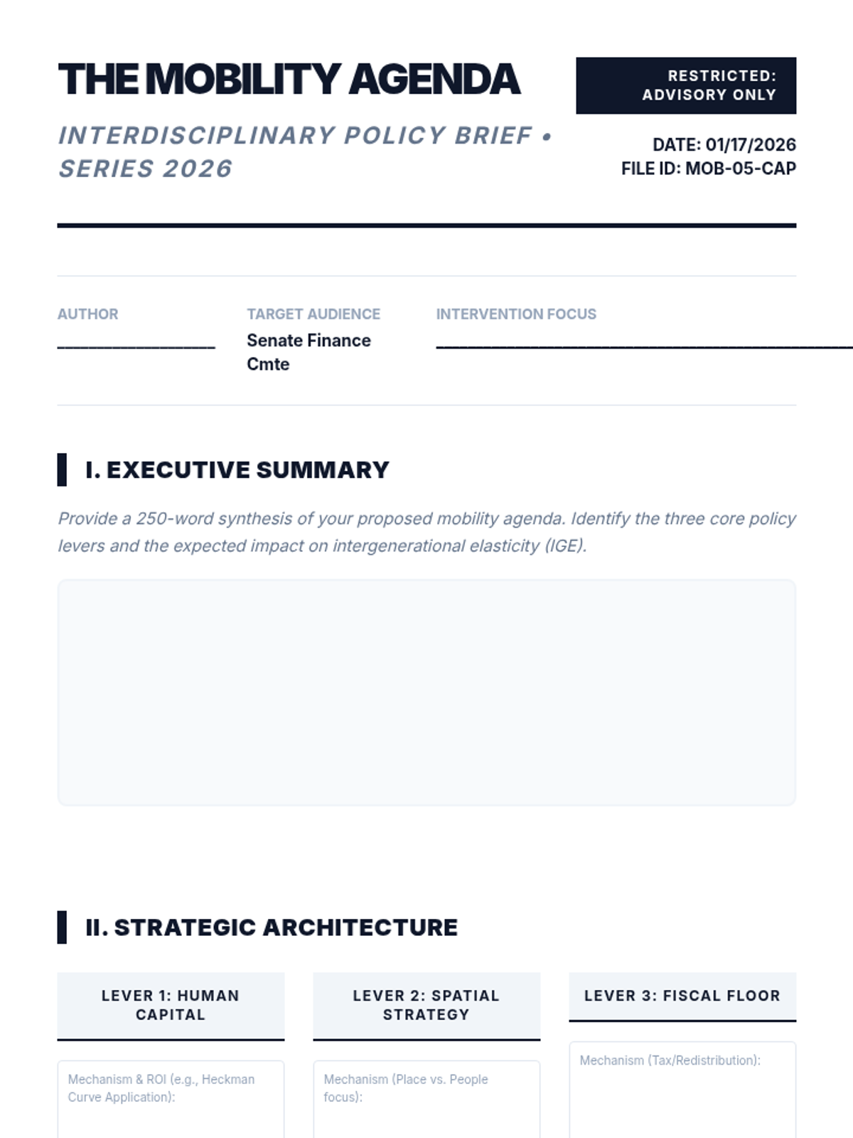 A capstone workshop where students synthesize their learning into a formal policy brief defending a comprehensive mobility agenda.