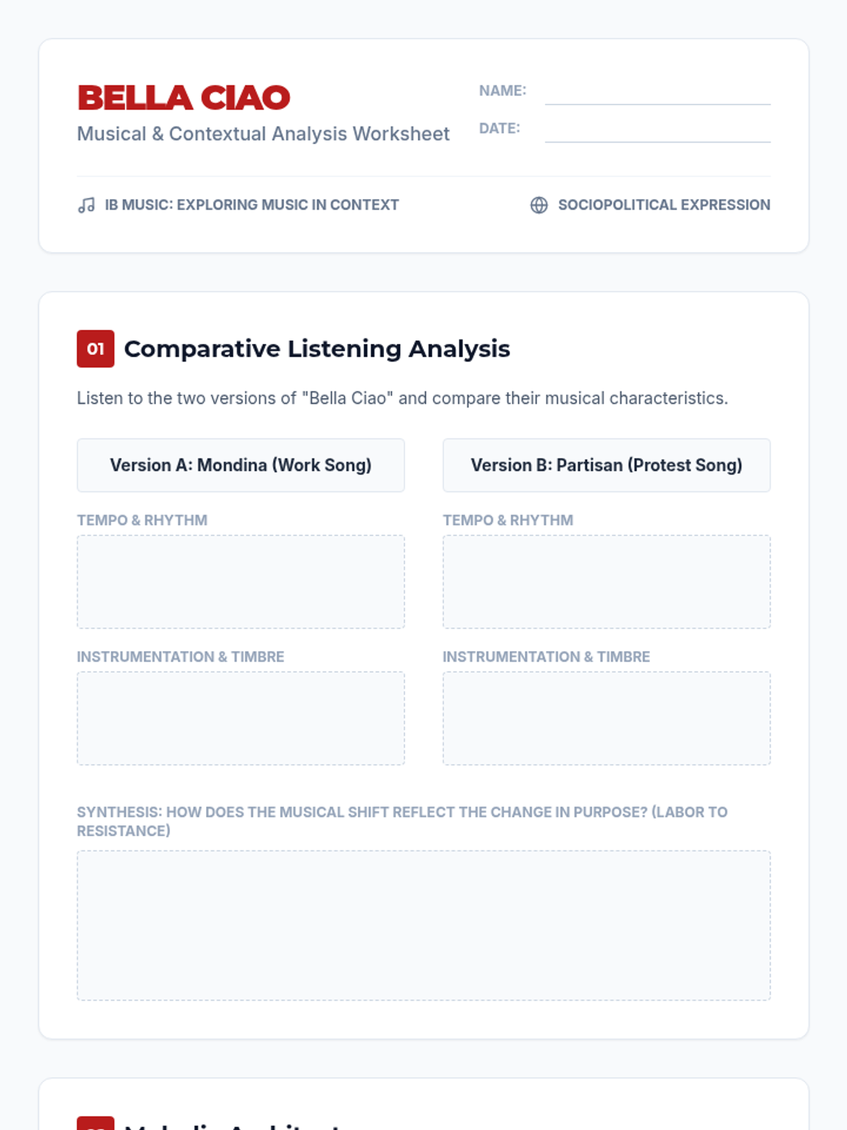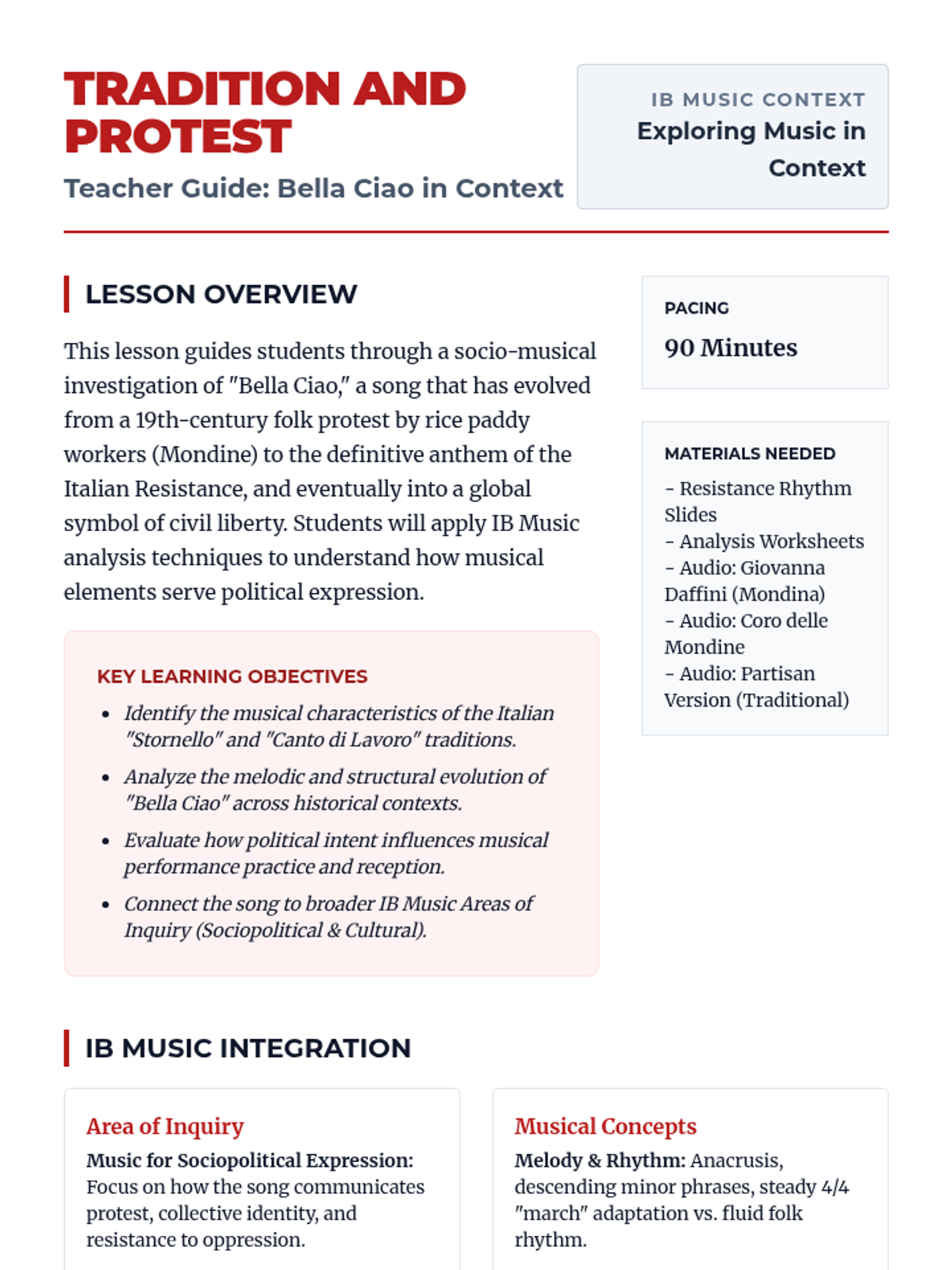 Explore the evolution of 'Bella Ciao' from an Italian folk song of labor to a global anthem of resistance. Students analyze its musical characteristics and socio-political impact through the lens of IB Music's Exploring Music in Context.